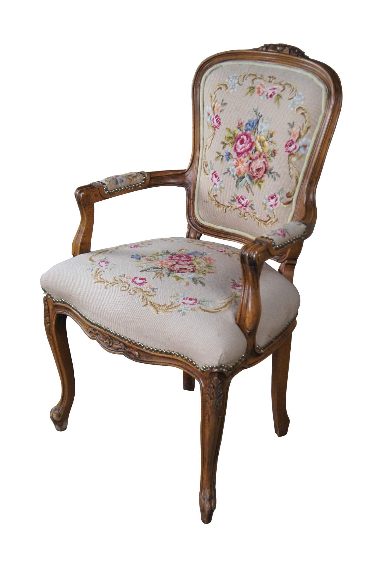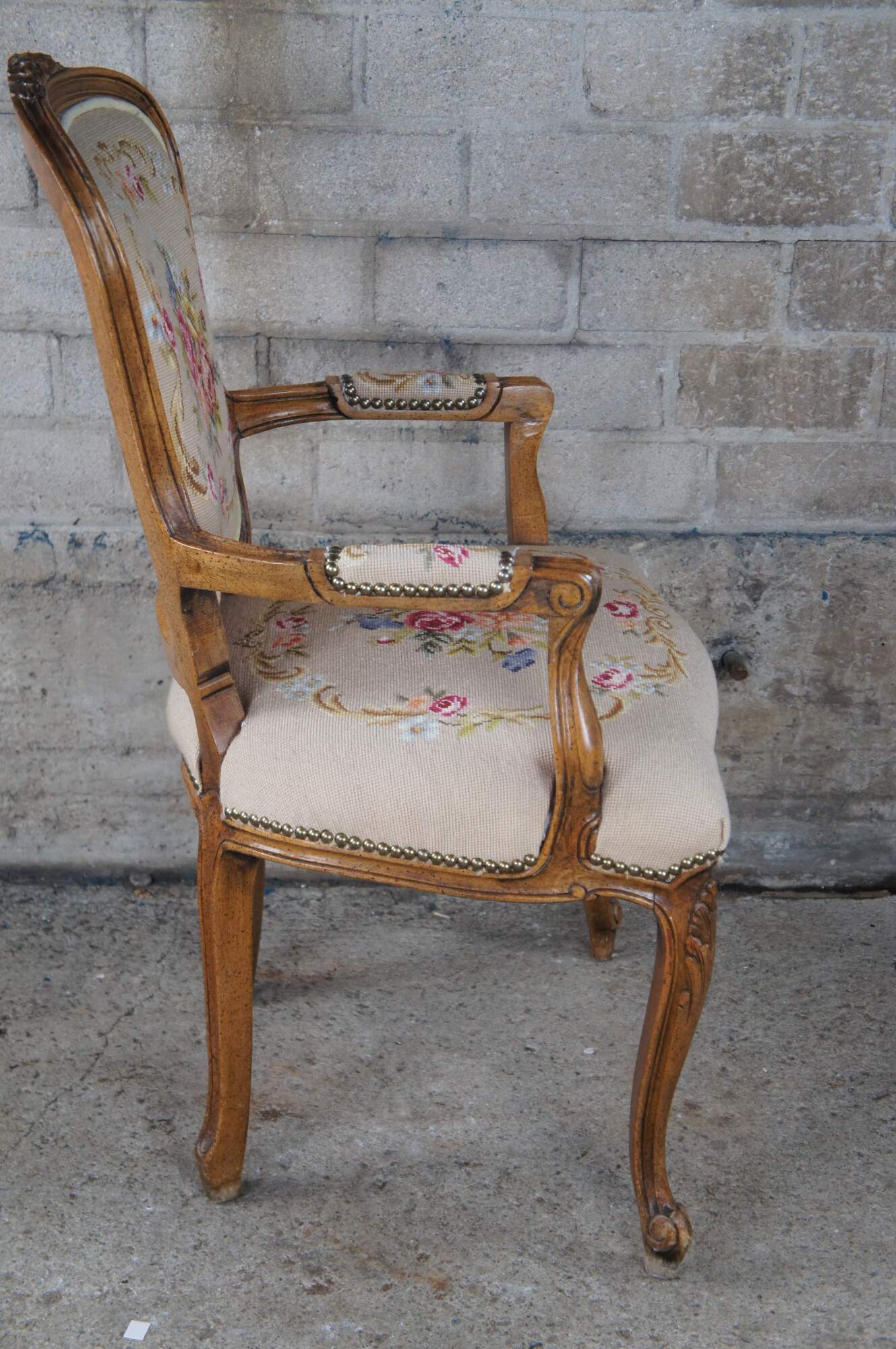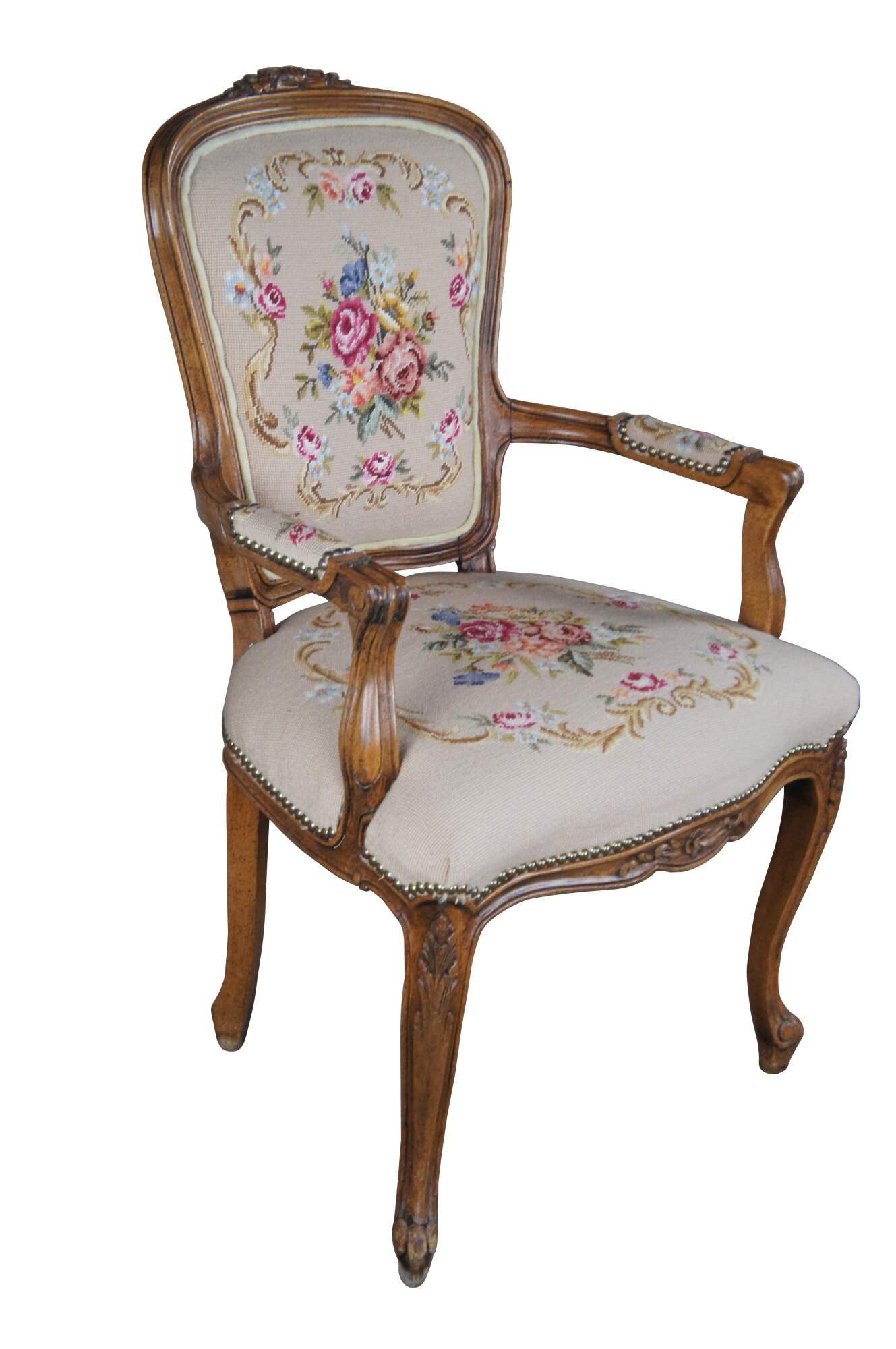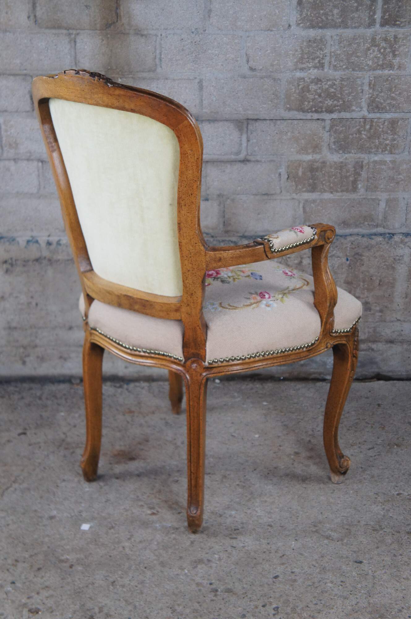Vintage French Provincial Louis XV style dining armchair featuring a distressed walnut finish with serpentine, floral and acanthus design, embroidered needlepoint upholstery, and nailhead trim.