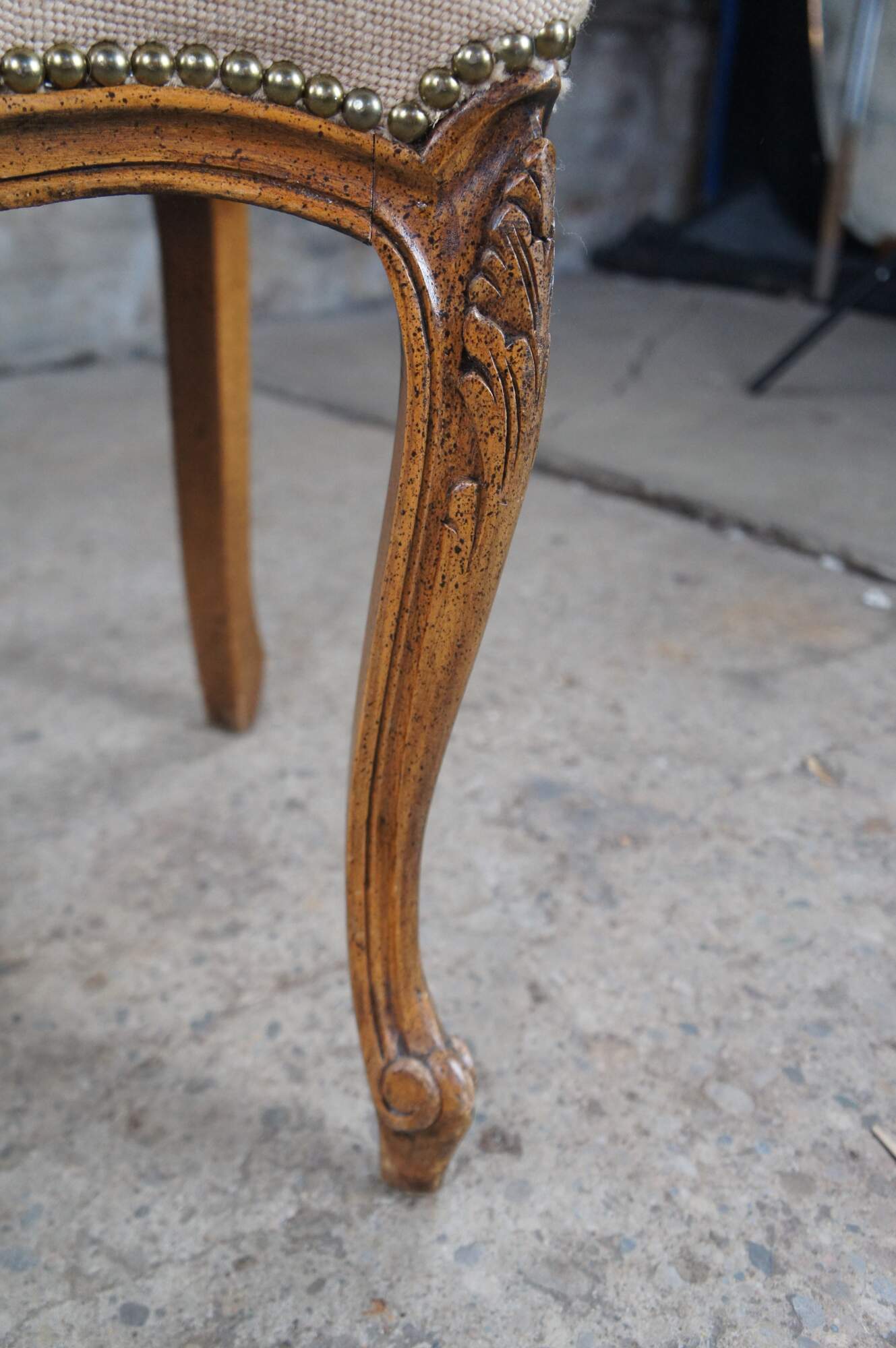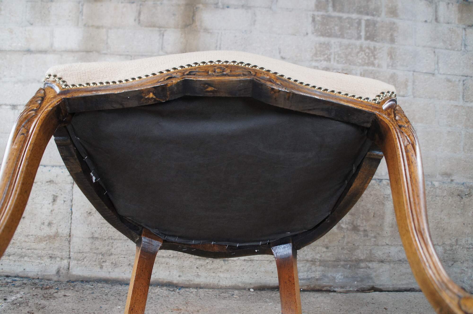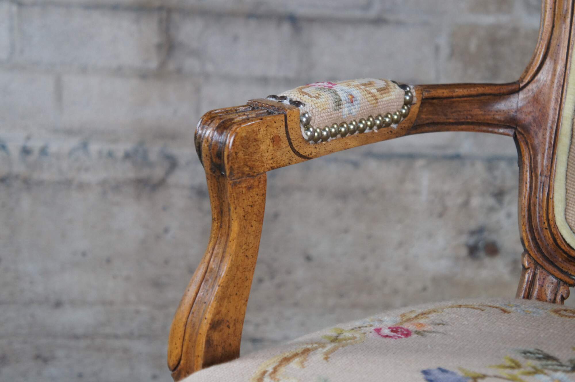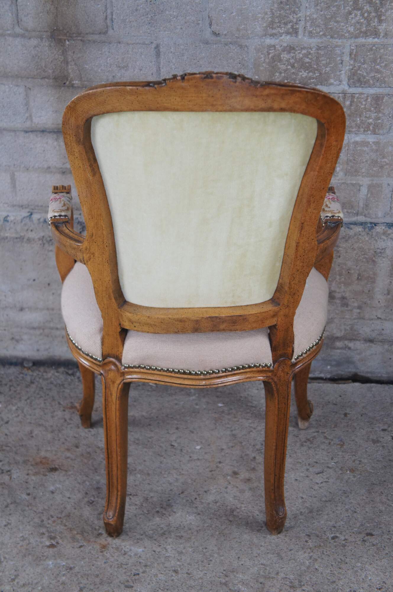 Vintage French Provincial Louis XV style dining armchair featuring a distressed walnut finish with serpentine, floral and acanthus design, embroidered needlepoint upholstery, and nailhead trim.