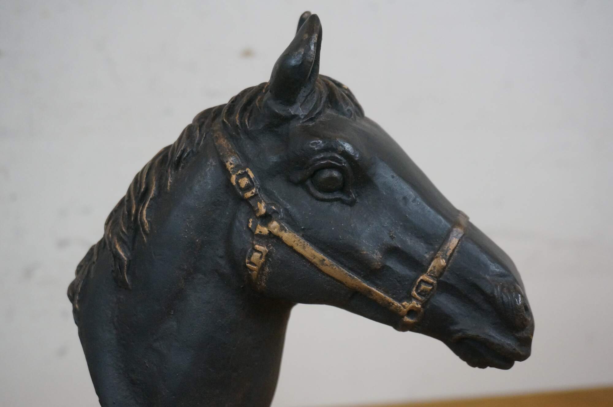 Pair of late 20th century black cast iron bookends in the shape of horse heads on square bases, with lightly gilded bridles.