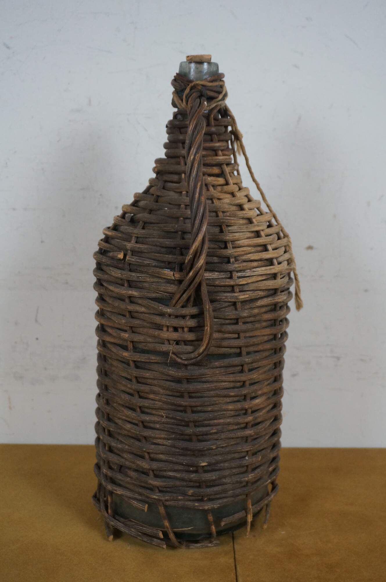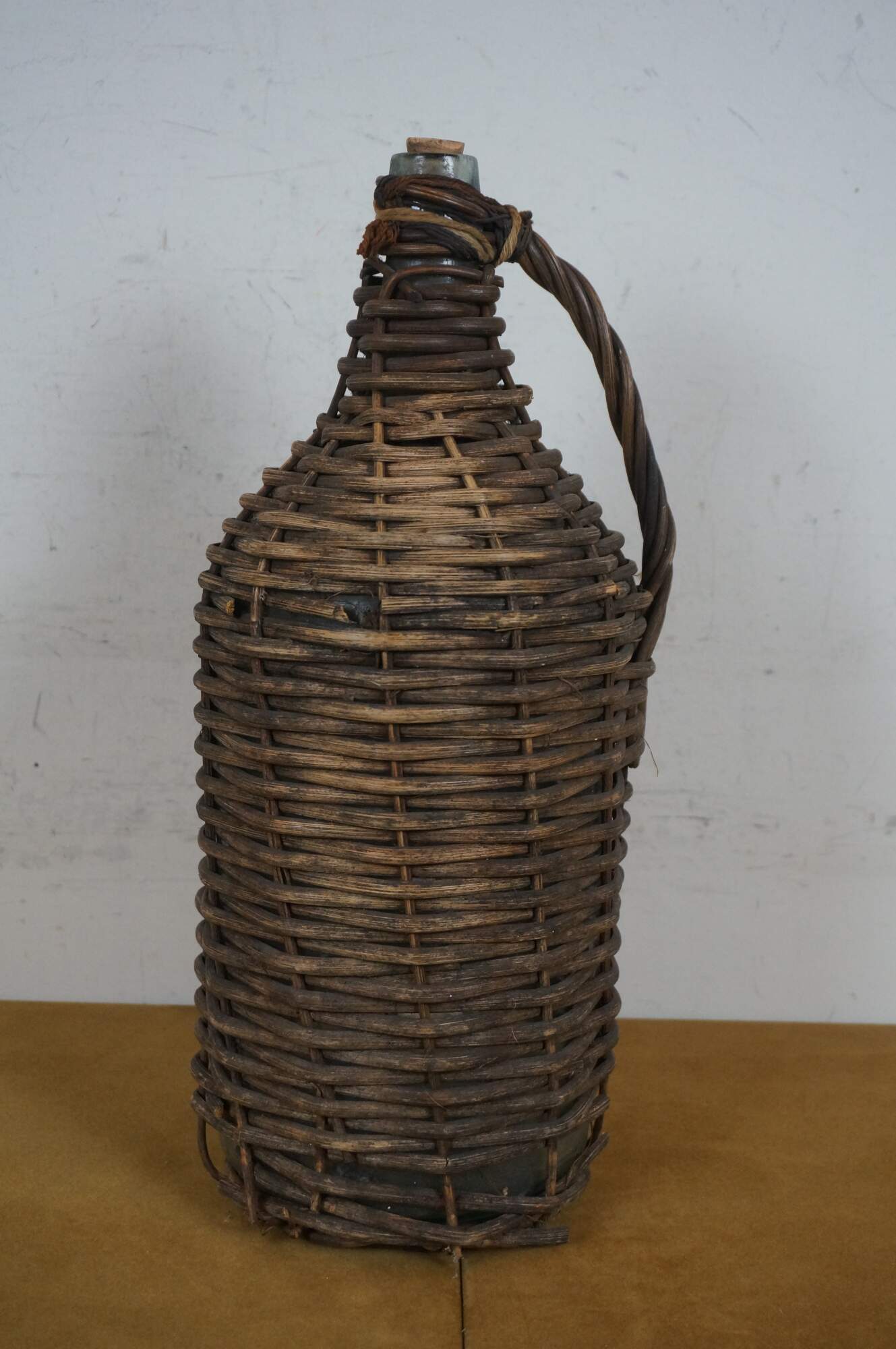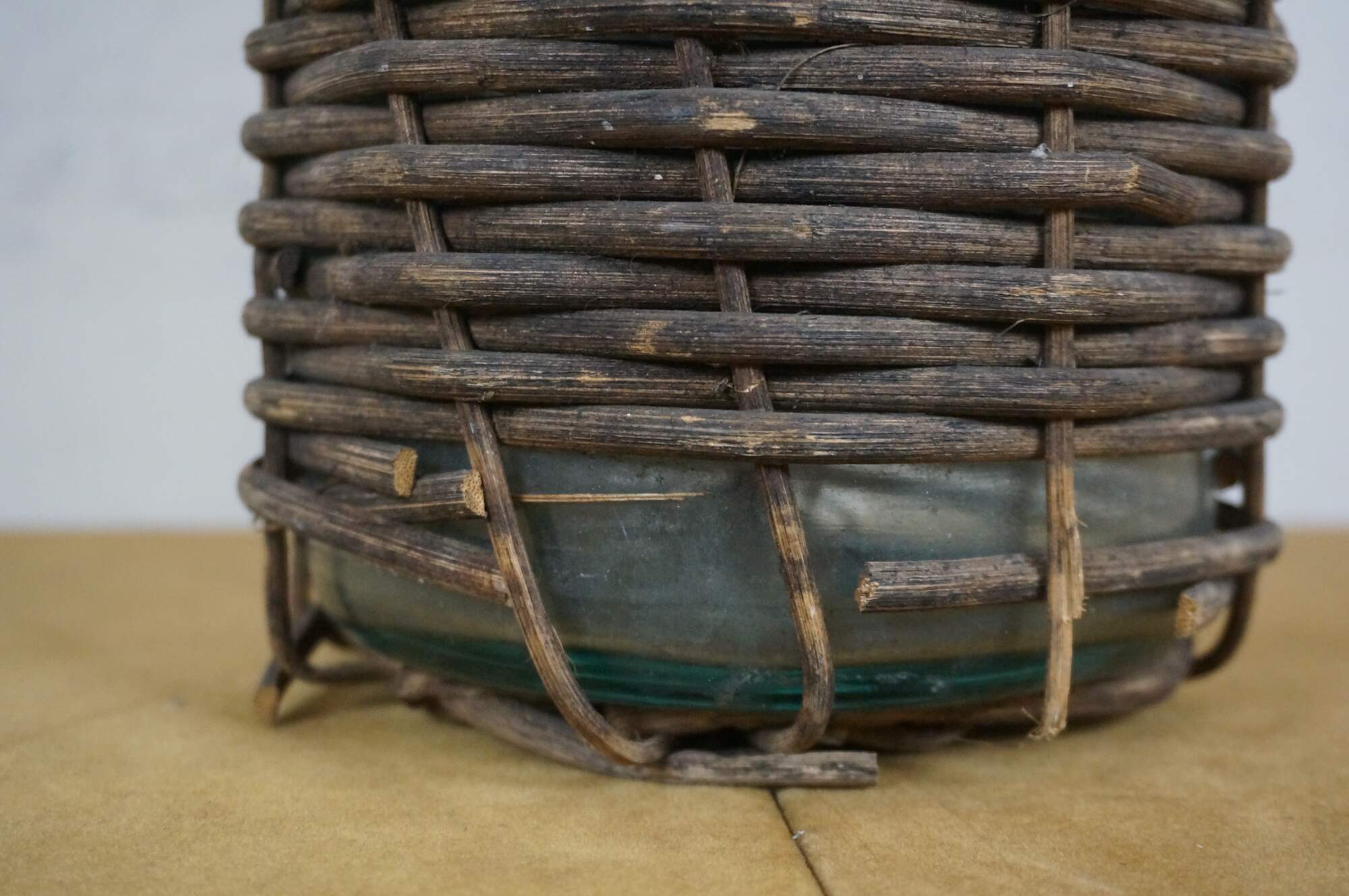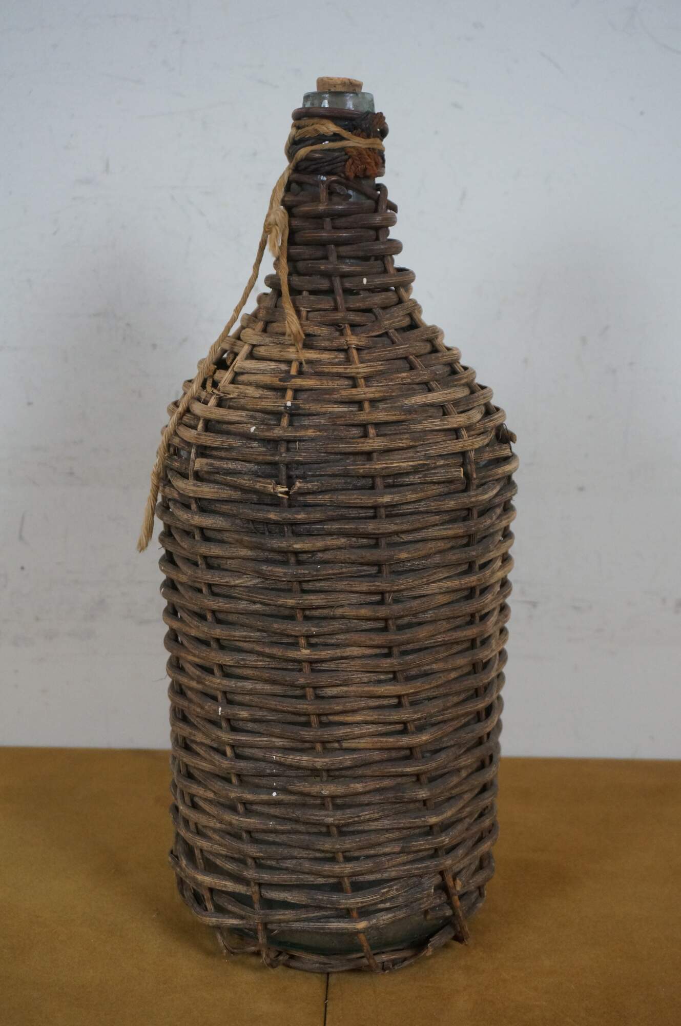 Antique Wicker Wrapped Green Glass Demijohn Carboy Wine Bottle Jug 16"