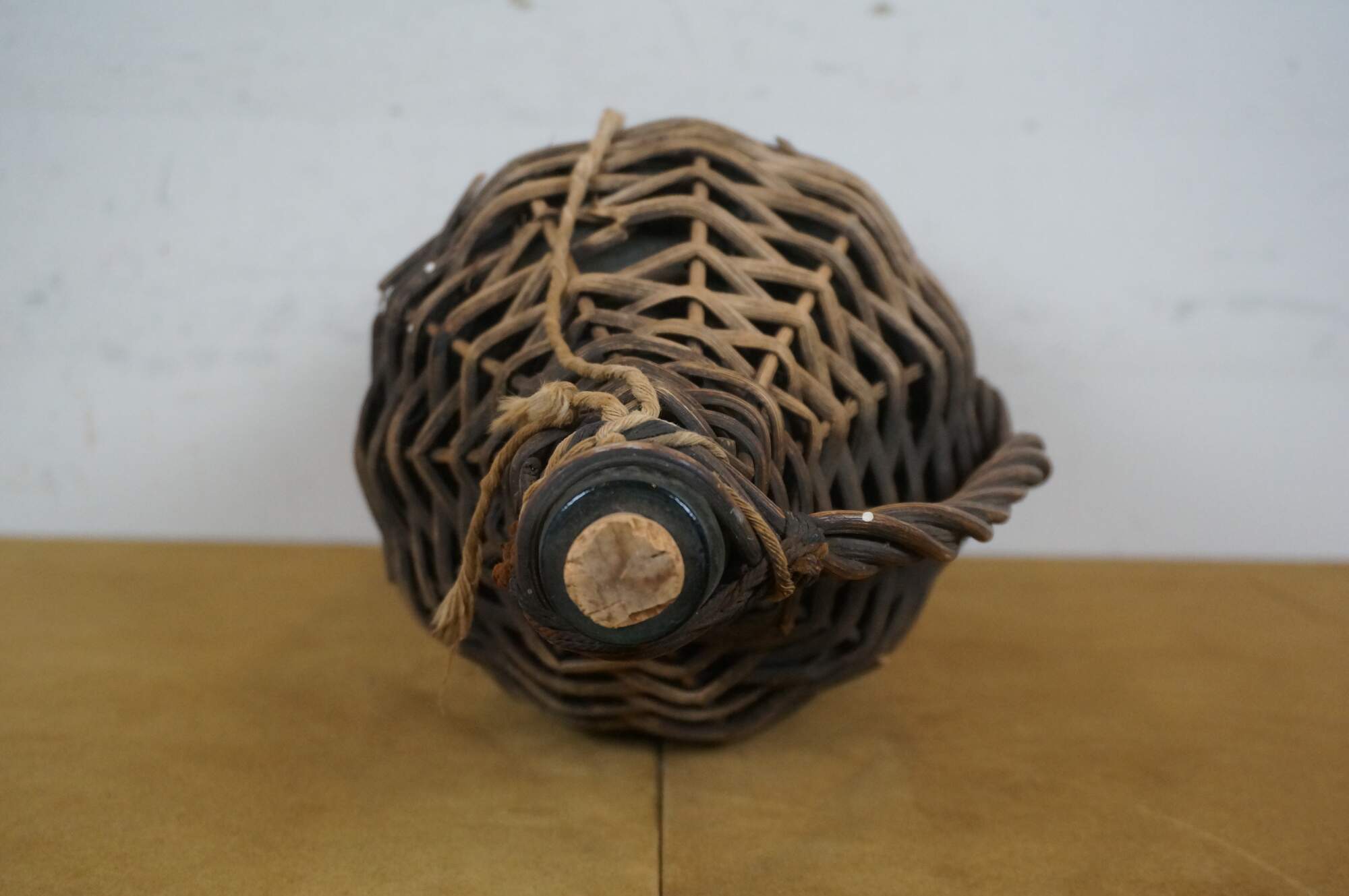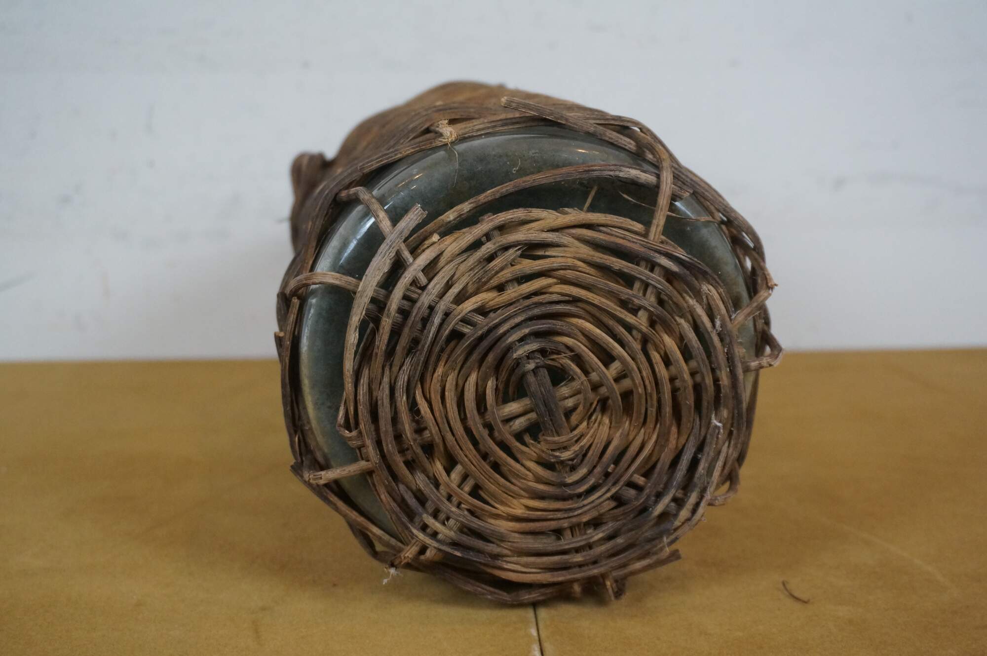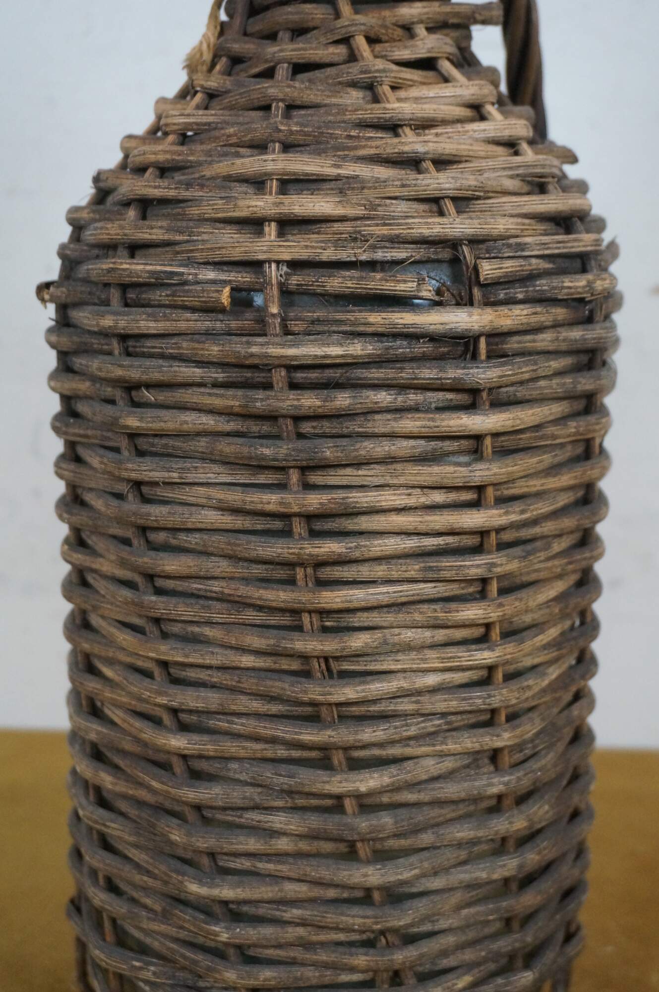 Early 20th century green glass demijohn wine bottle, wrapped in woven wicker with a braided handle.