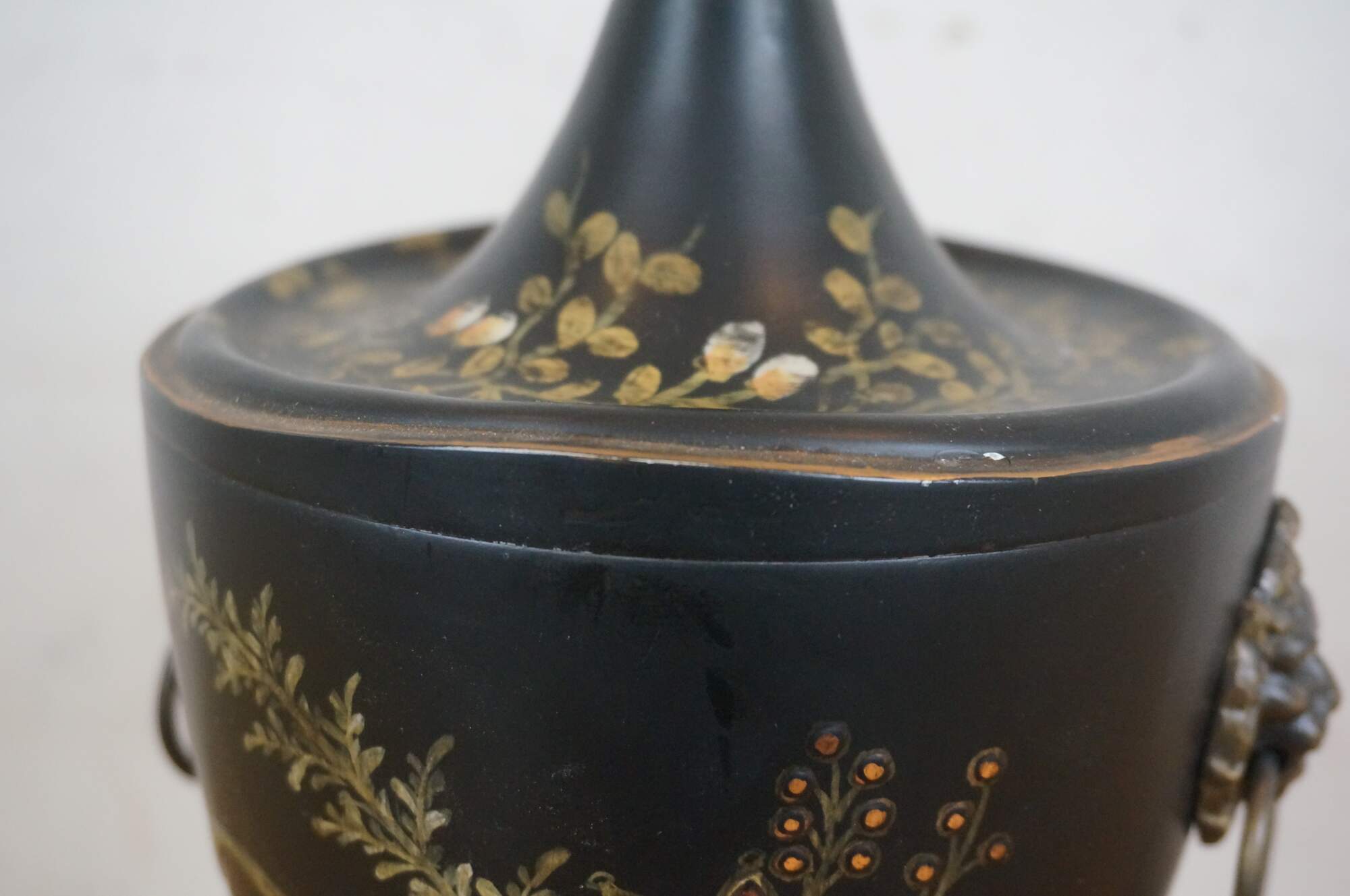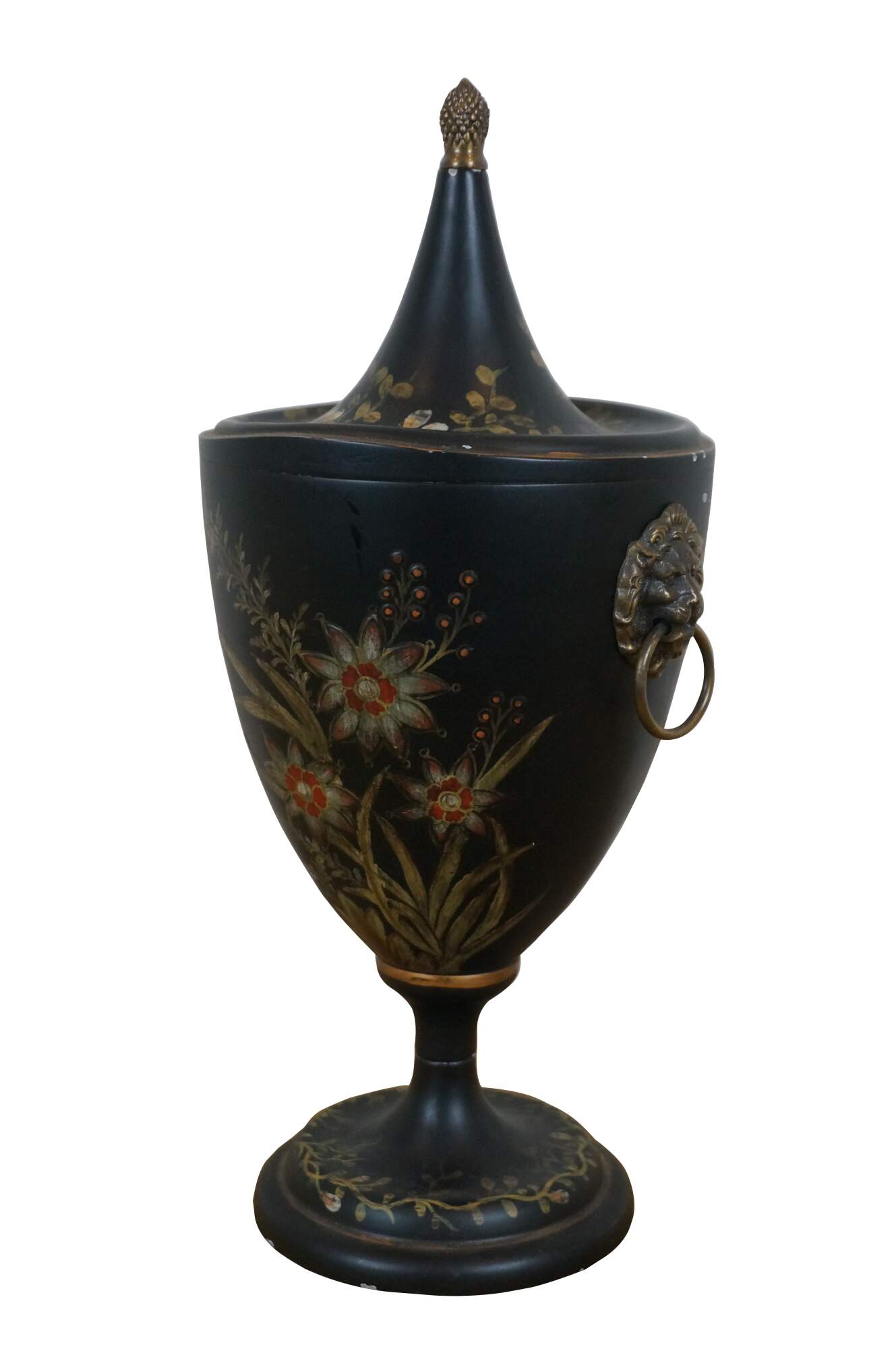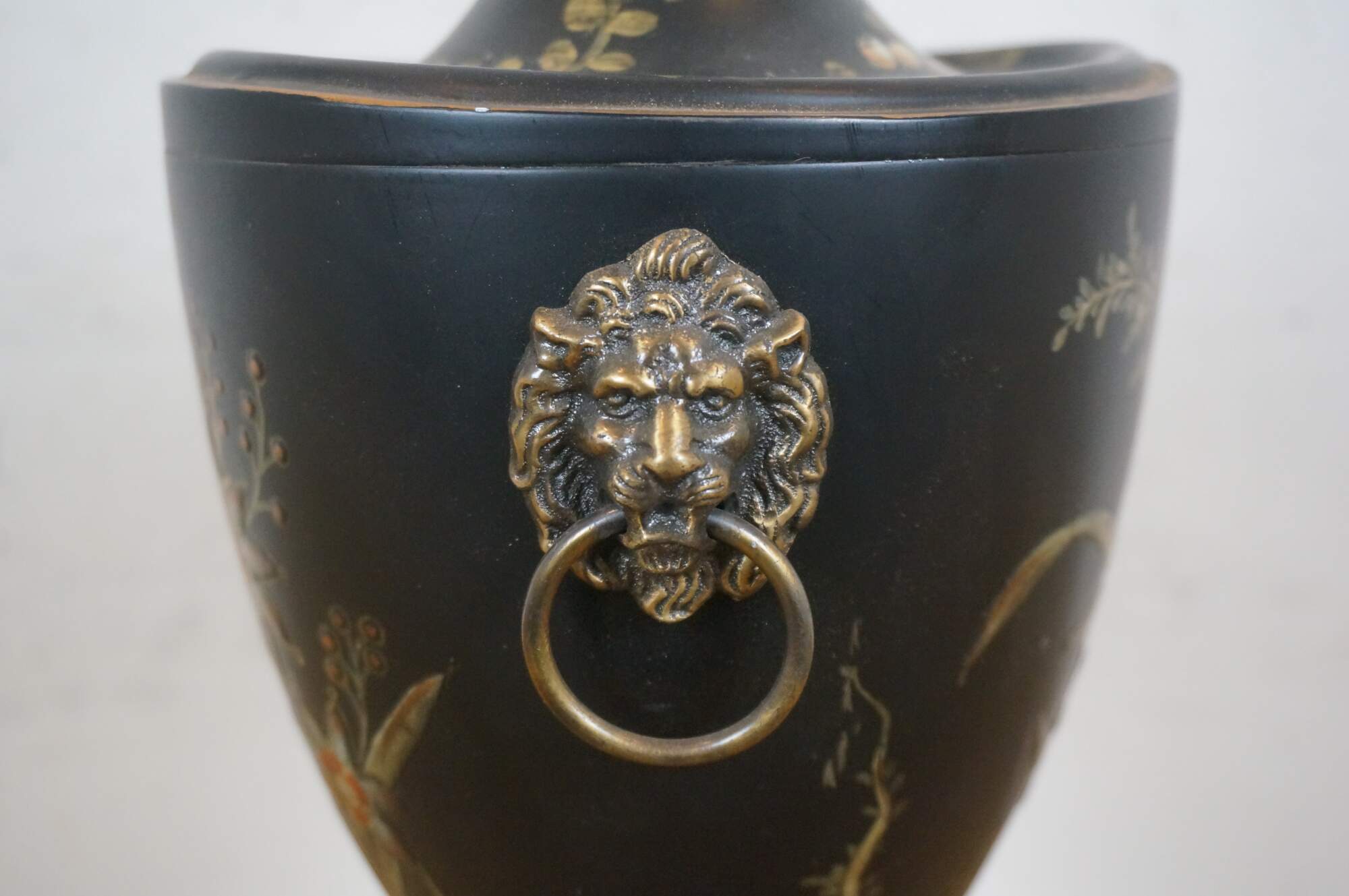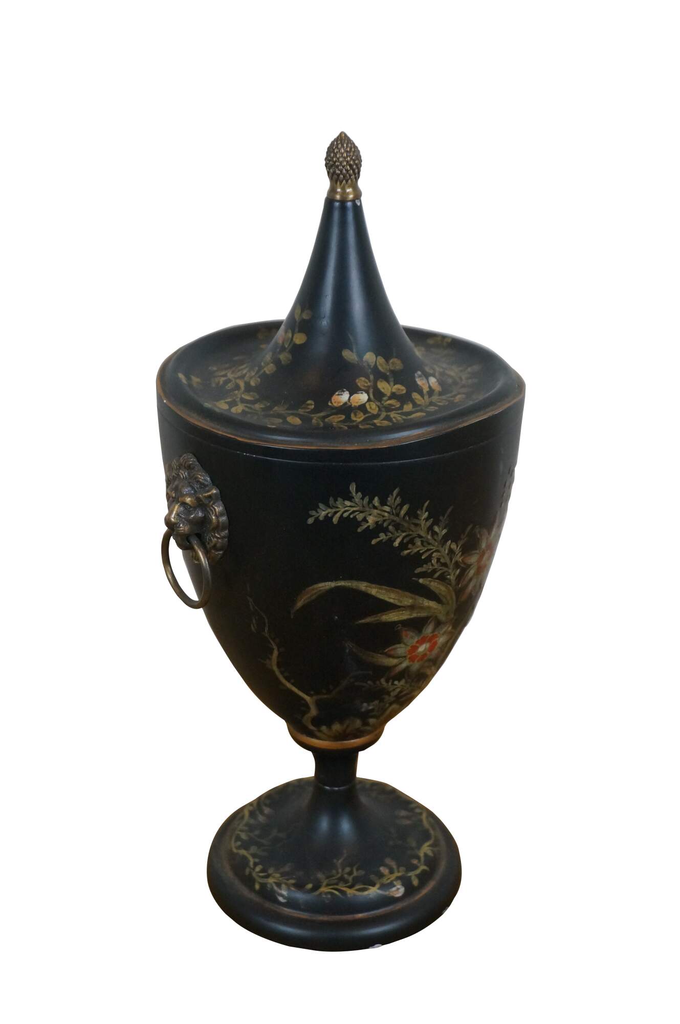 Late 20th century black painted tole ware chestnut mantel urn, painted with foliate and floral designs in gold, white and red. Two lion's head handles, pineapple finial.