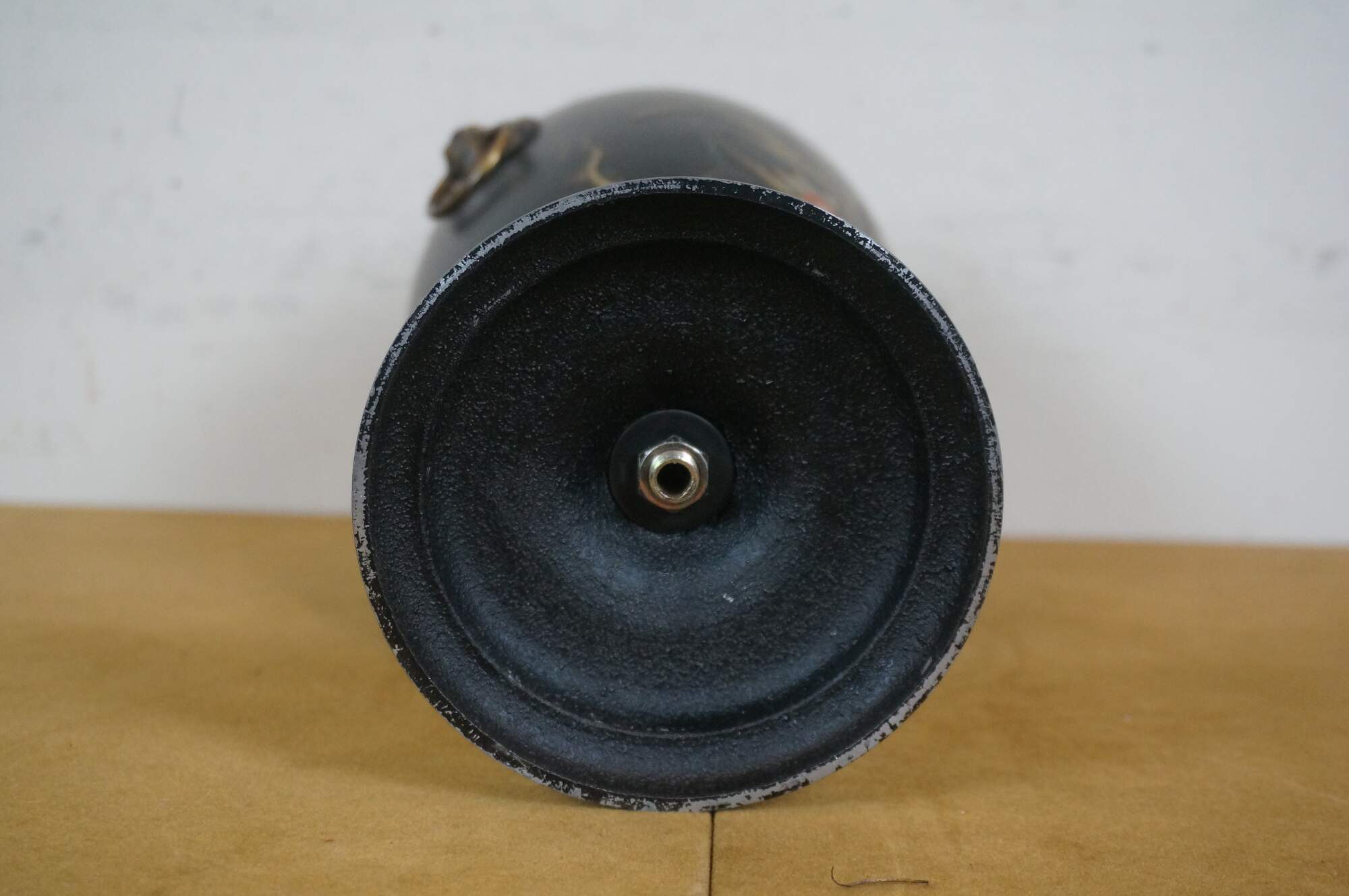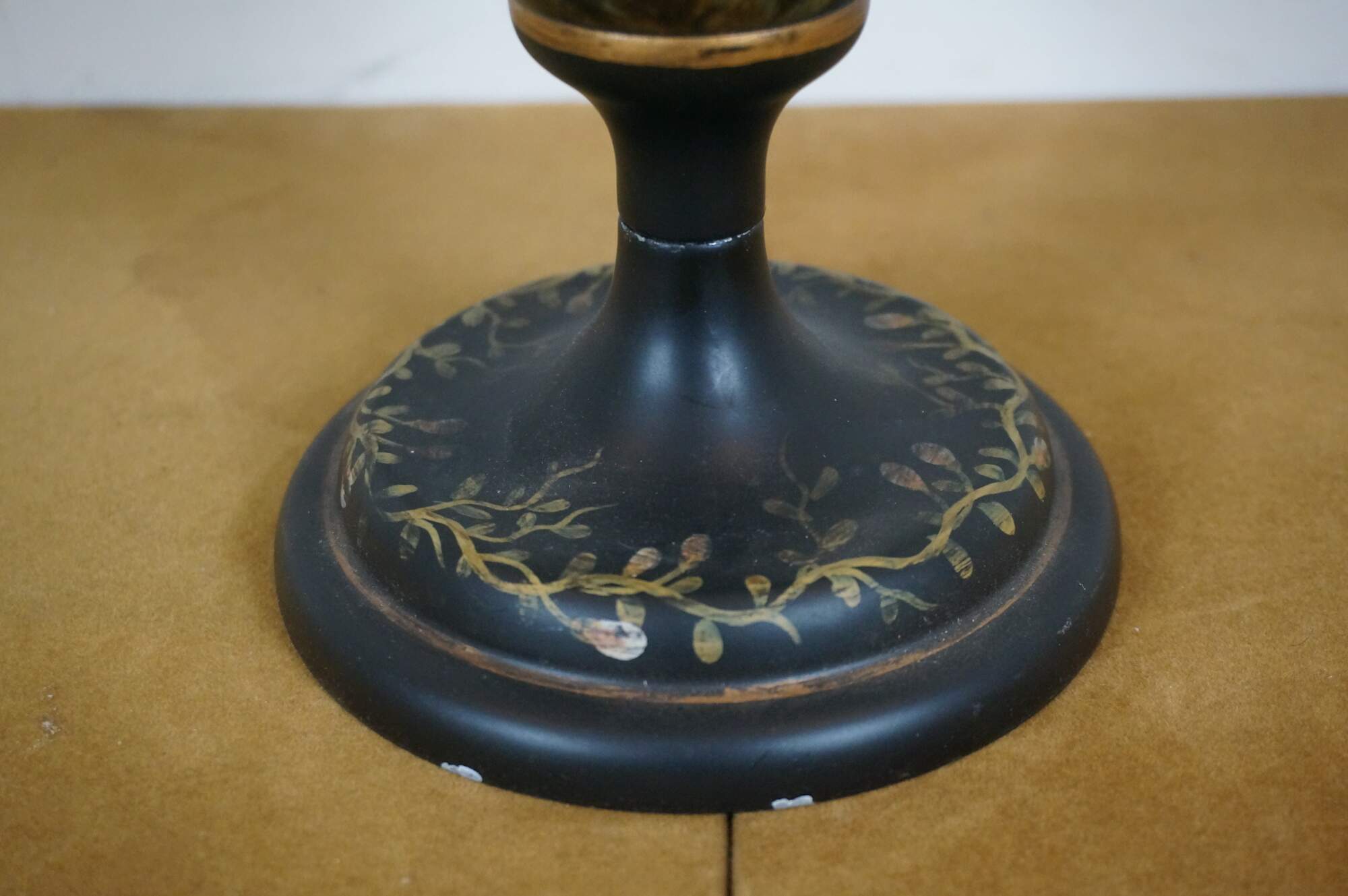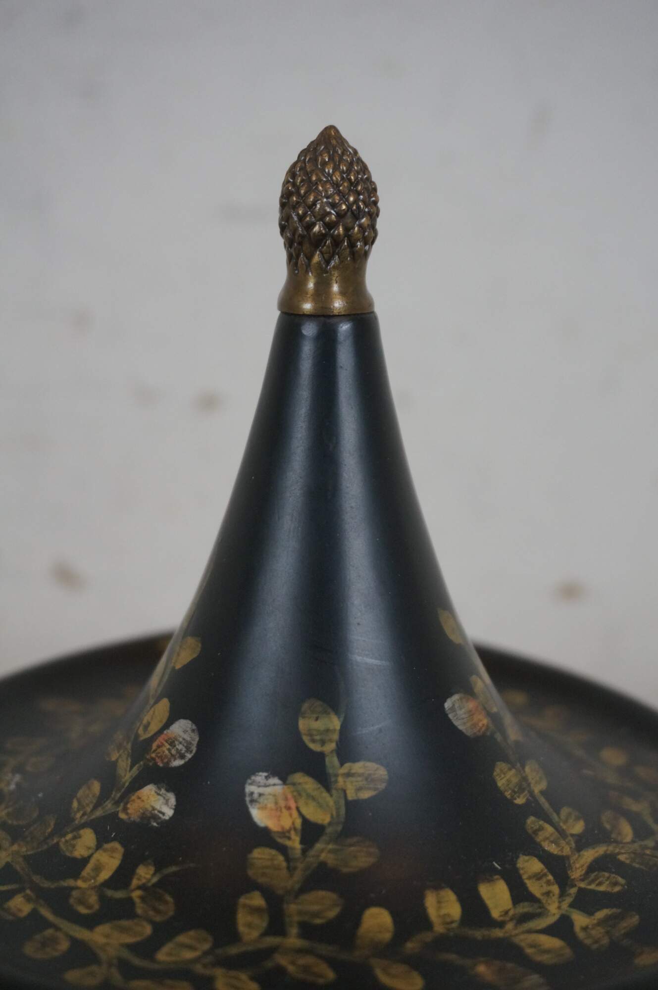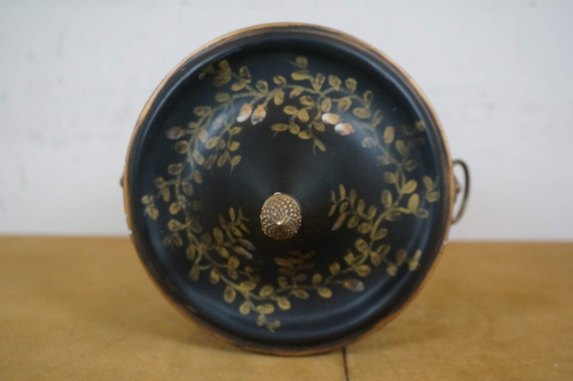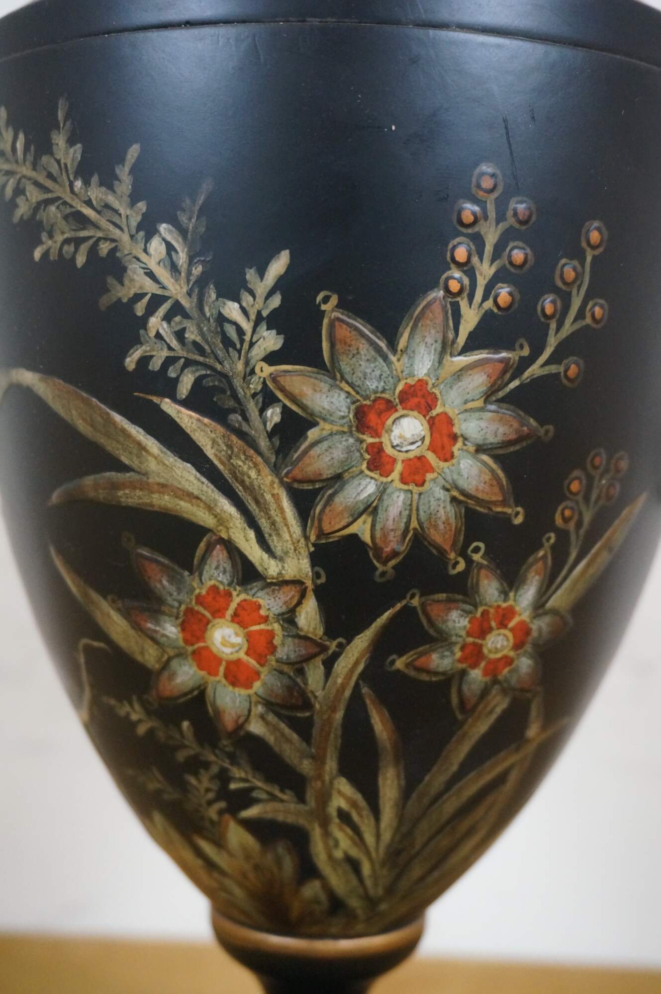 Late 20th century black painted tole ware chestnut mantel urn, painted with foliate and floral designs in gold, white and red. Two lion's head handles, pineapple finial.