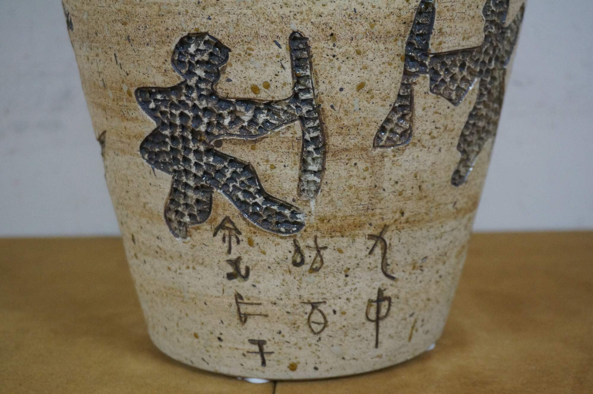 Late 20th century Chinese earthenware pottery vase by Ming Jia. Features a rustic finish with etched calligraphy and a variety of semi-abstract human figures. Incised mark on base.
