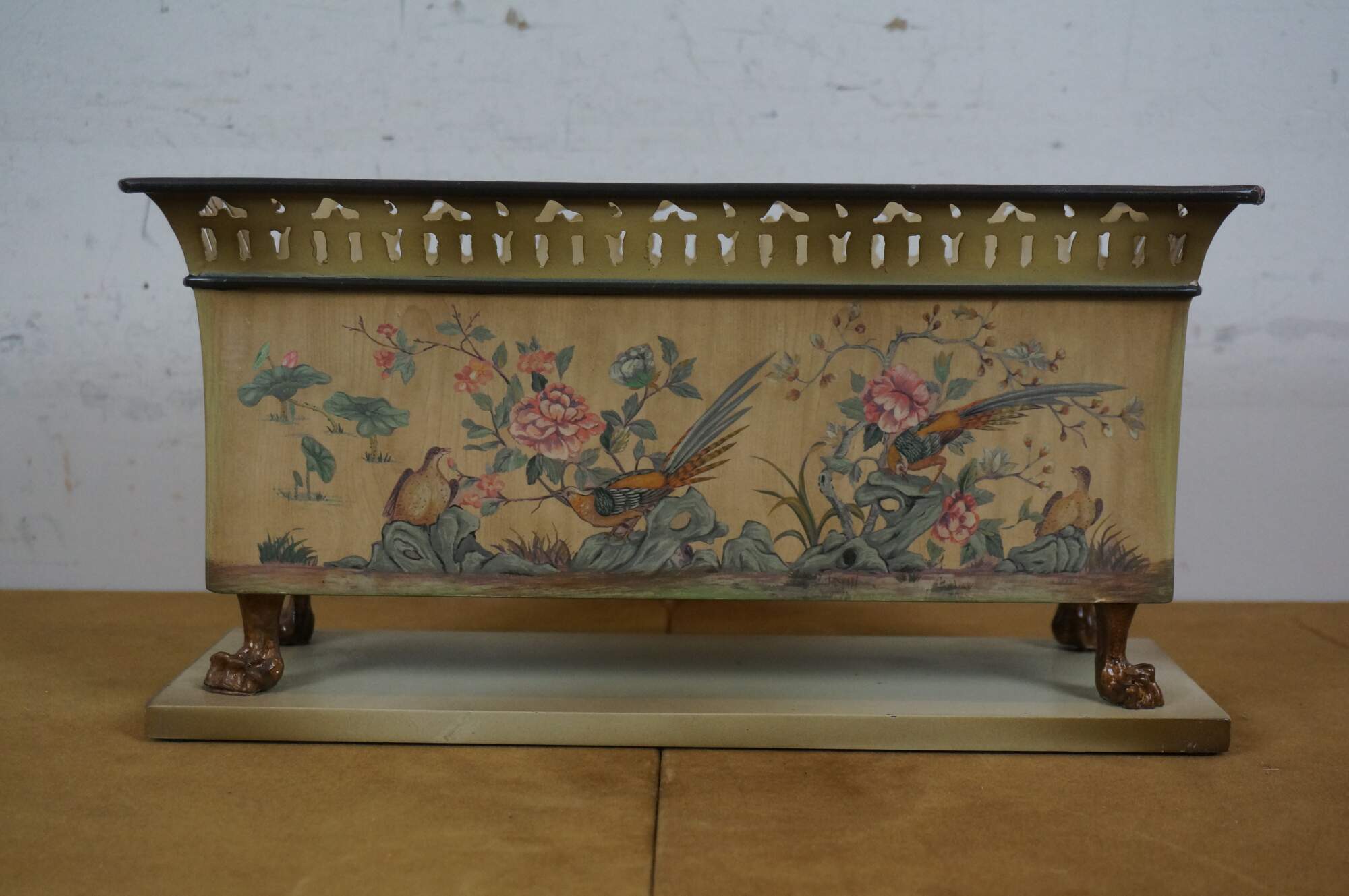 Late 20th century painted tole ware planter / jardiniere. Rectangular form with pierced/ reticulated/ flared rim, sides hand painted with a scene of pheasants / grouse on flowering bushes, supported on four claw / paw feet and a rectangular base.