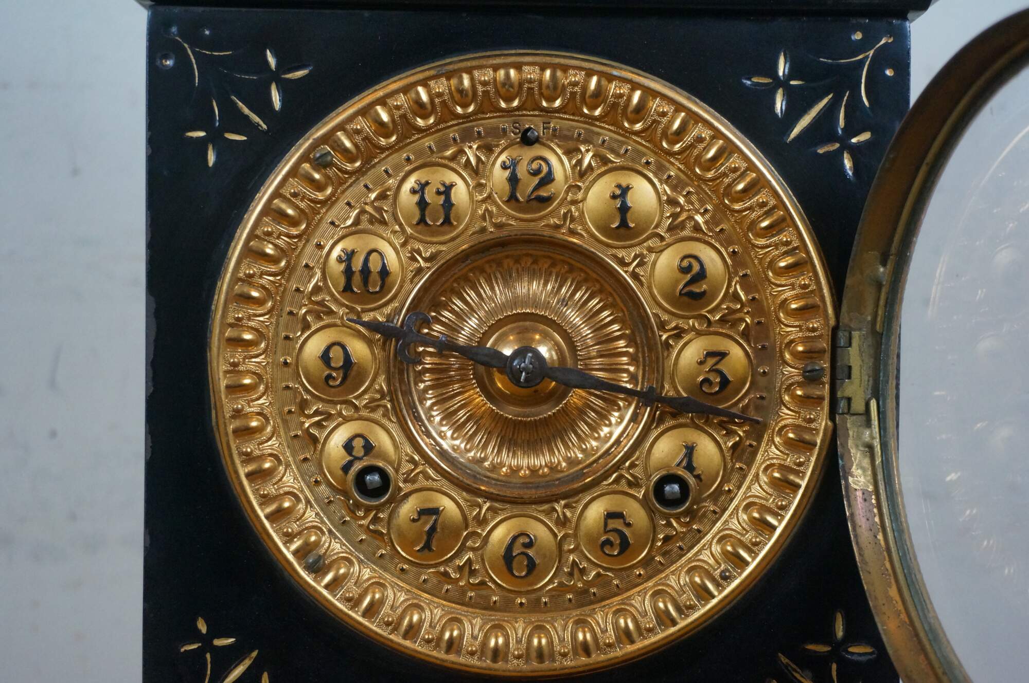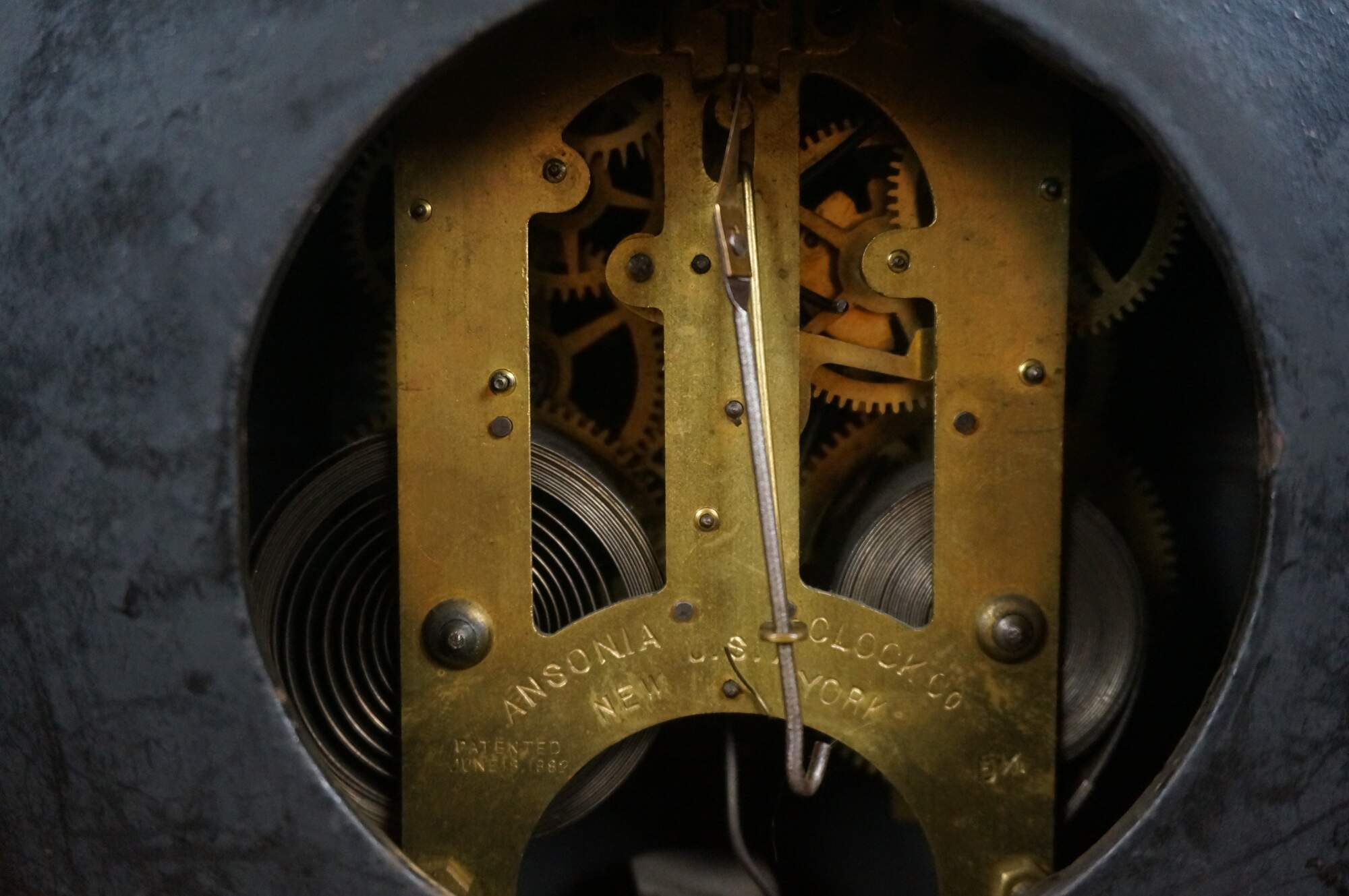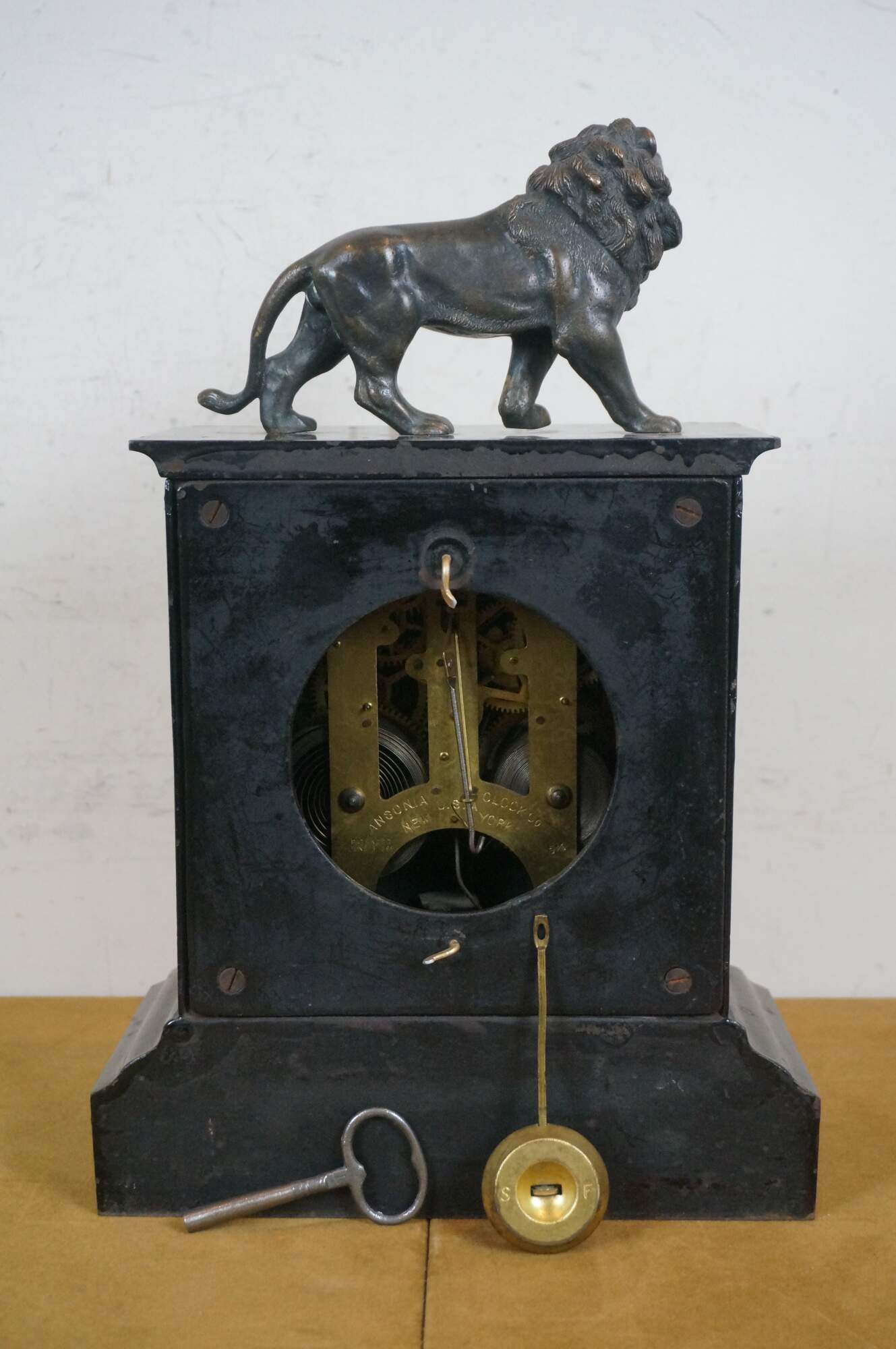 Late 19th century Ansonia key wound, chiming mantel clock. Features a rectangular, black lacquered, cast iron case with etched and gilt floral details, repousse gilt metal face with black Arabic numerals and hands, topped with a bronze figurine in the shape of a roaring lion. Movement by Ansonia Clock Company, New York, USA - Patented June 18, 1882 - 5 1/2. Includes key and pendulum. Good working order.