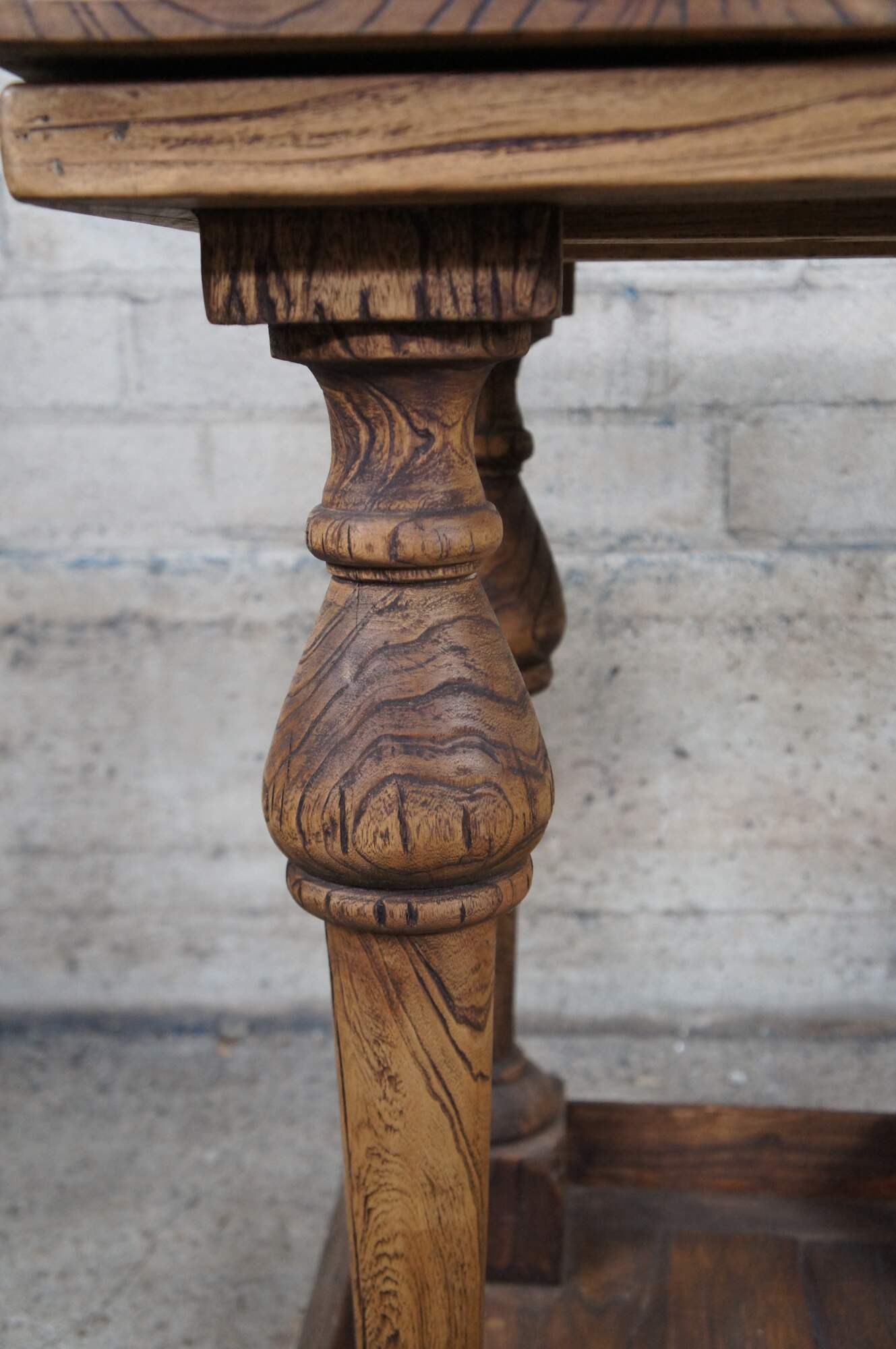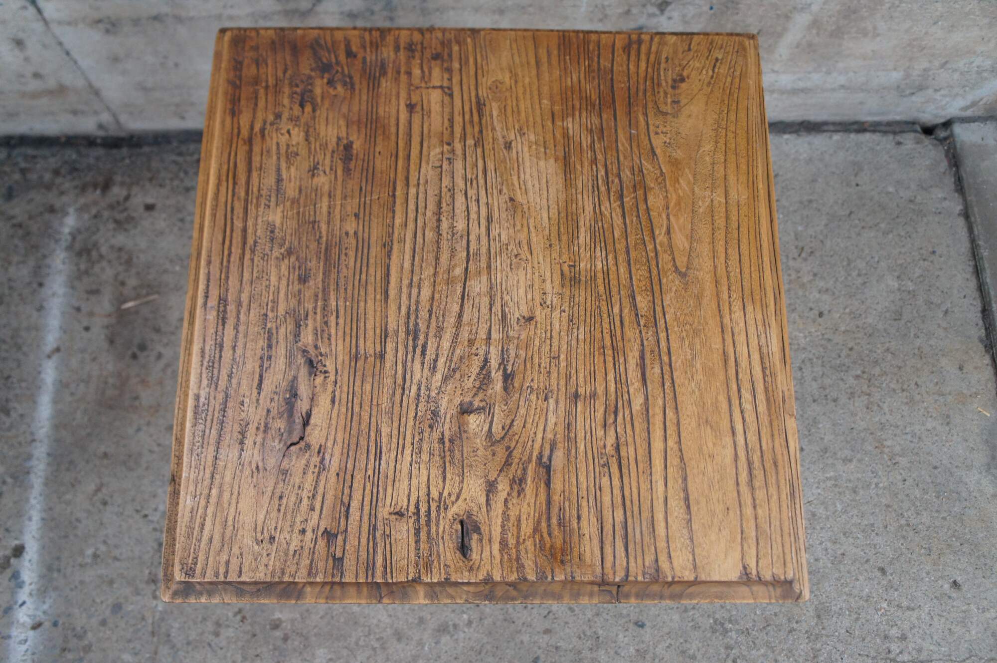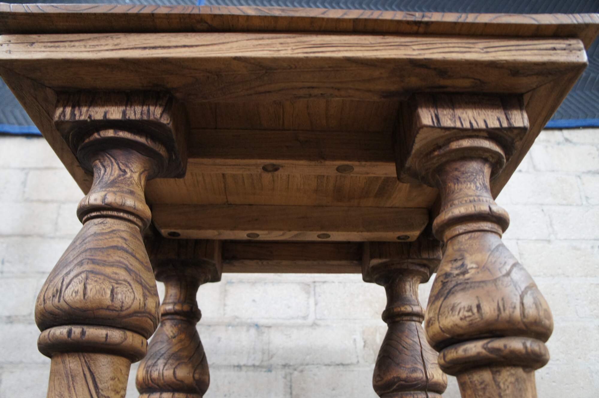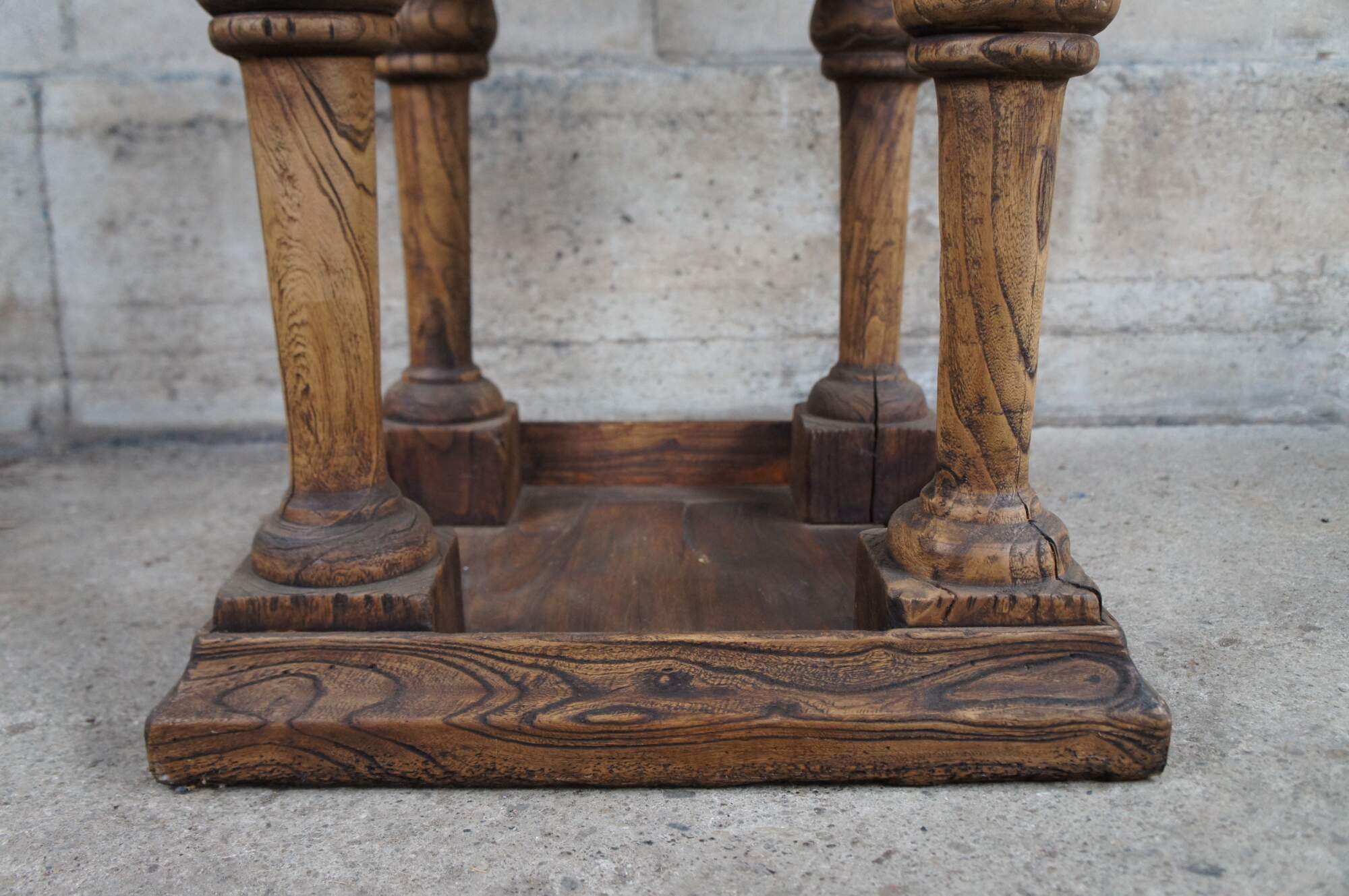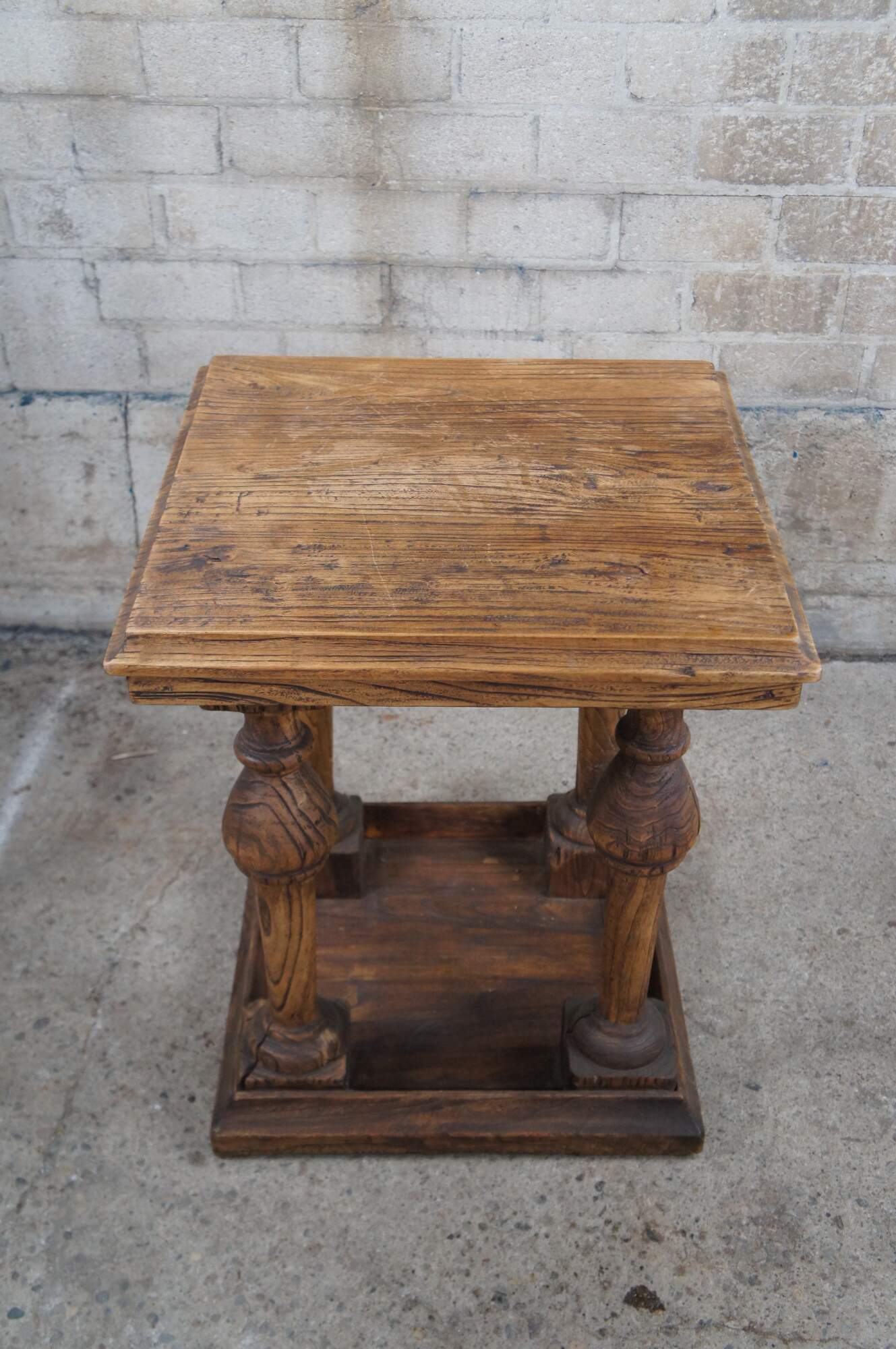 Vintage English farmhouse pedestal / side table / console / plant stand / sculpture base. Made of weathered oak featuring square form with chunky beveled top supported by turned Jacobean style columns in skirted base.