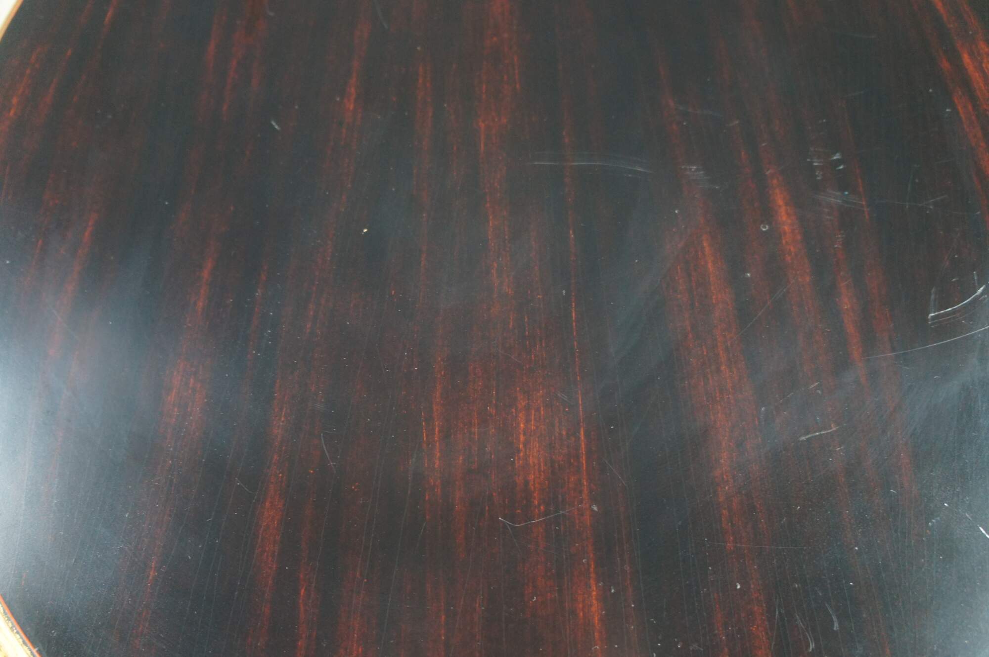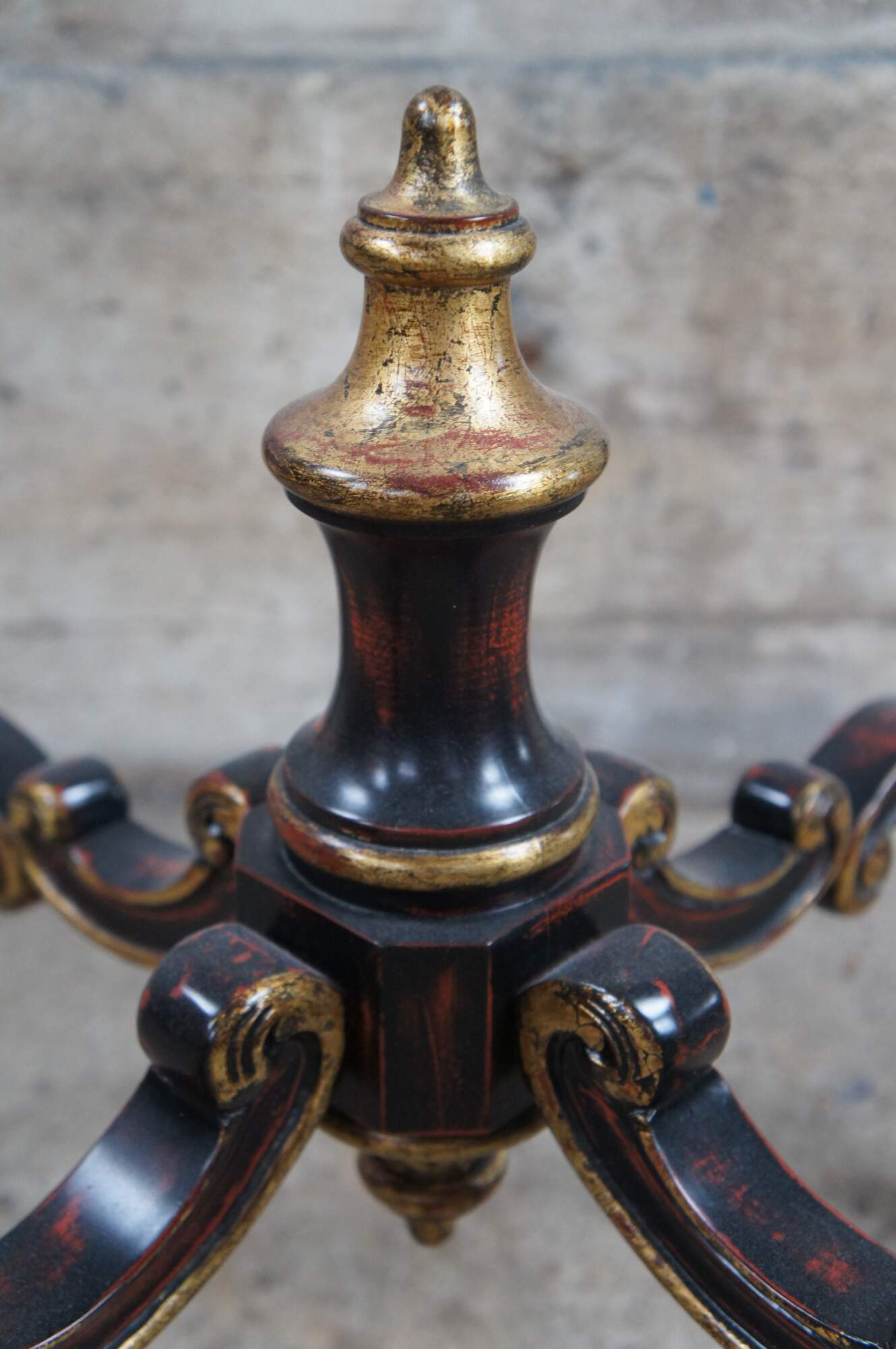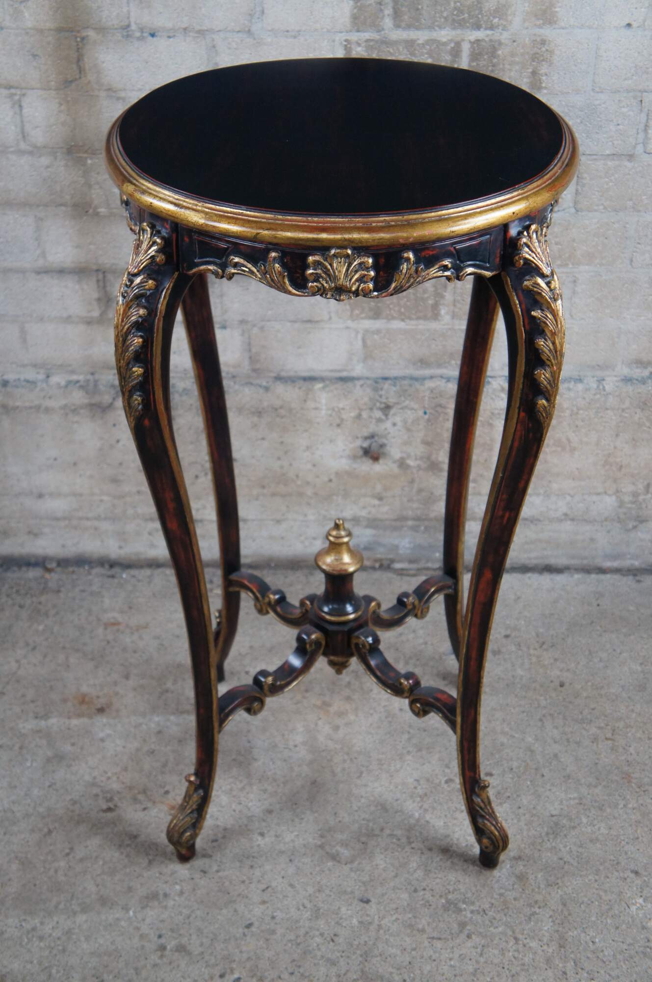 Vintage pedestal table / plant stand featuring French Rococo styling with elongated Gueridon form. The oval top is supported by cabriole legs accented with gold acanthus leaves, and connected by c scrolled supports leading to trophy finial. Brown and black with reddish undertones.