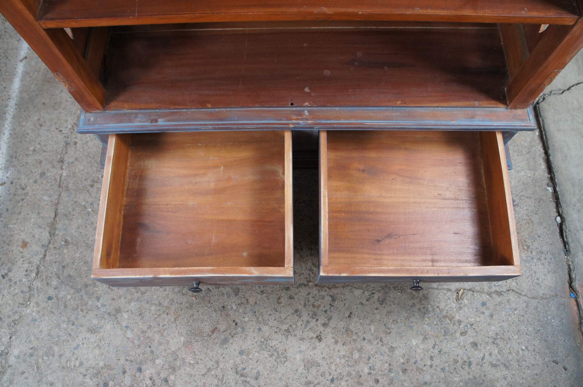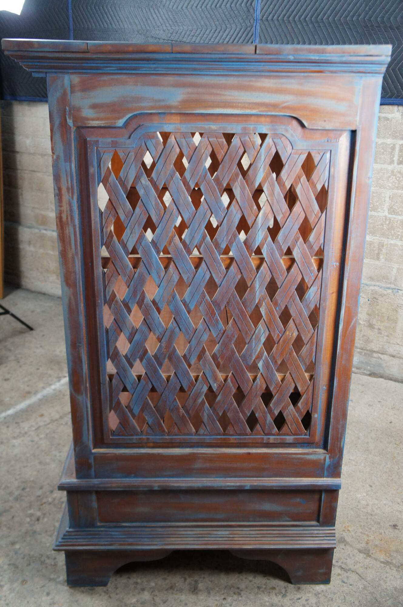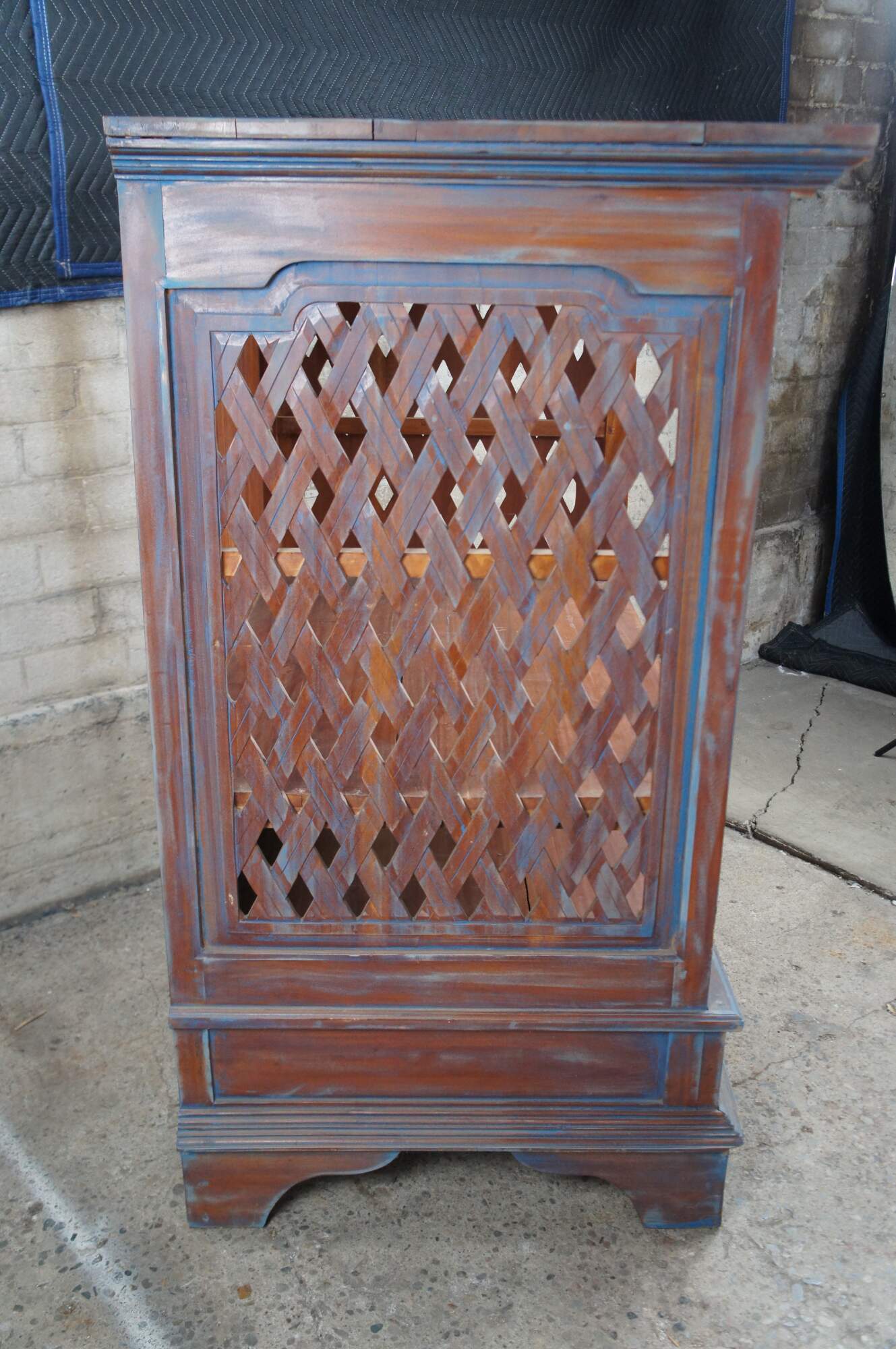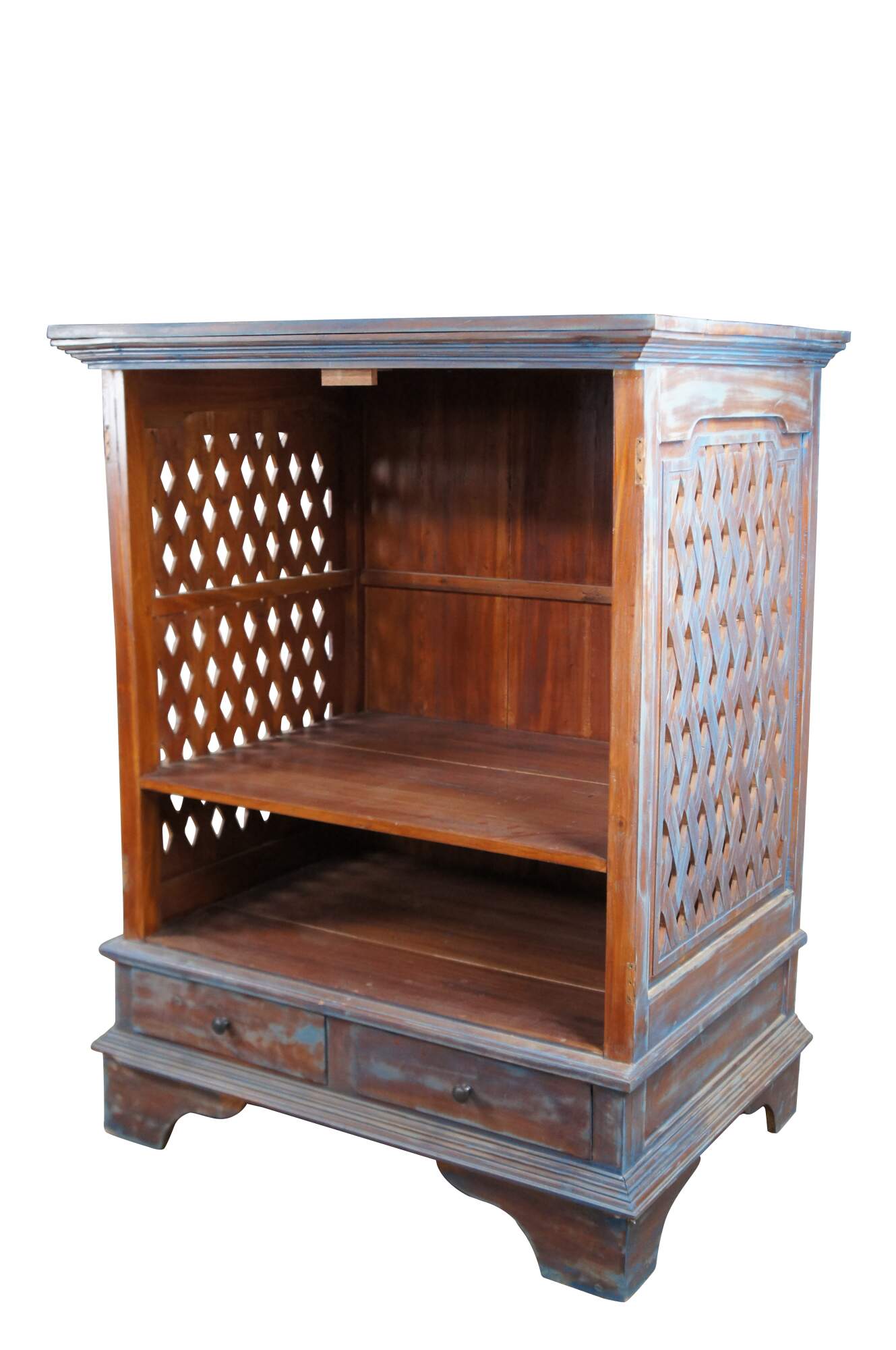 Vintage TV cabinet / console / linen storage featuring lattice sides, two drawers and one shelf supported by bracket feet.