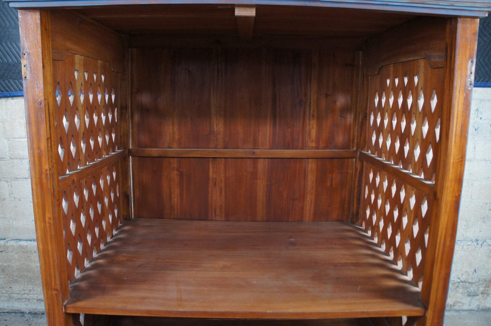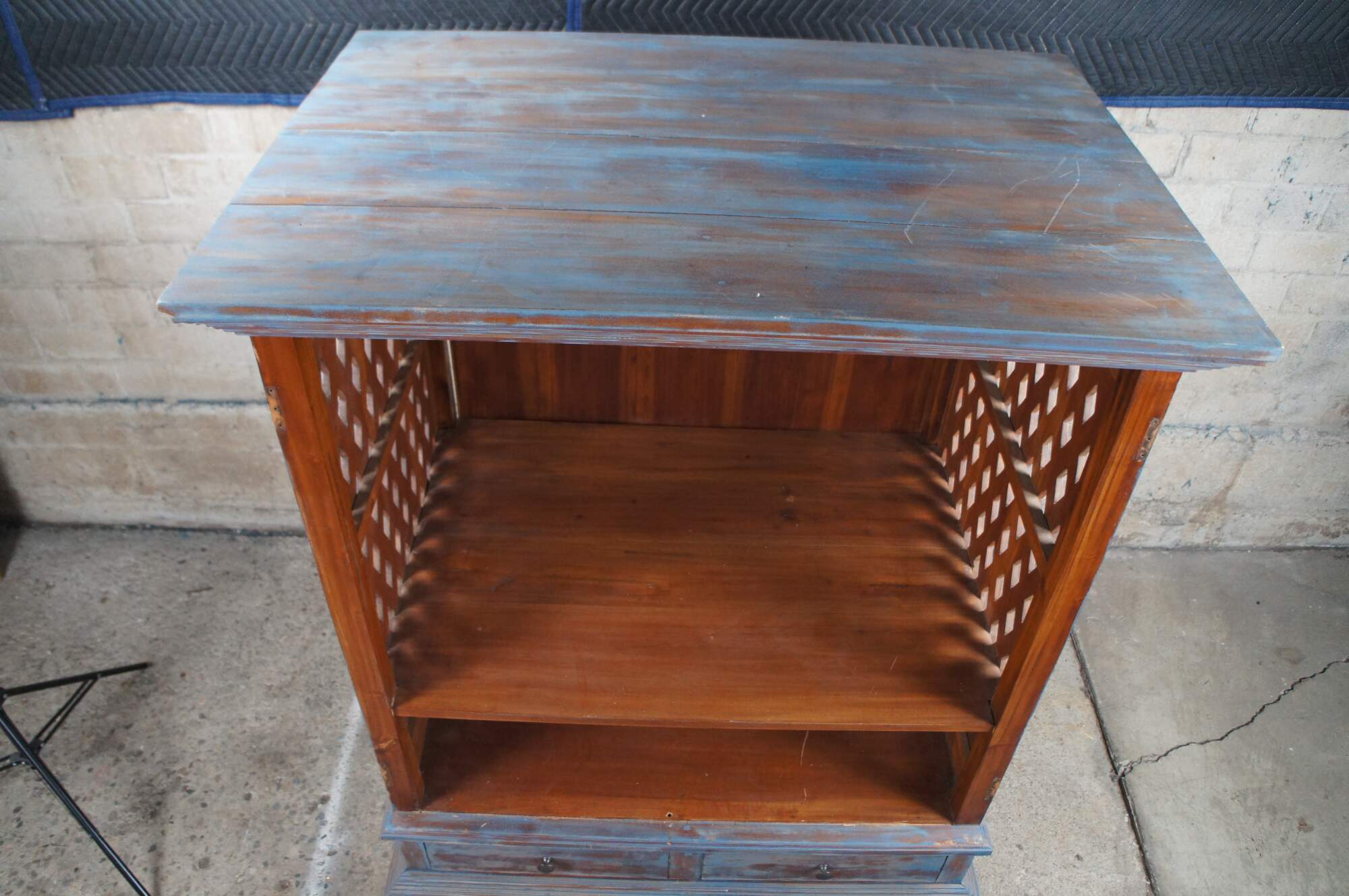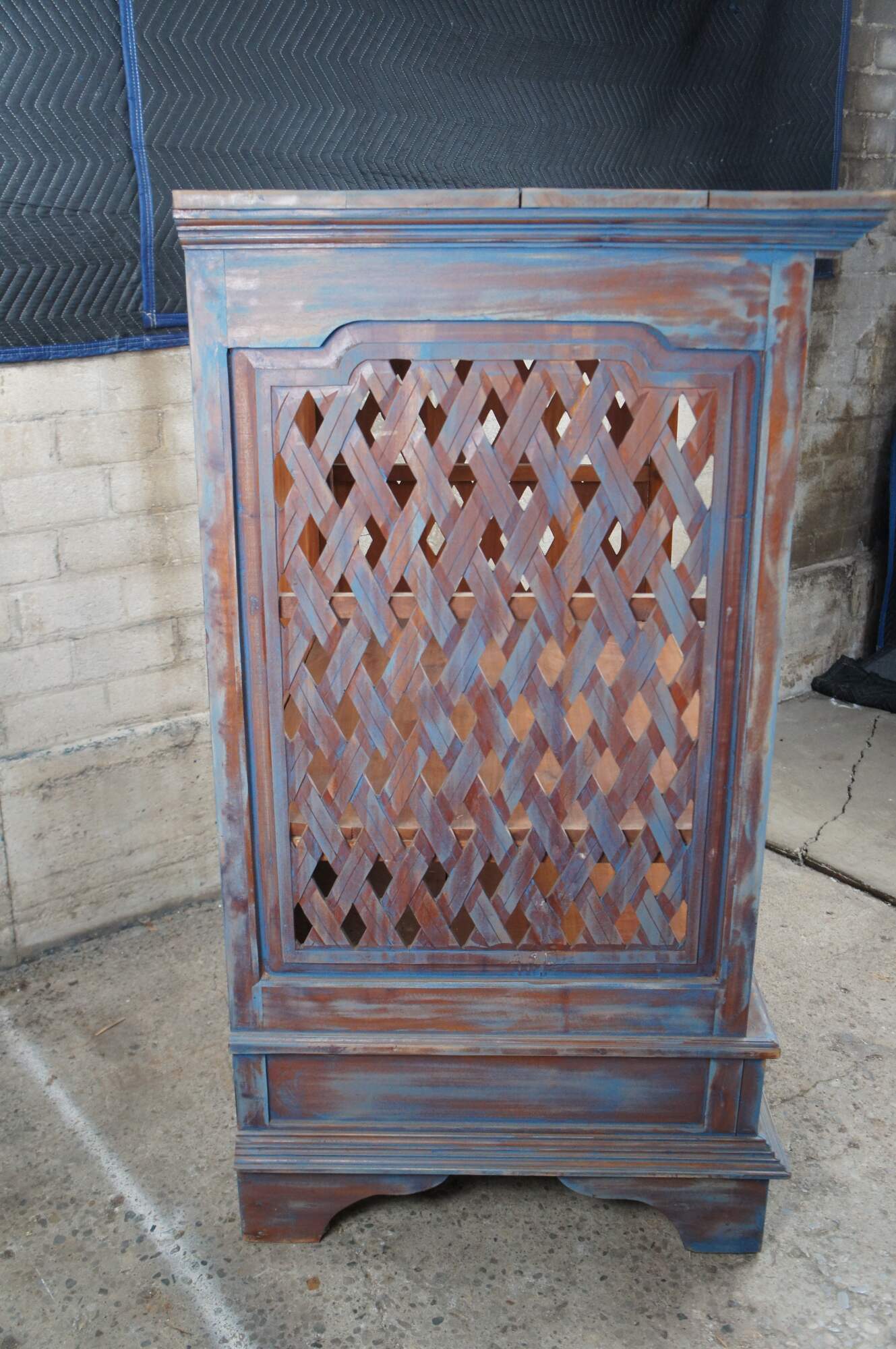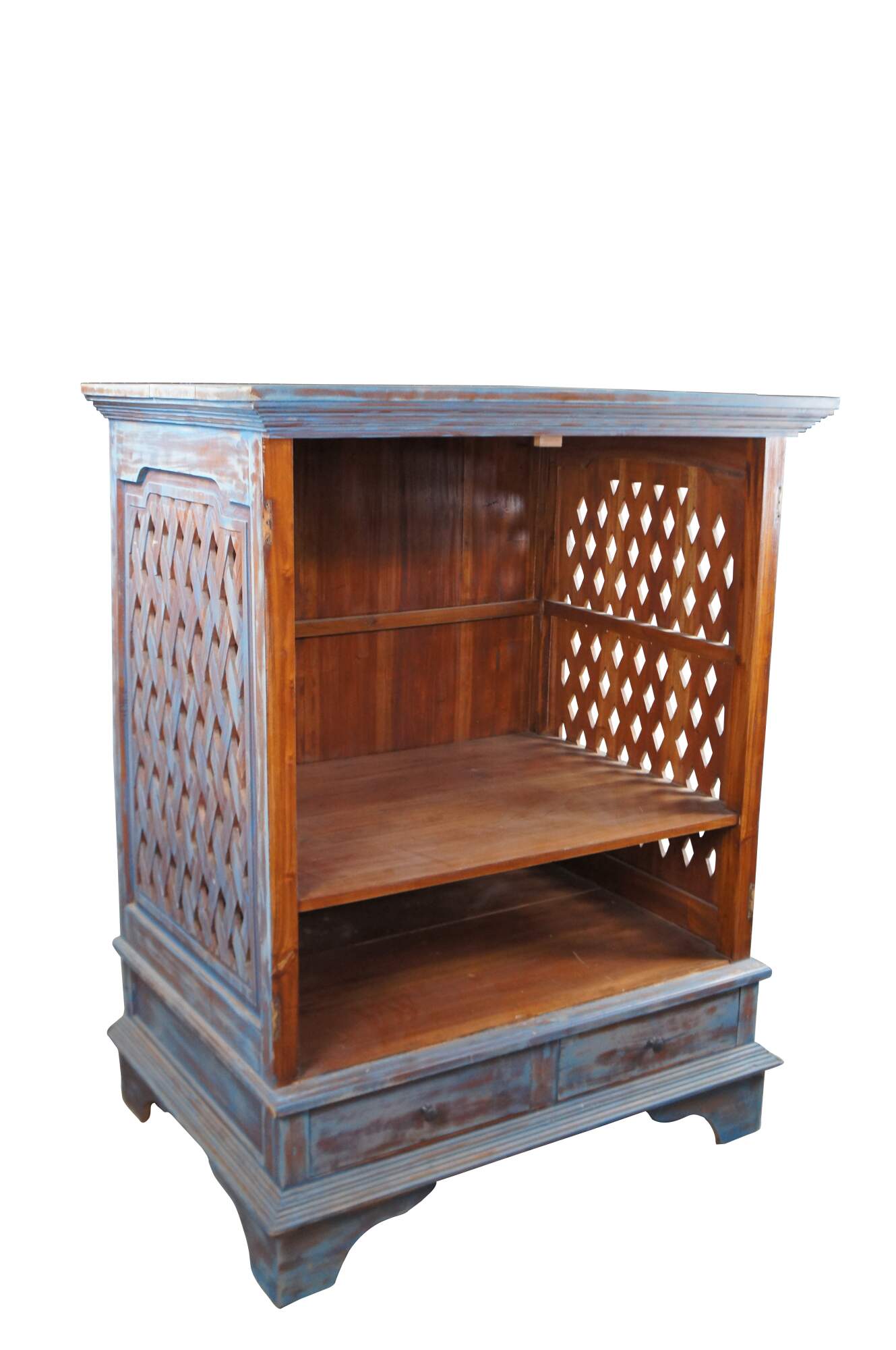 Vintage TV cabinet / console / linen storage featuring lattice sides, two drawers and one shelf supported by bracket feet.