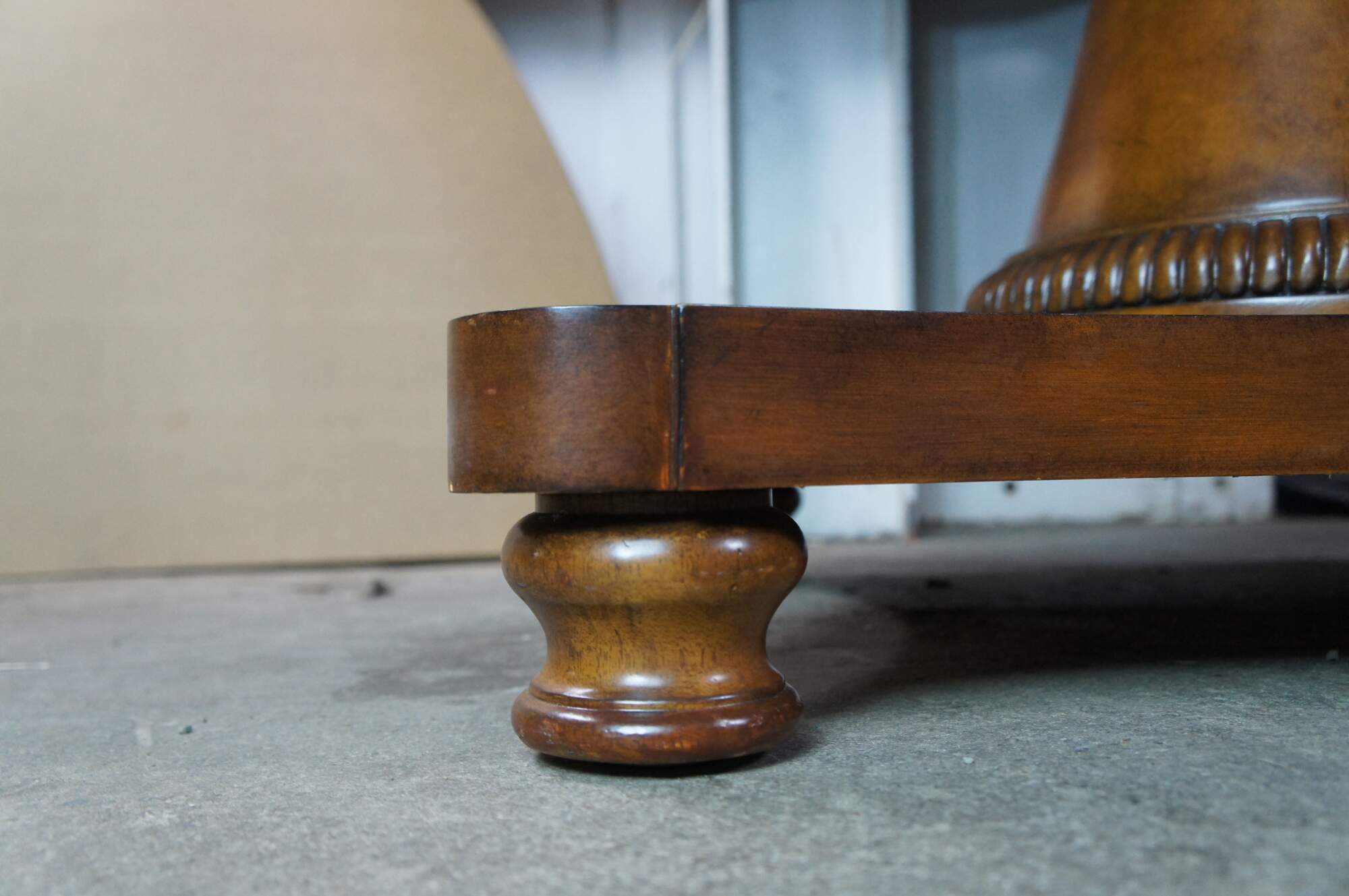 An early 21st-century English Regency-style round dining table. Made from cherry veneer with a beautiful matchbook and crossbanded top. The table is supported by a graduated column with ribbed accents on a contoured plinth vase-overturned feet.