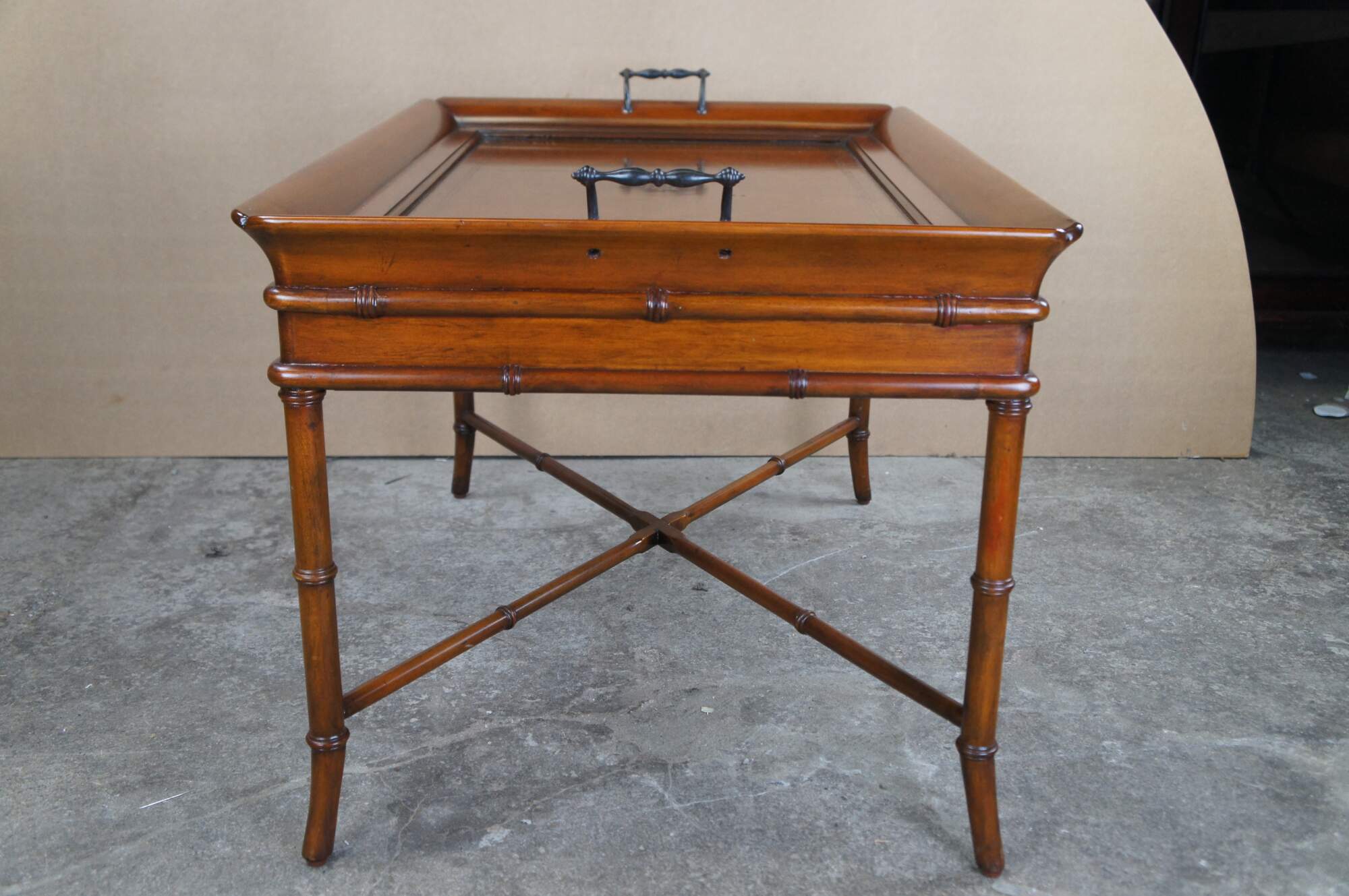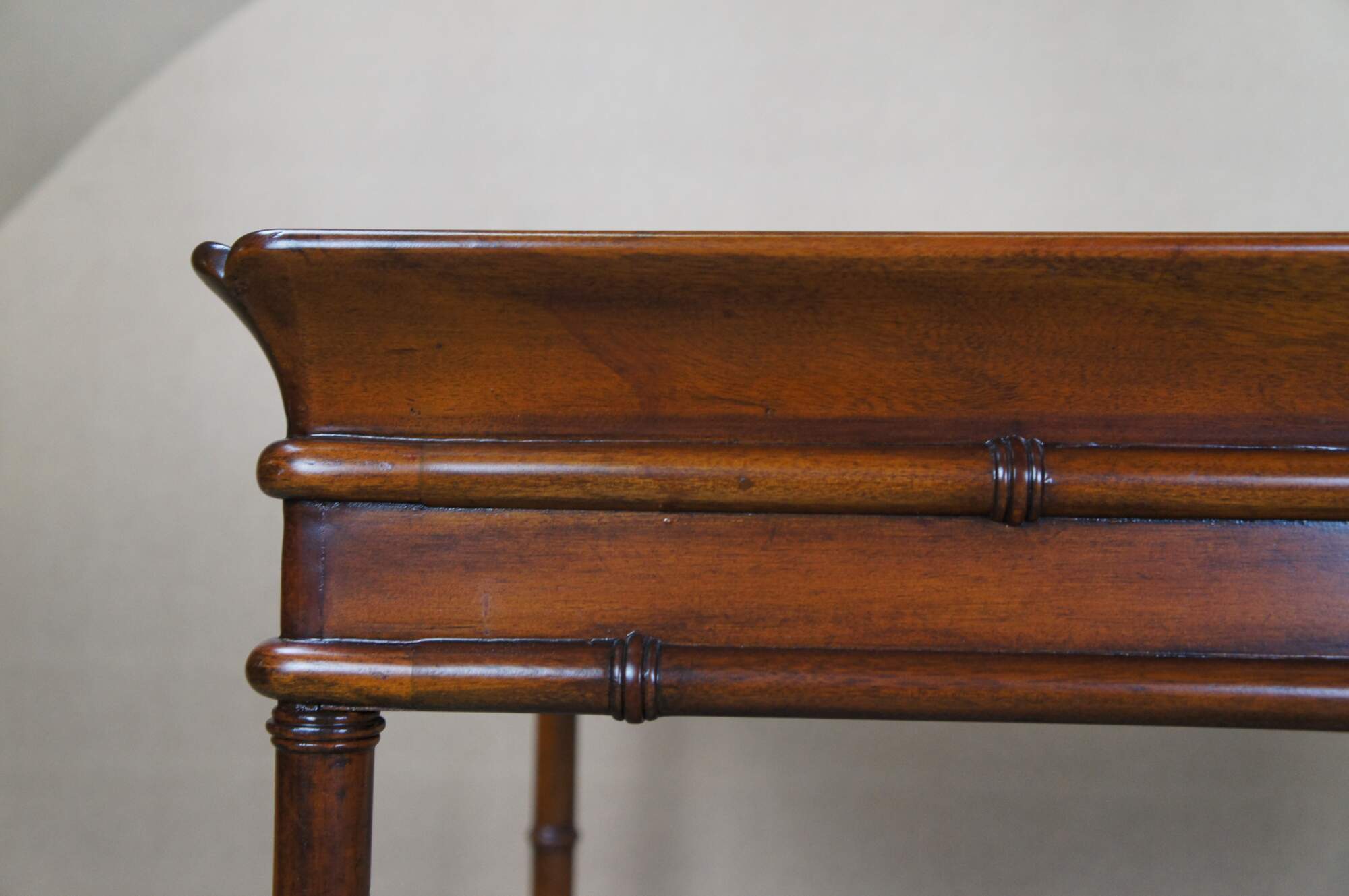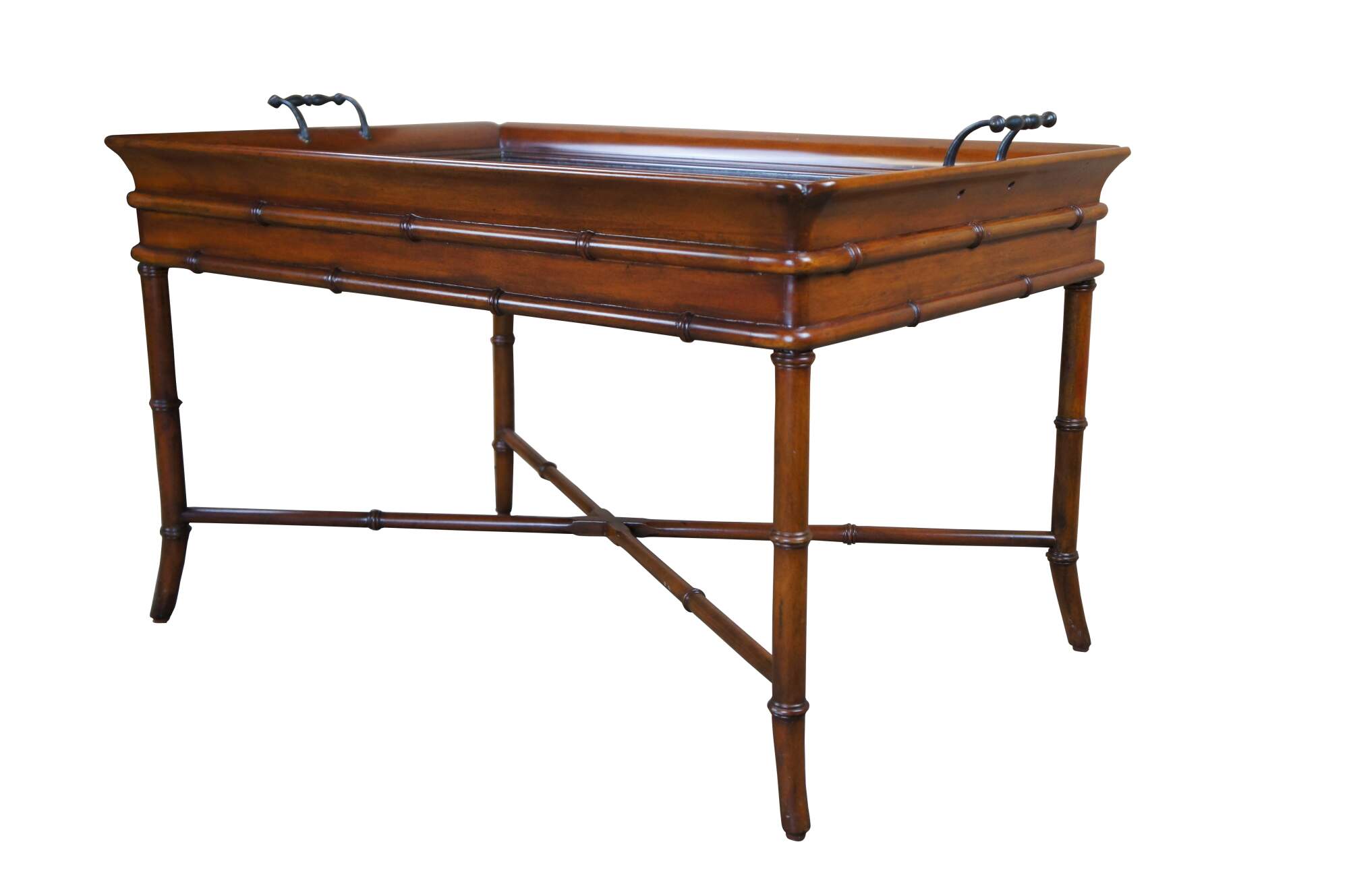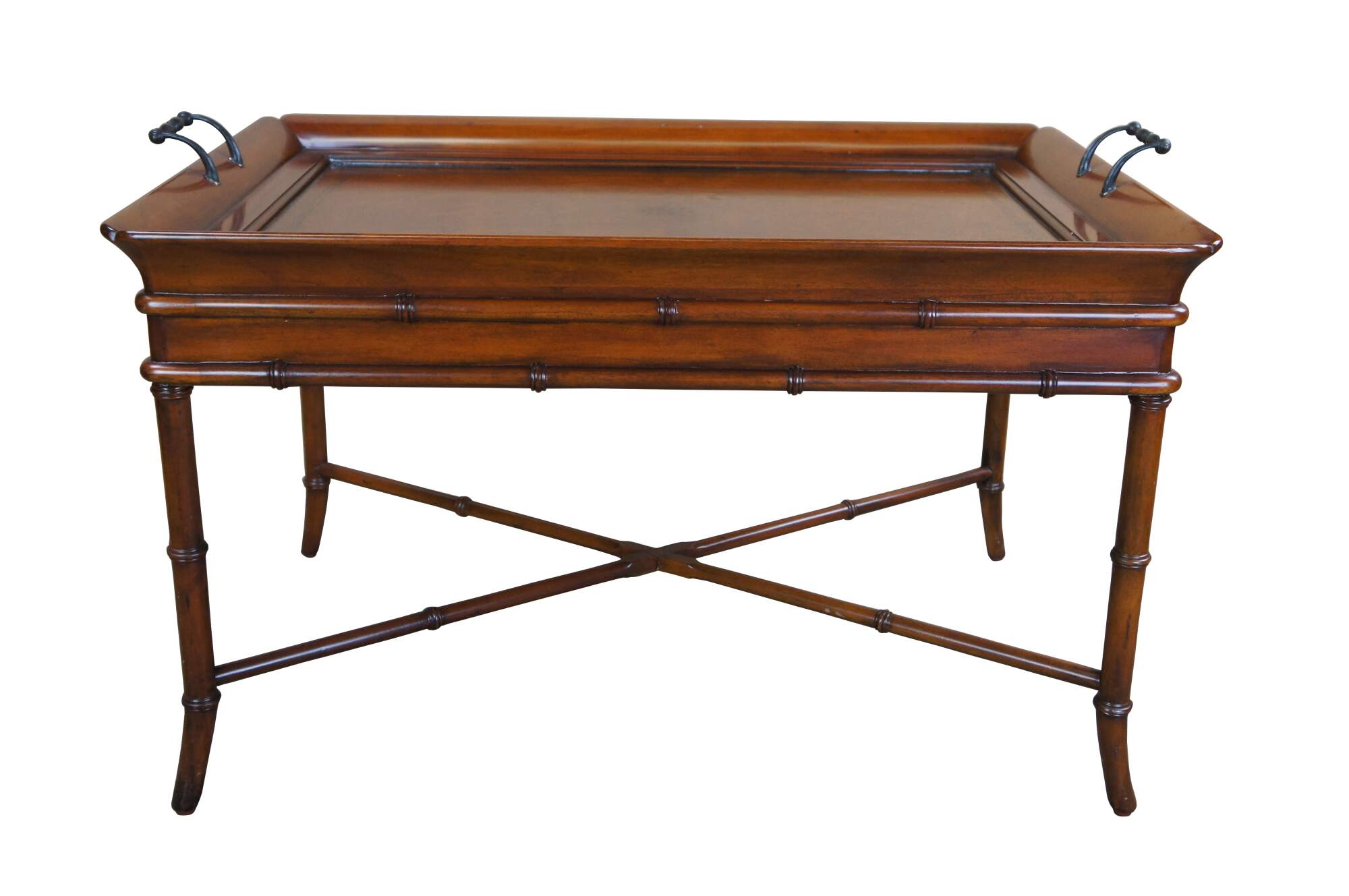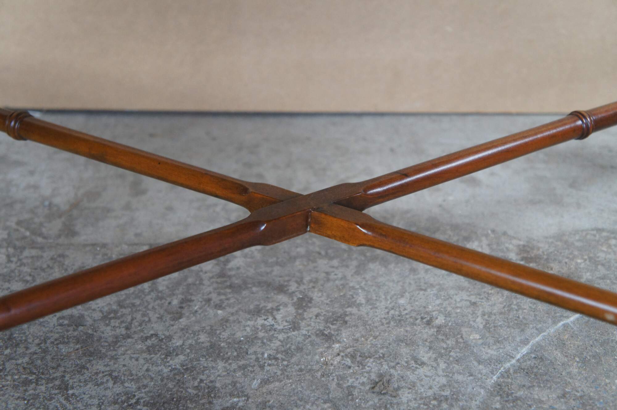 Early 21st century Campaign Maitland Smith Regency Style Coffee Table. Made from mahogany with a faux bamboo form featuring an inset top with a burled veneer table surface. The surface is designed to appear like its leather with a tooled border. The table is supported by bamboo form legs connected by an X stretcher. Underside marked Handmade in Philippines