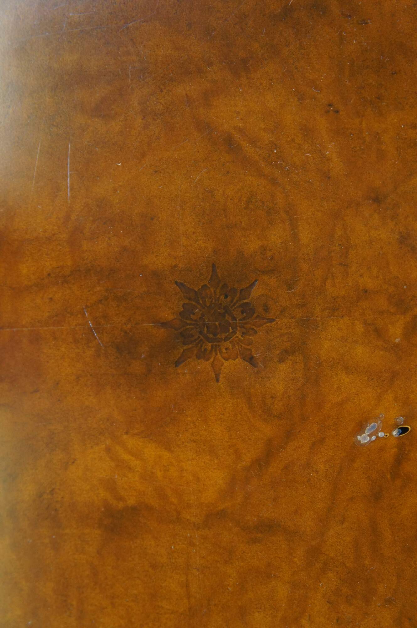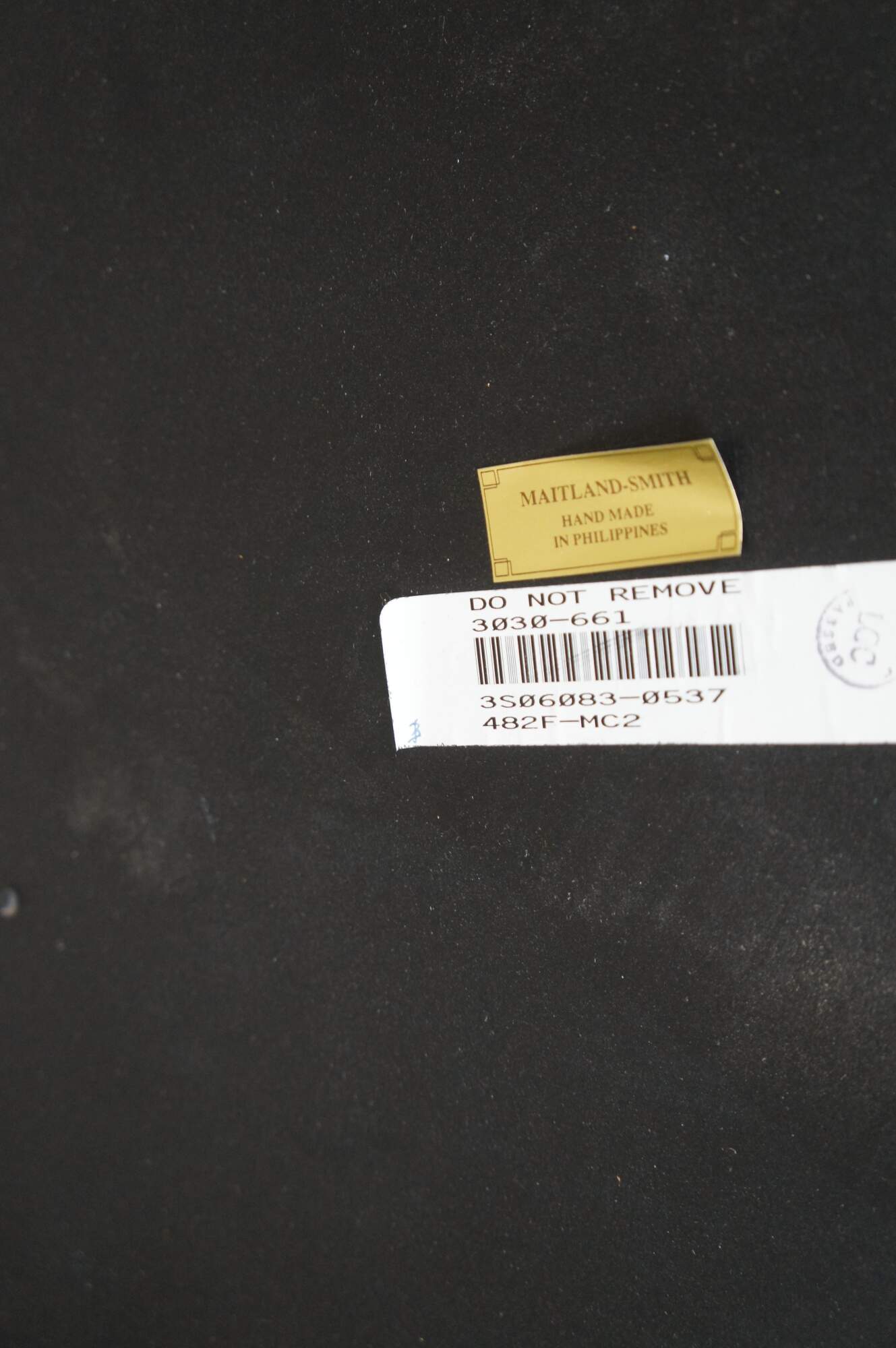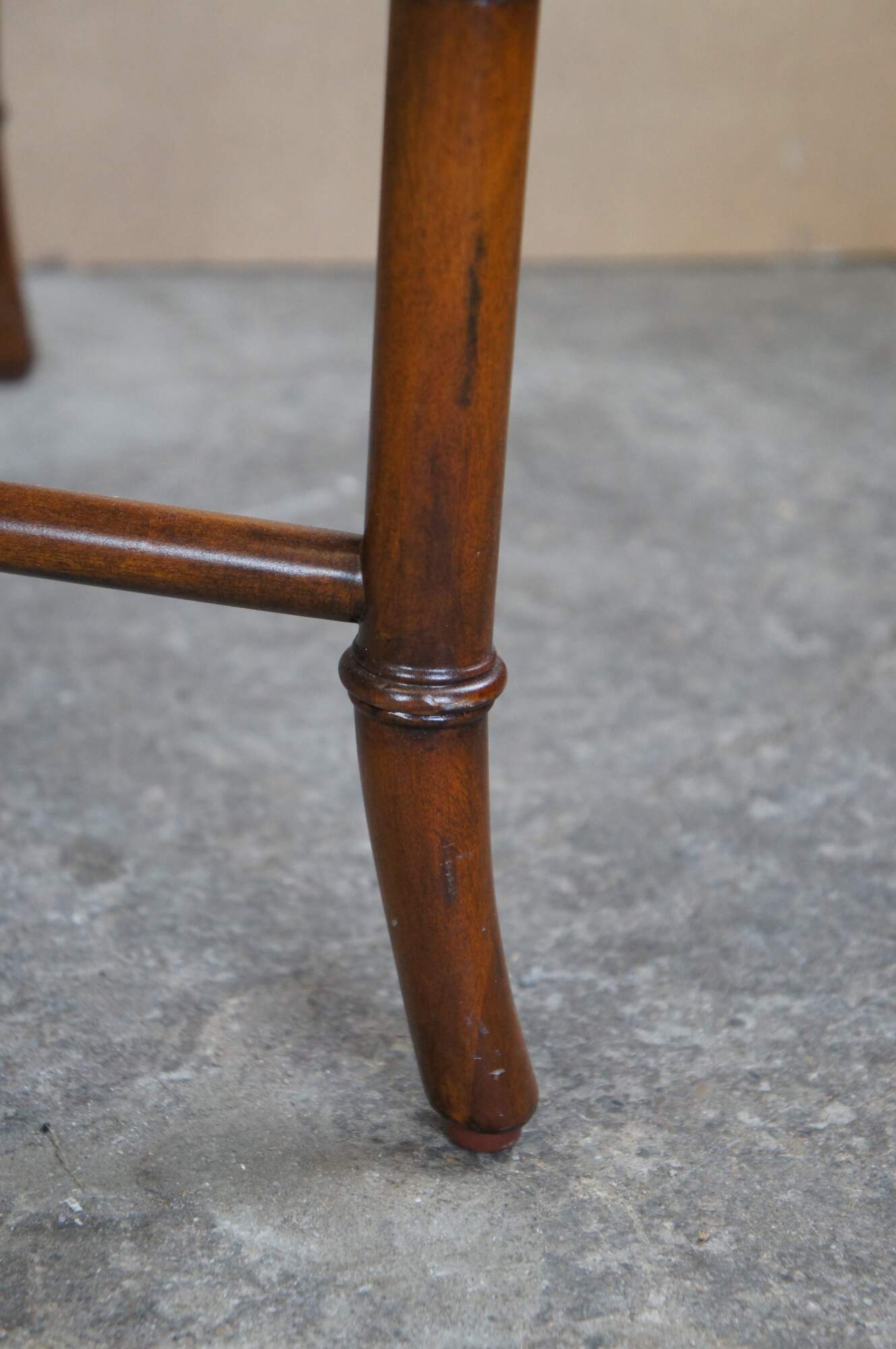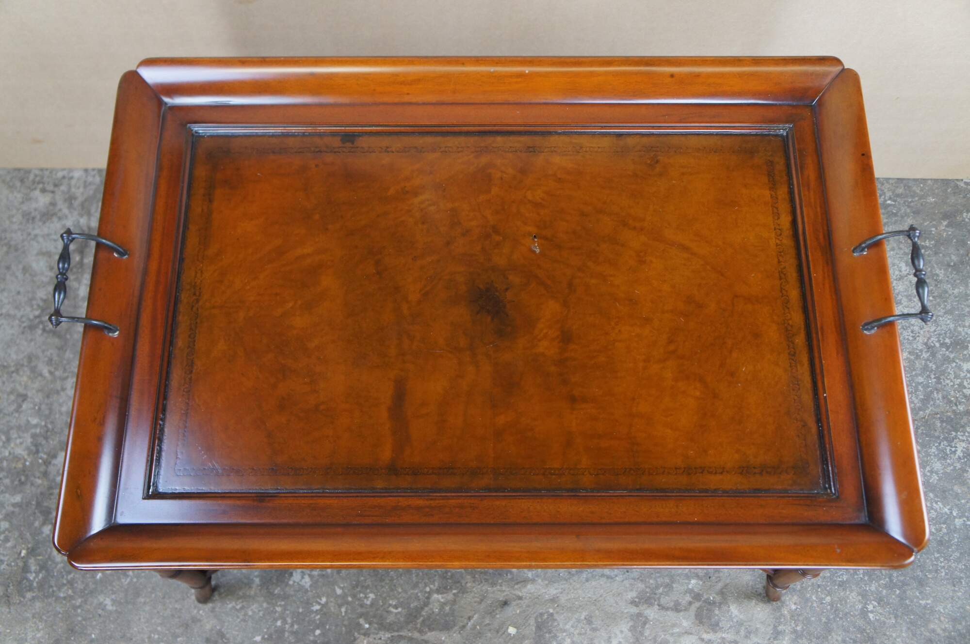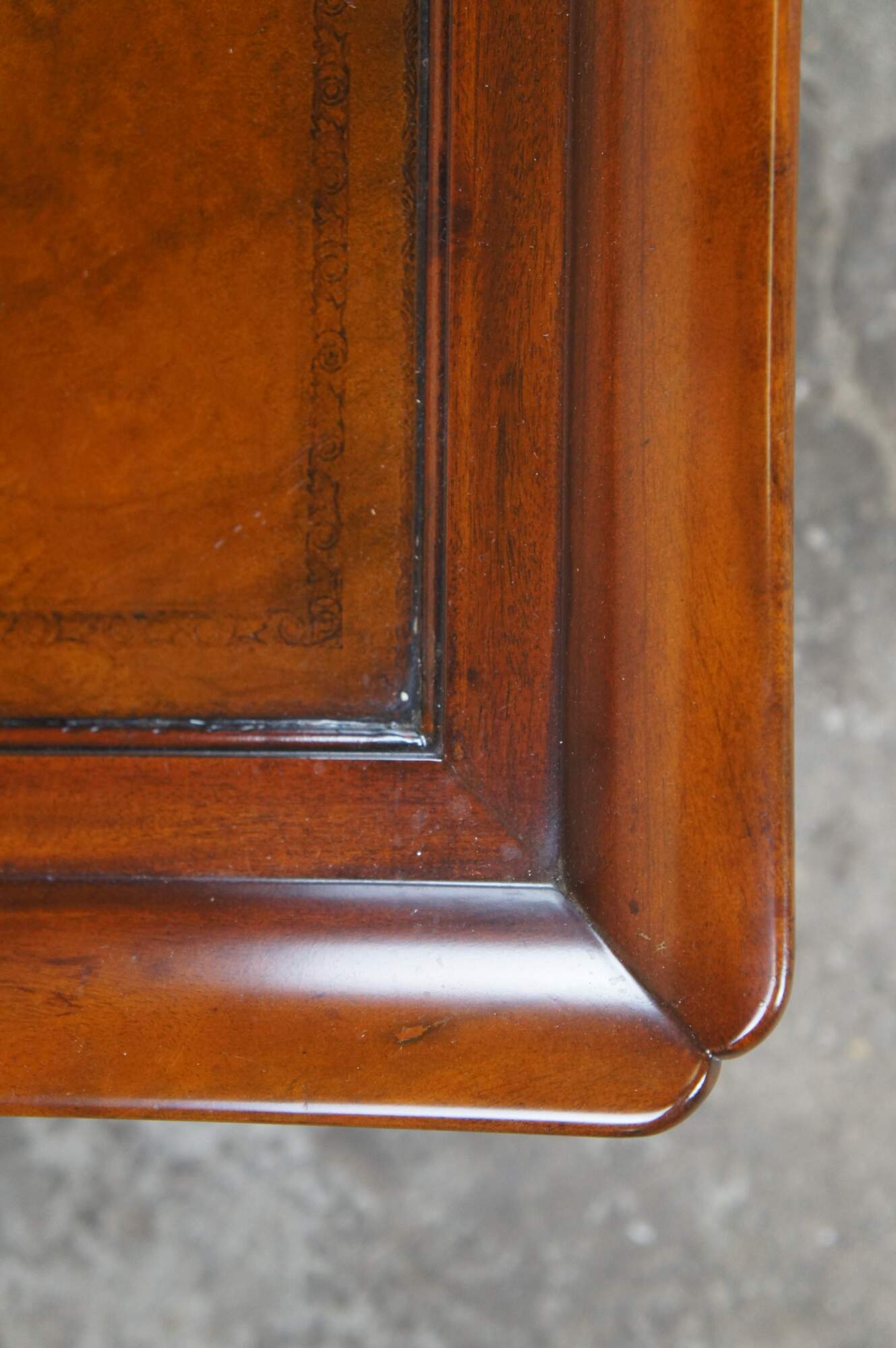 Early 21st century Campaign Maitland Smith Regency Style Coffee Table. Made from mahogany with a faux bamboo form featuring an inset top with a burled veneer table surface. The surface is designed to appear like its leather with a tooled border. The table is supported by bamboo form legs connected by an X stretcher. Underside marked Handmade in Philippines