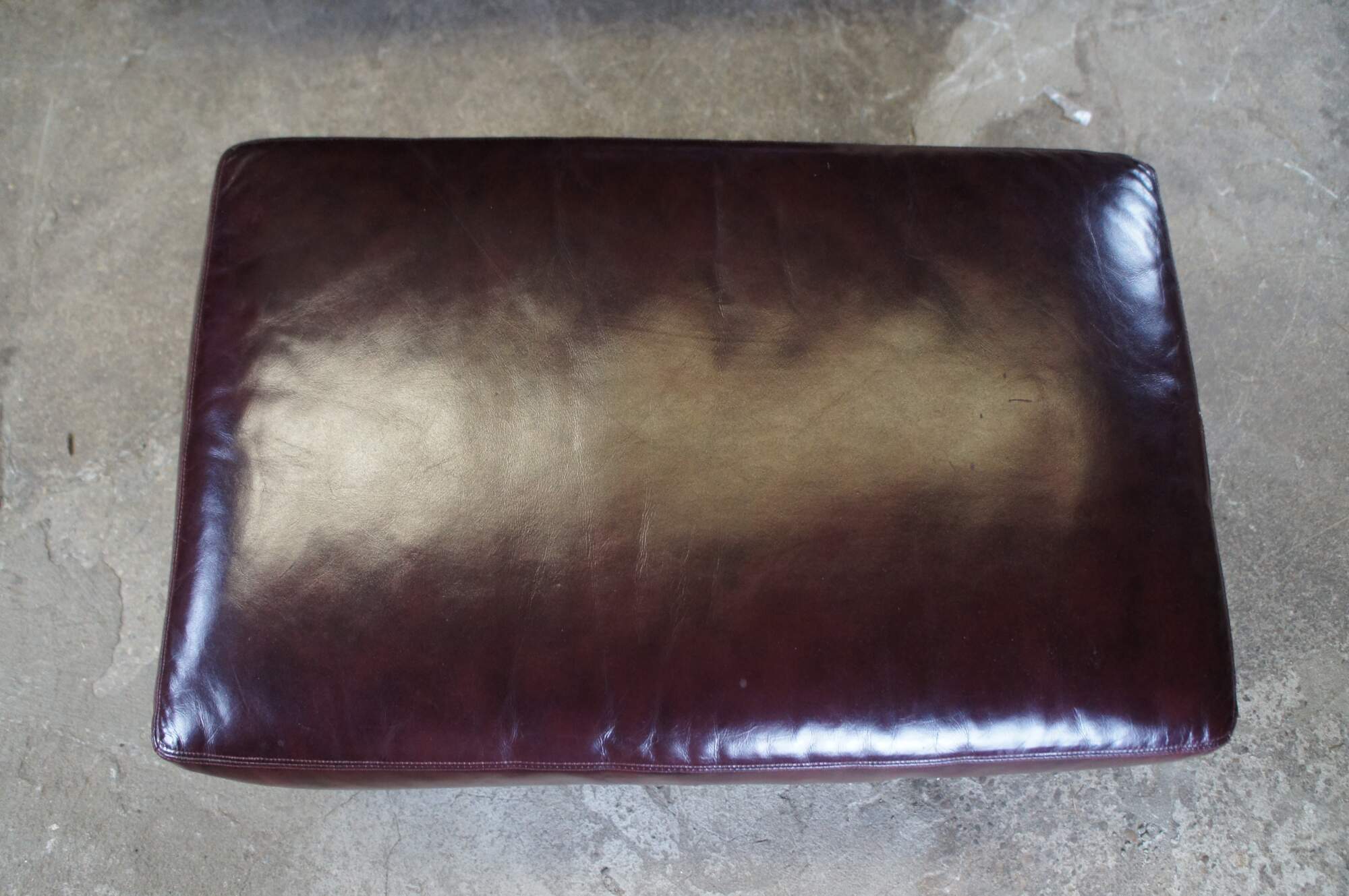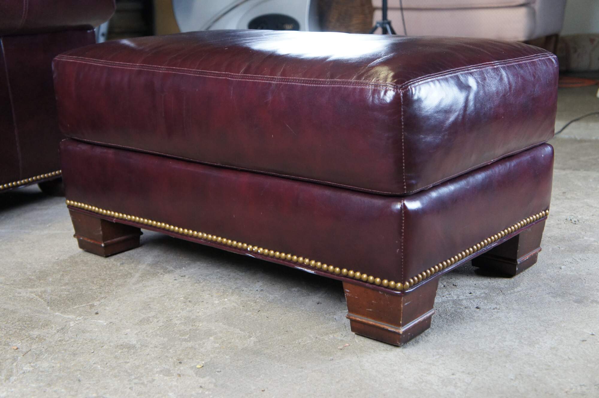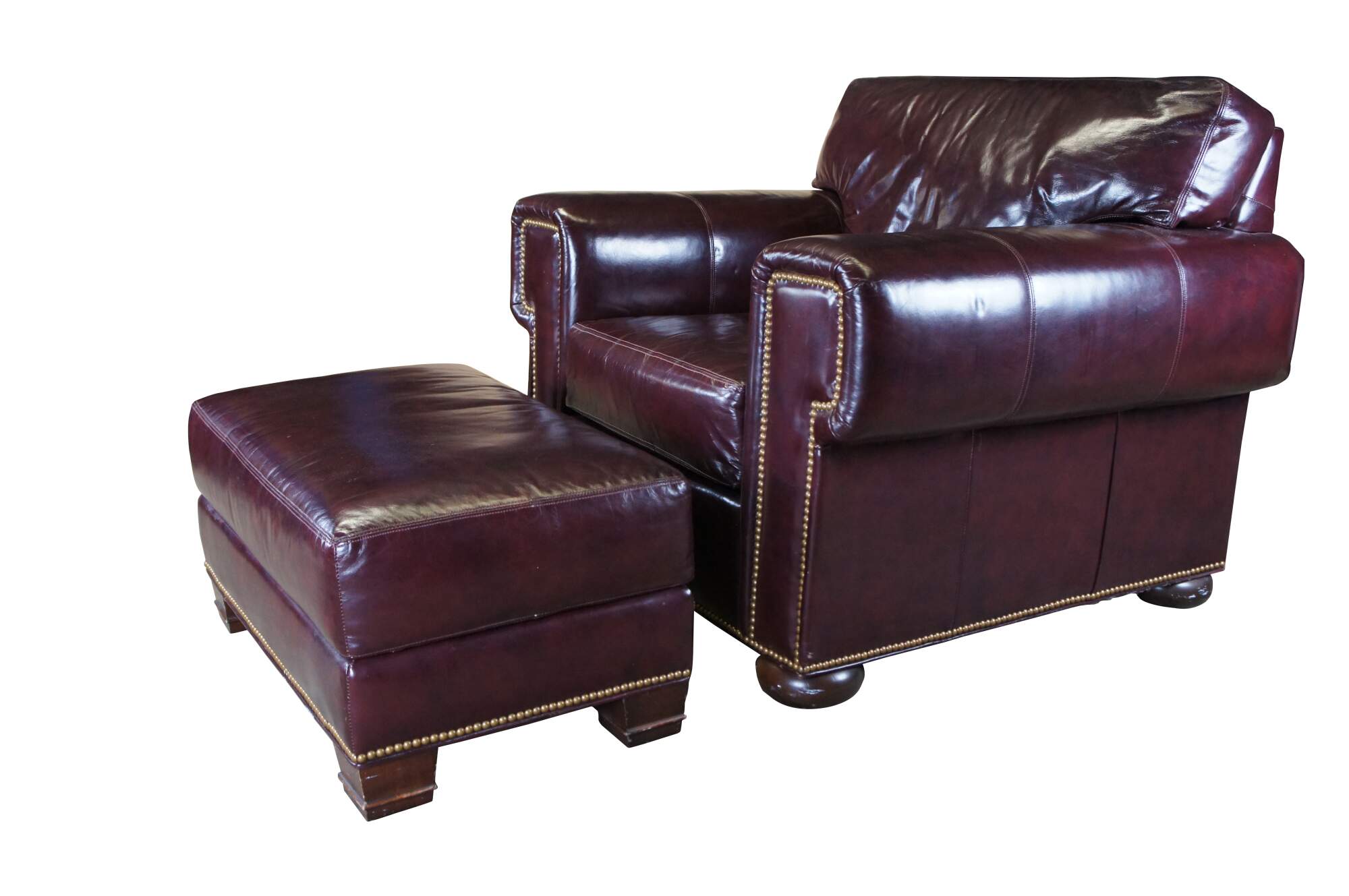 Beautiful pair of Whittemore-Sherrill Limited Oversized Genuine Leather Chairs and Ottoman, Circa 2000s. The chairs have a large squared frame in English Chesterfield manner. Upholstered in a red burgundy leather with brass nailhead trim. The chairs are supported by mahogany finished bun feet and the rectangular ottoman is over square tapered legs. A comfortable addition to any sitting area.