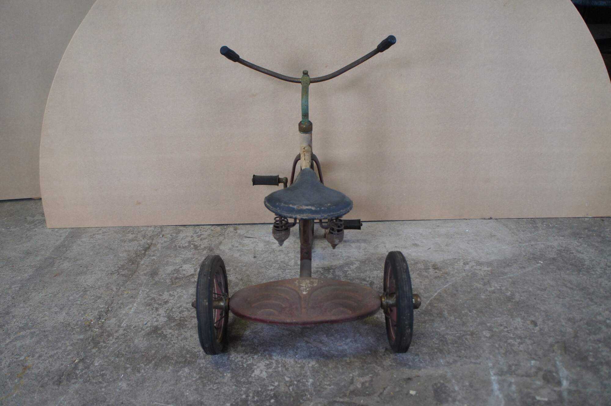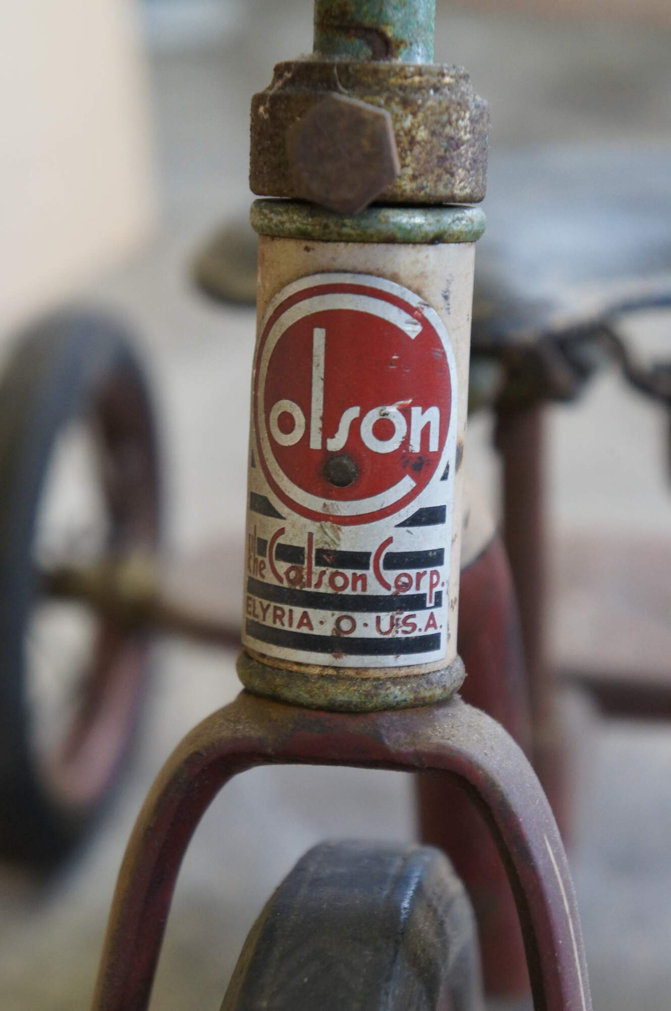 1940-50s Colson Tricycle Trike, Elyria, Ohio. Two-tone red and white with spring-loaded seat.