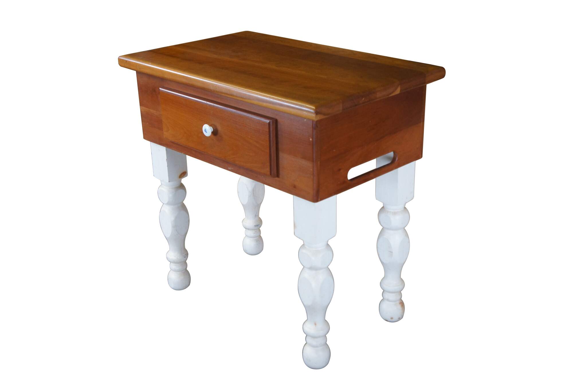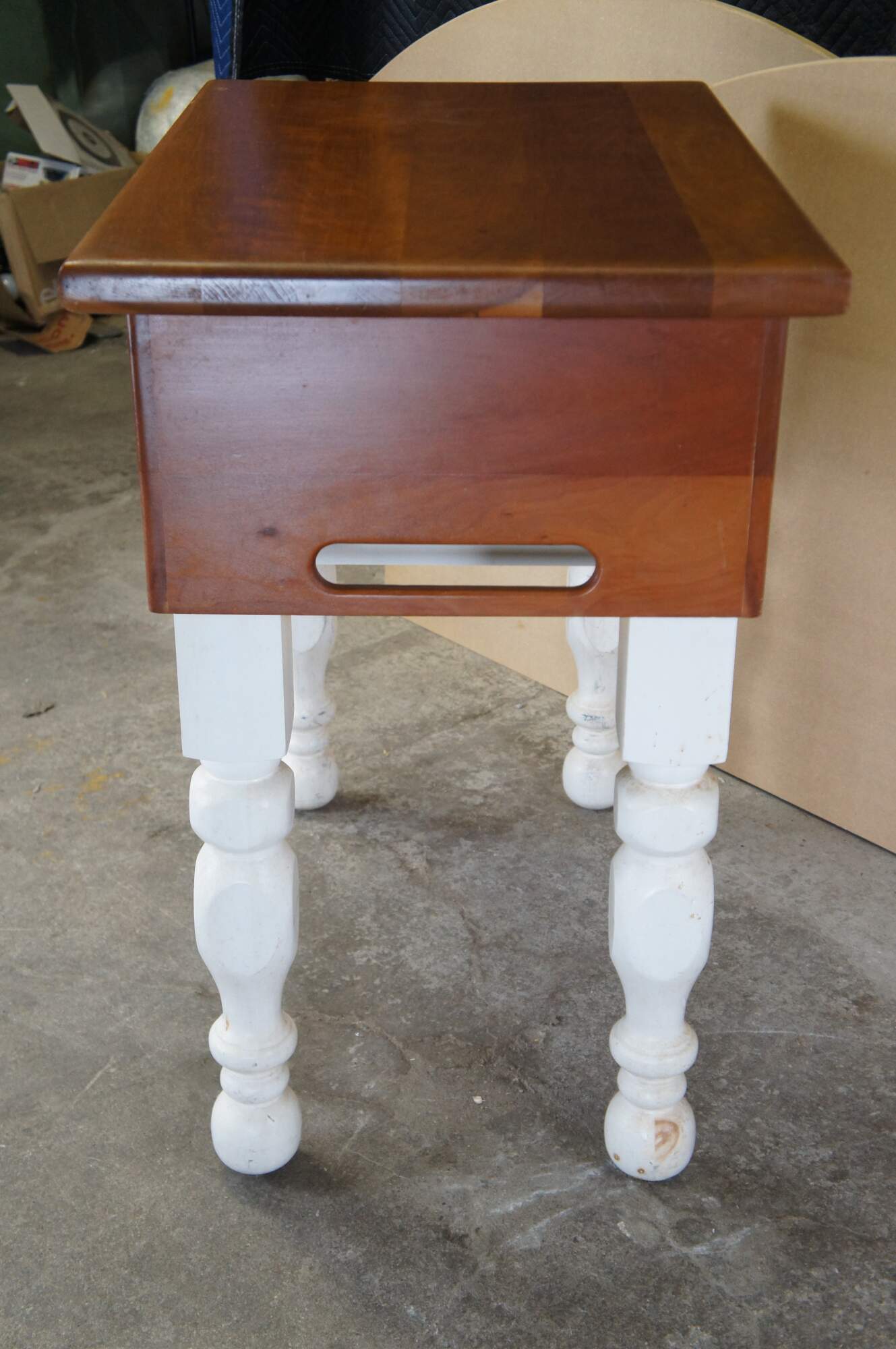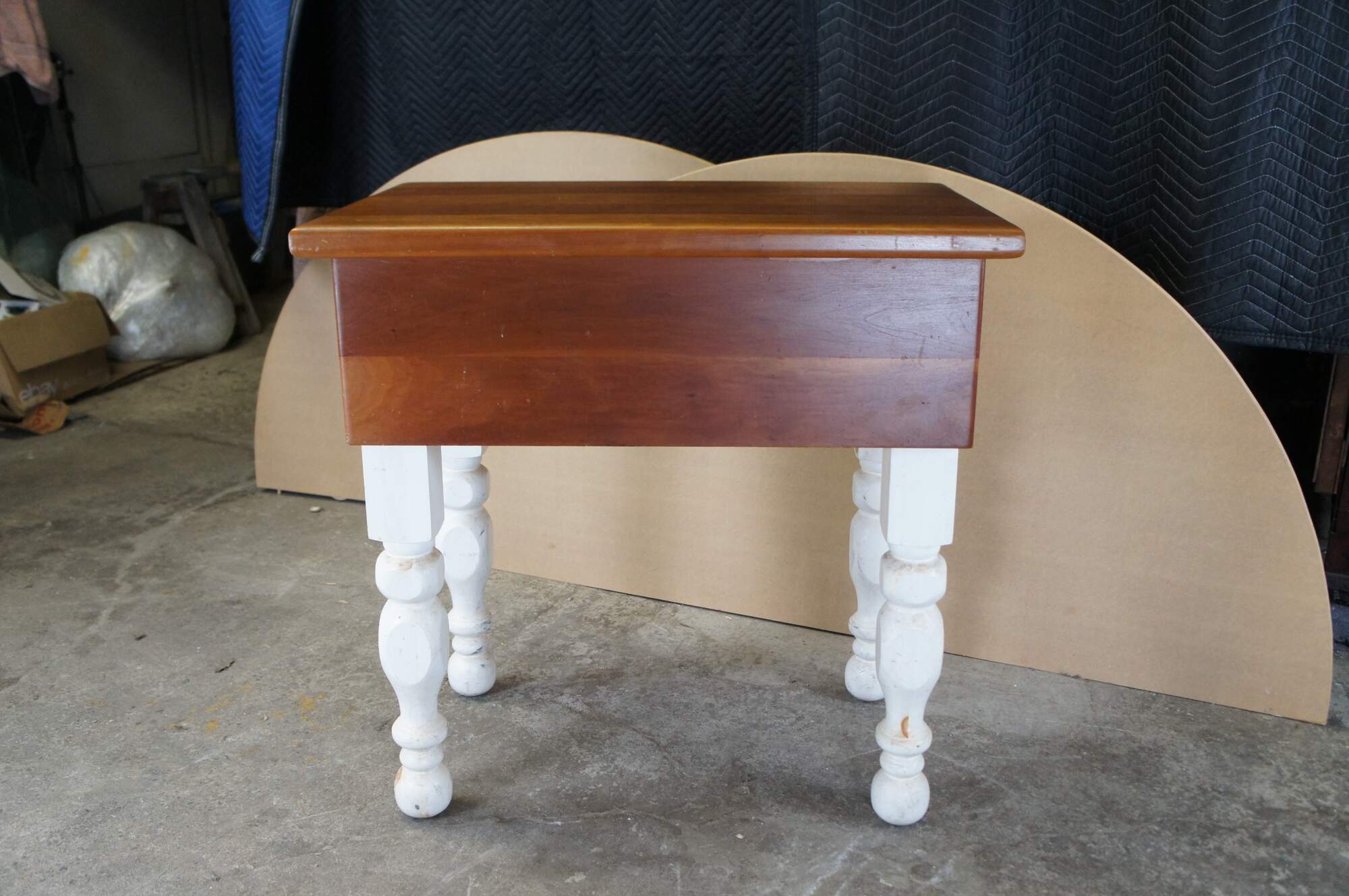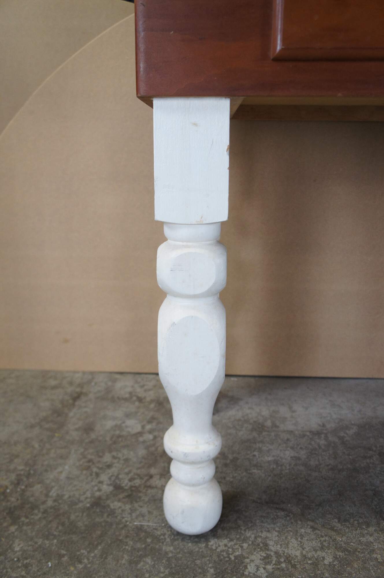 American Country Farmhouse Table or Island. Made from Cherry and pine with painted legs. The table has a large central drawer with porcelain knob. The intended purpose / use would have been a kitchen island, serving stand or cutting area. The sides have cutouts for utensils to hang.