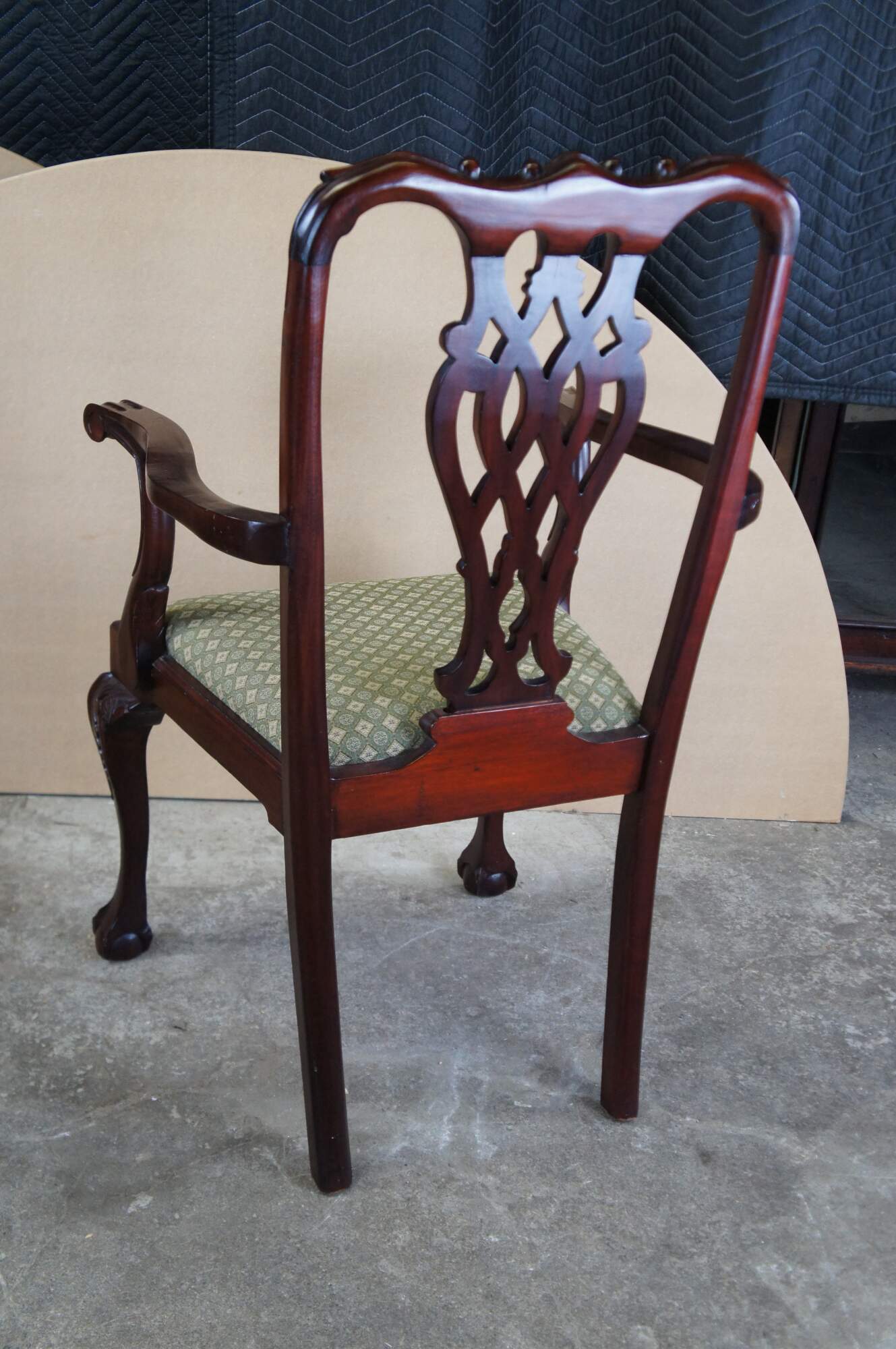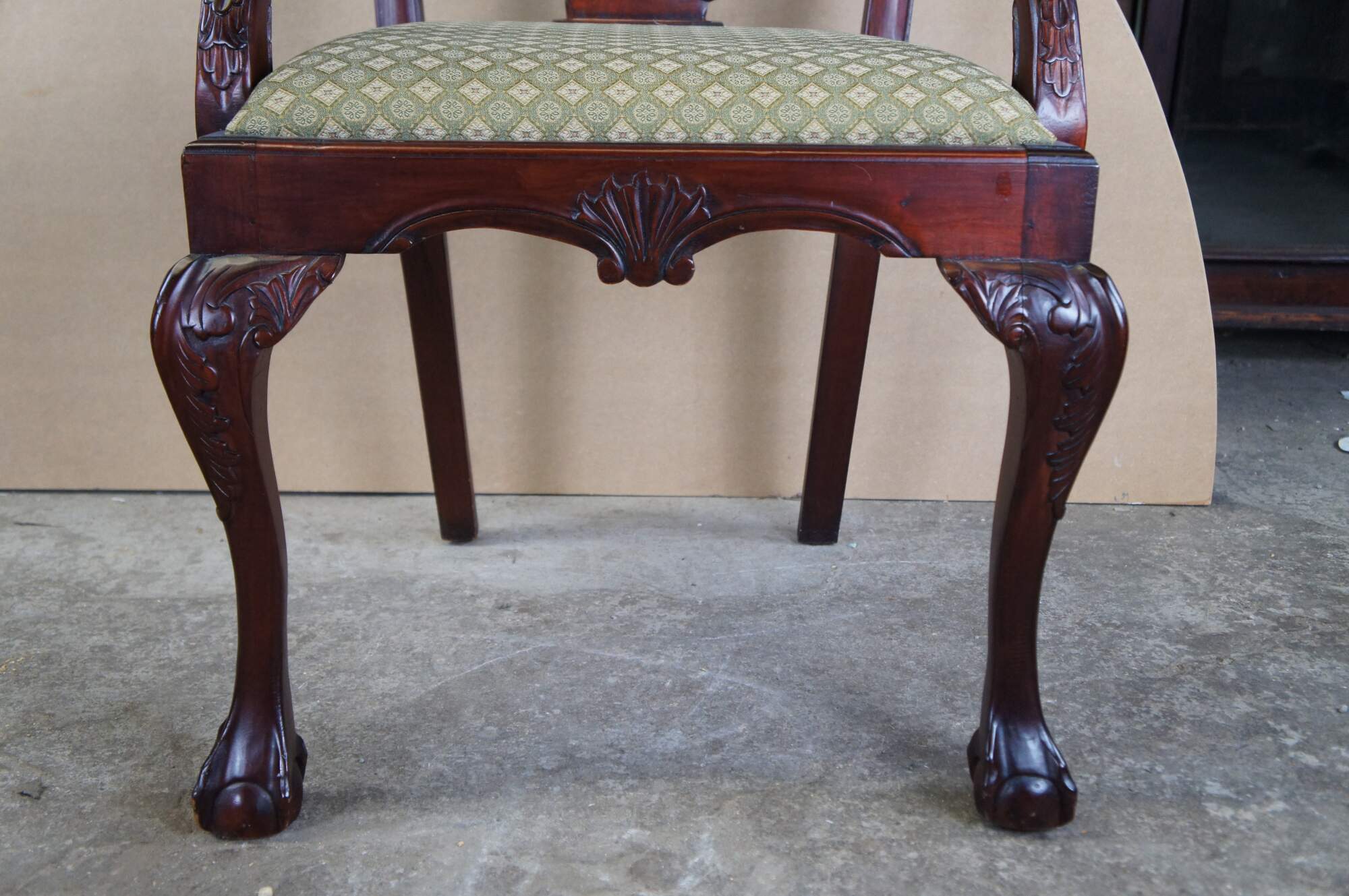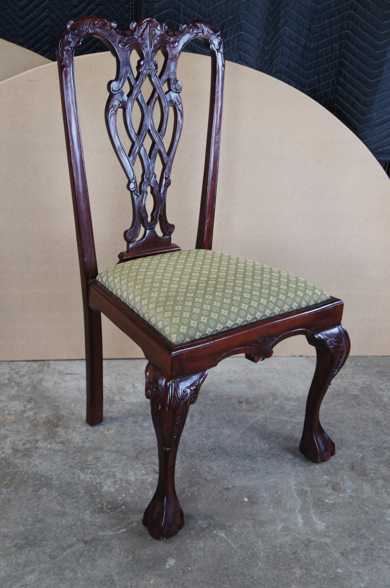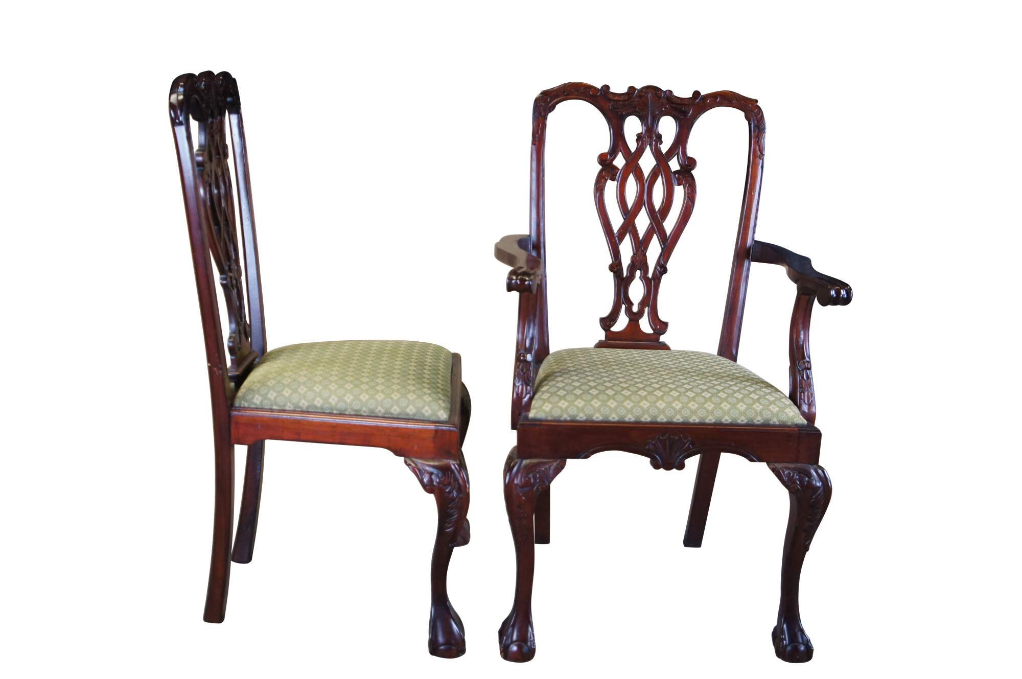 Set of 8 Chippendale style dining chairs, circa 2000s. Made from Indonesian Mahogany with an acanthus carved crest rail, interlaced back splat, geometric upholstered seat and cabriole legs leading to ball and claw feet.