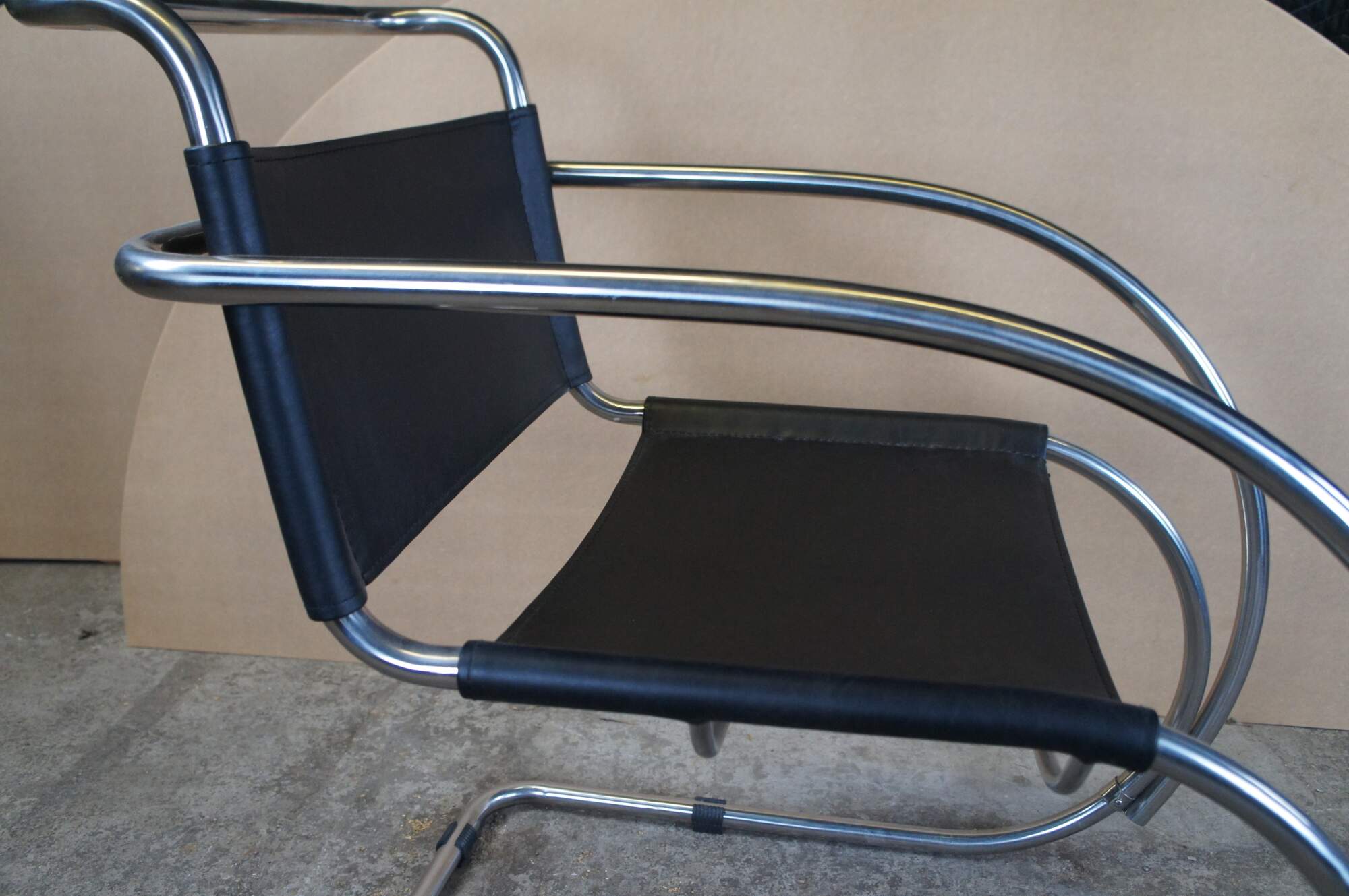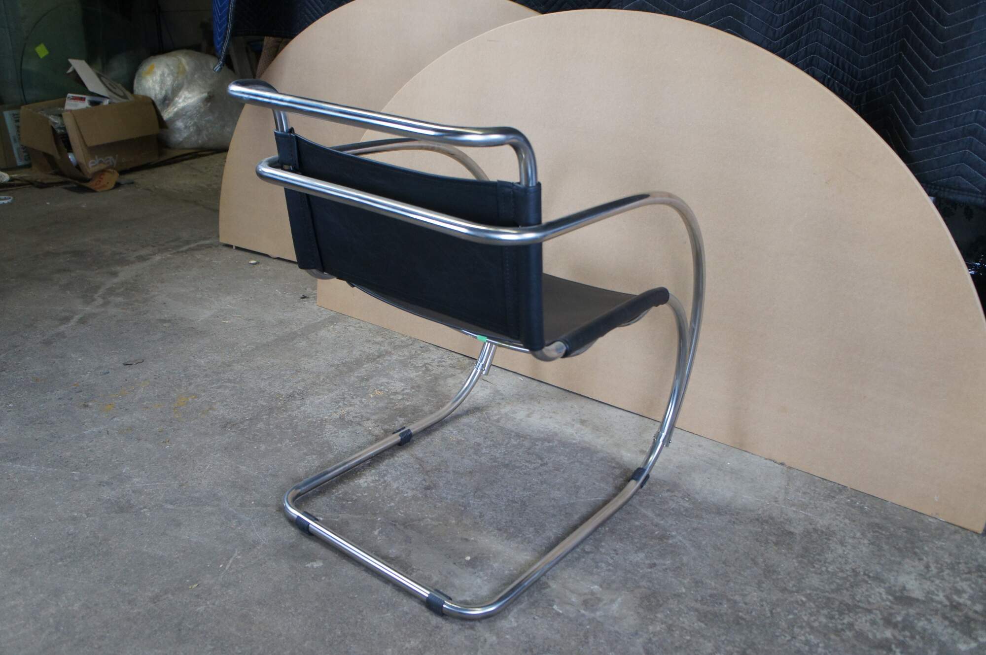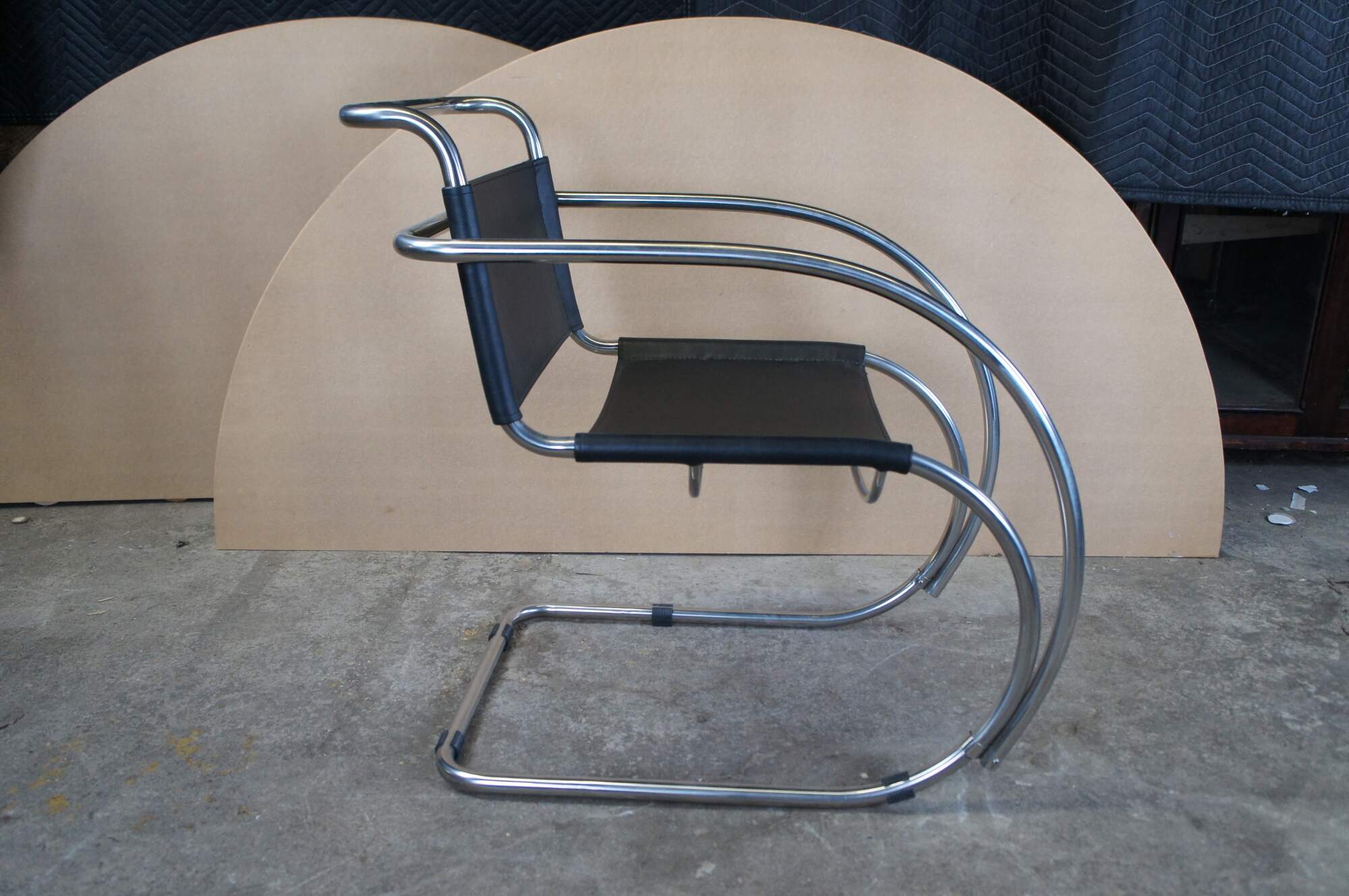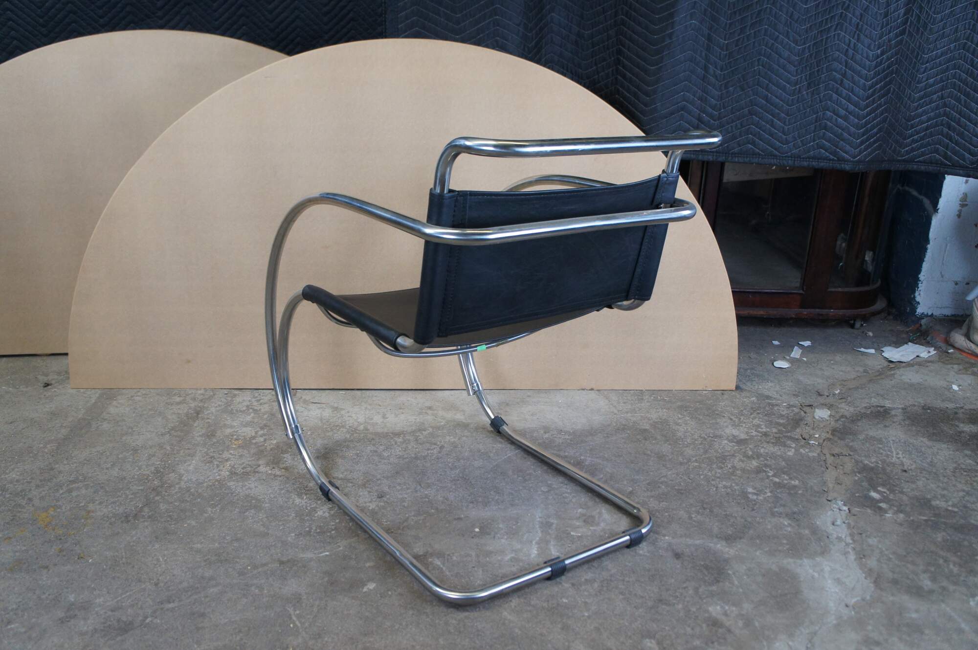 Pair of Restoration Hardware Cantilevered Arm Chairs, circa 2010s. Designed after the iconic Italian MR20 chair made by Ludwig Mies van der Rohe. Made from tubular stainless teel with chrome finishing and black leather seats. Made in China