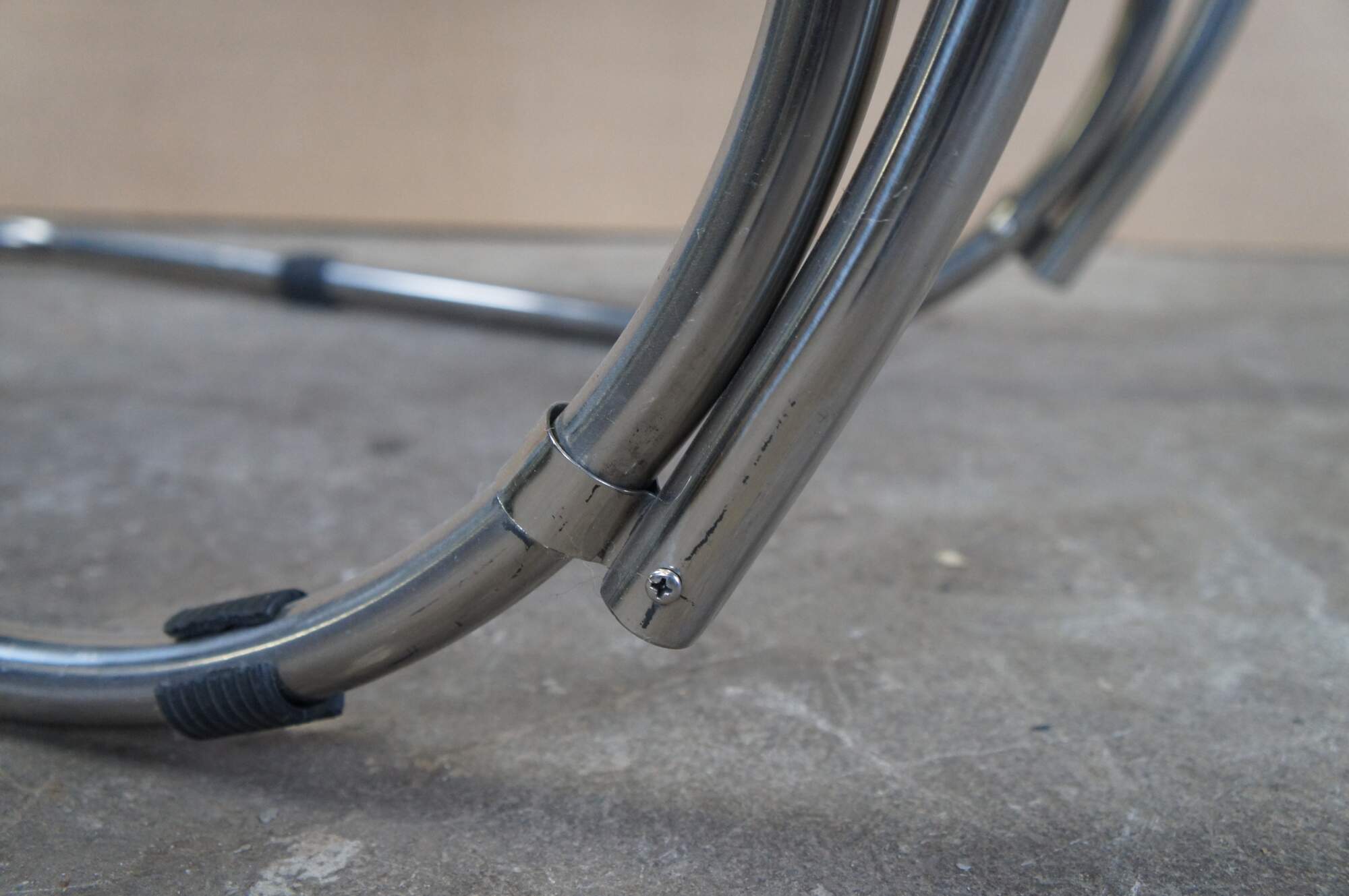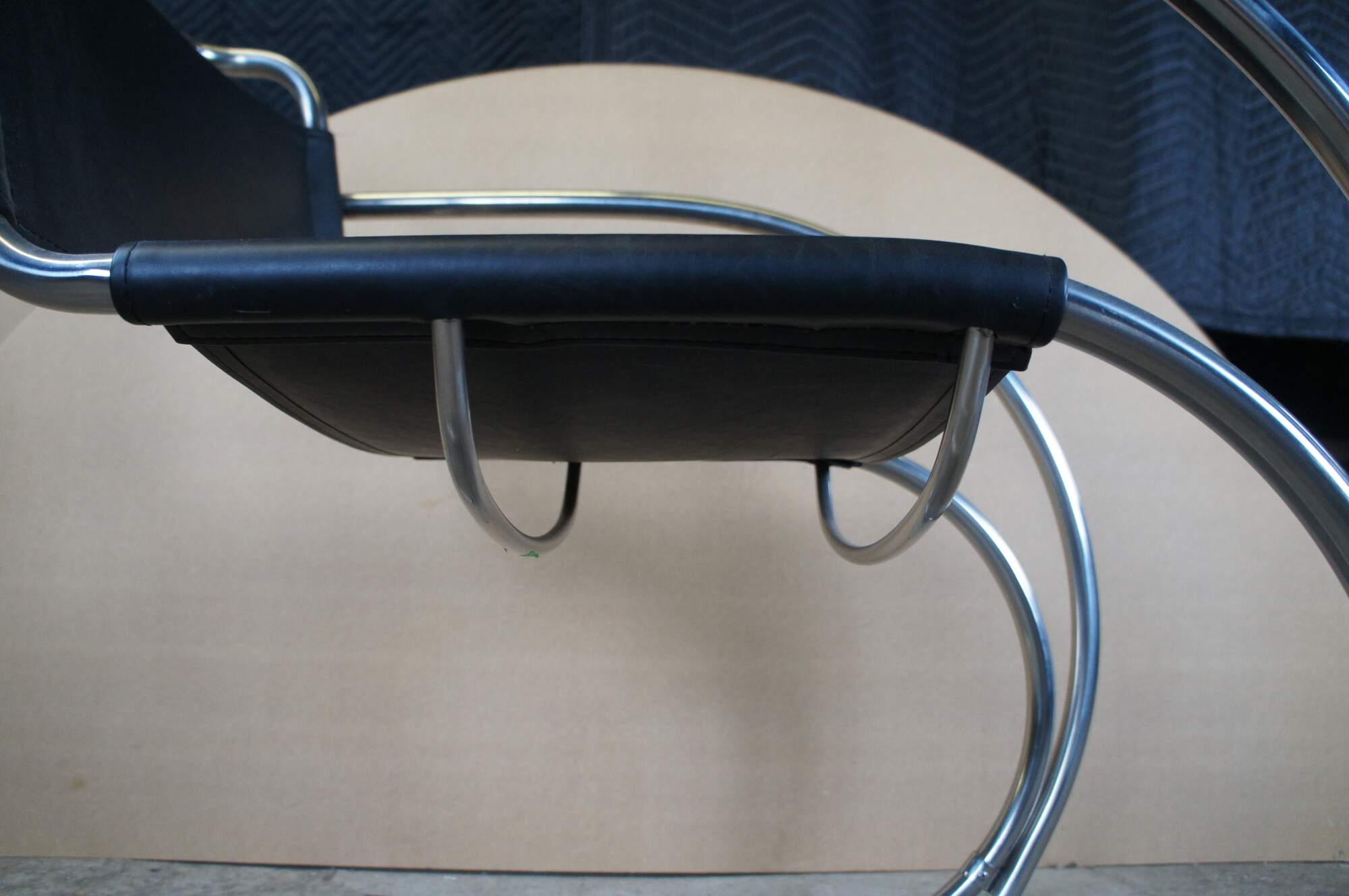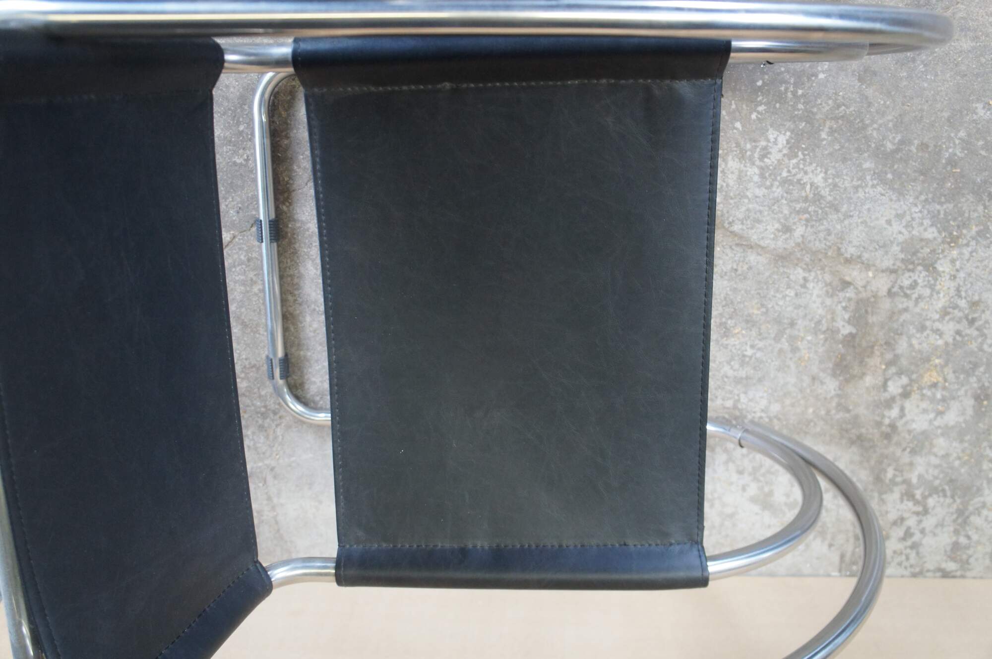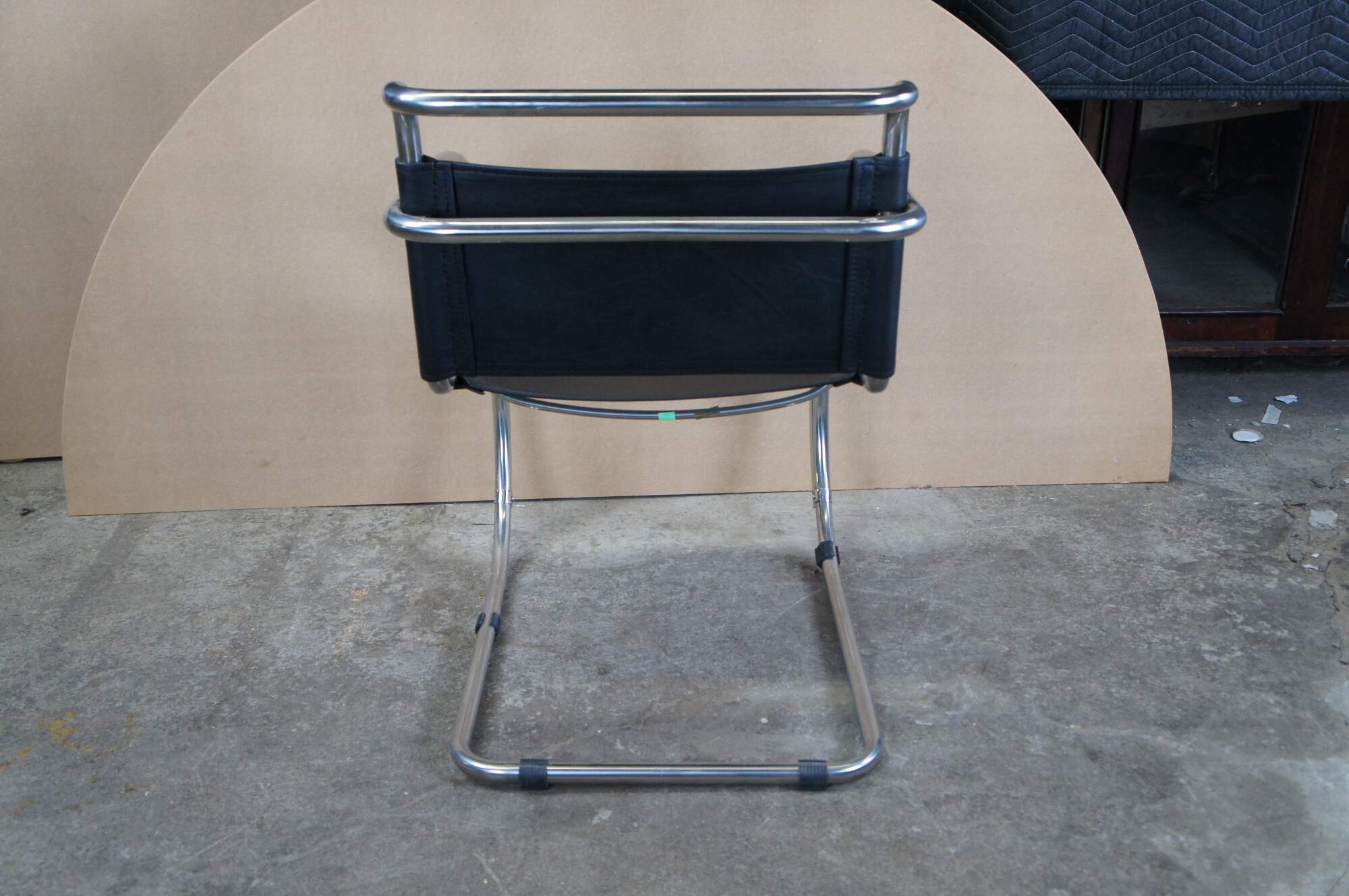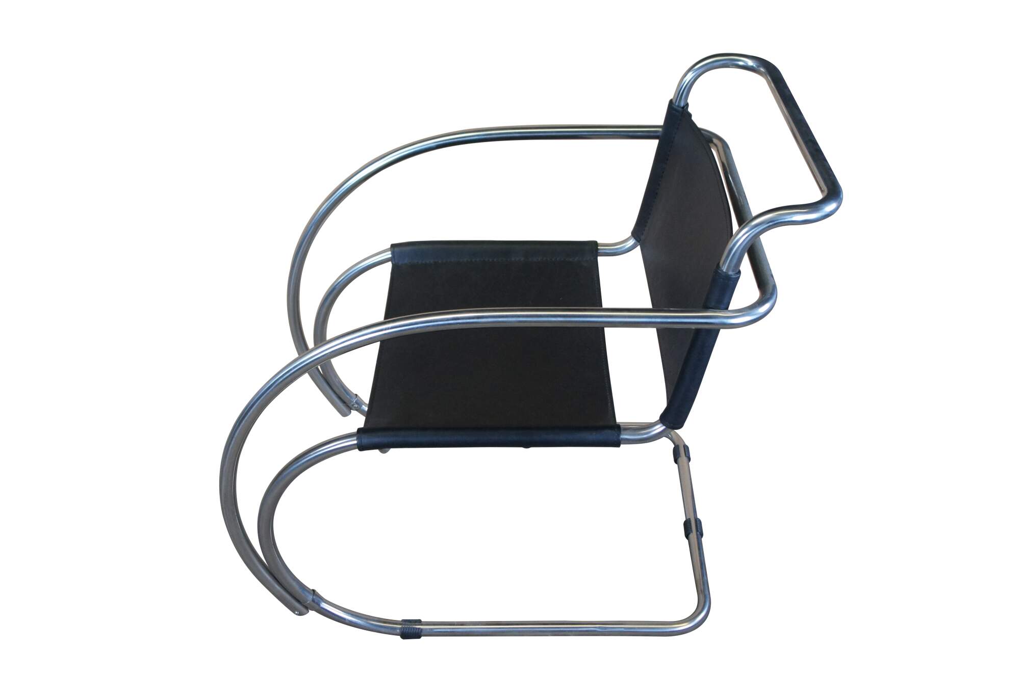 Pair of Restoration Hardware Cantilevered Arm Chairs, circa 2010s. Designed after the iconic Italian MR20 chair made by Ludwig Mies van der Rohe. Made from tubular stainless teel with chrome finishing and black leather seats. Made in China
