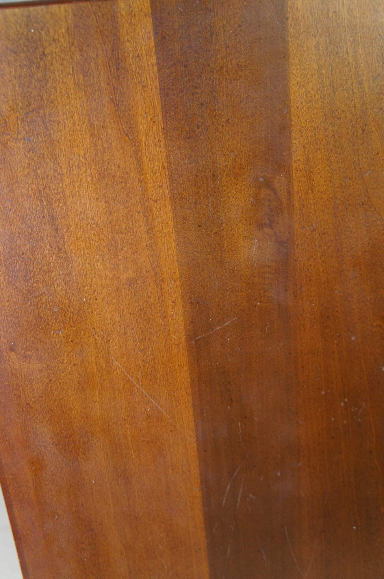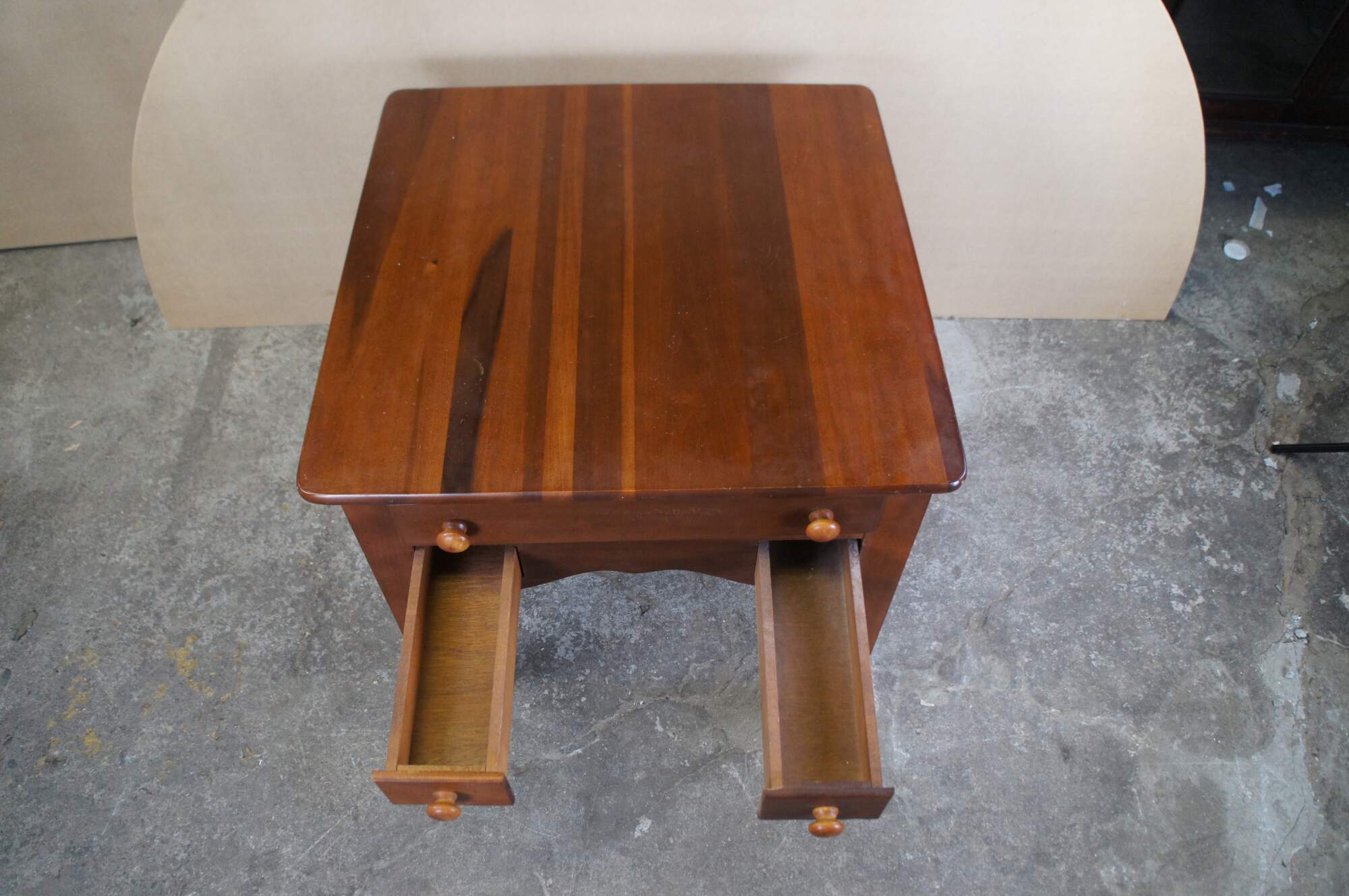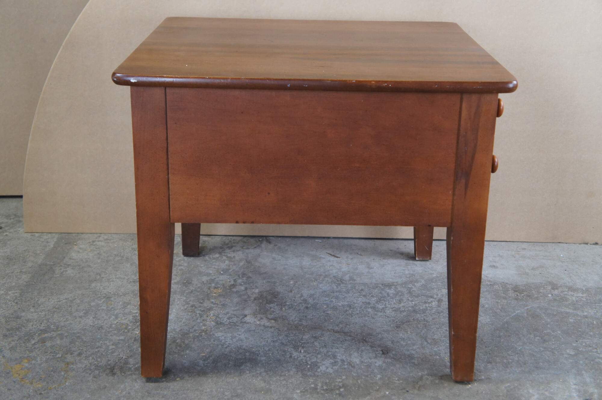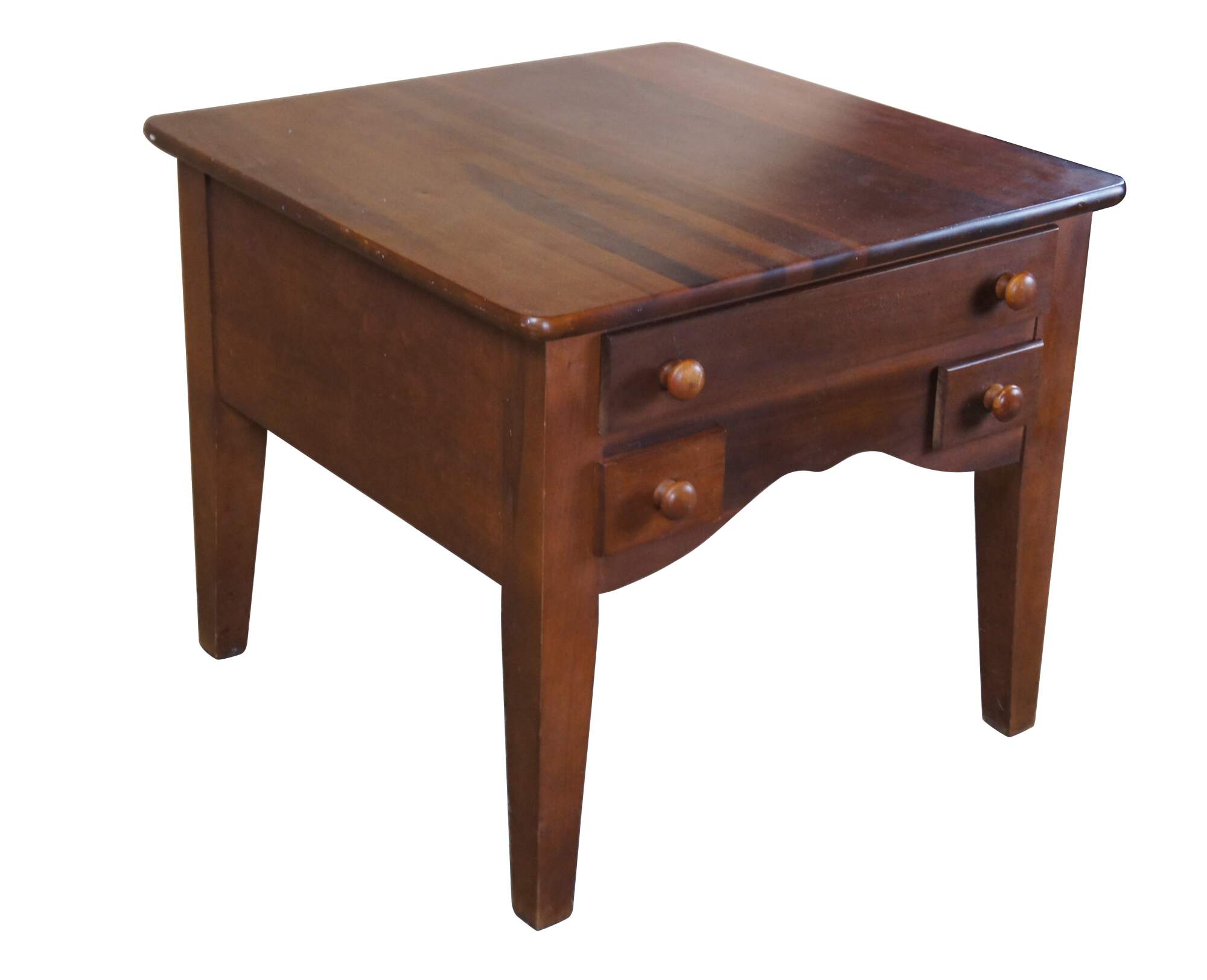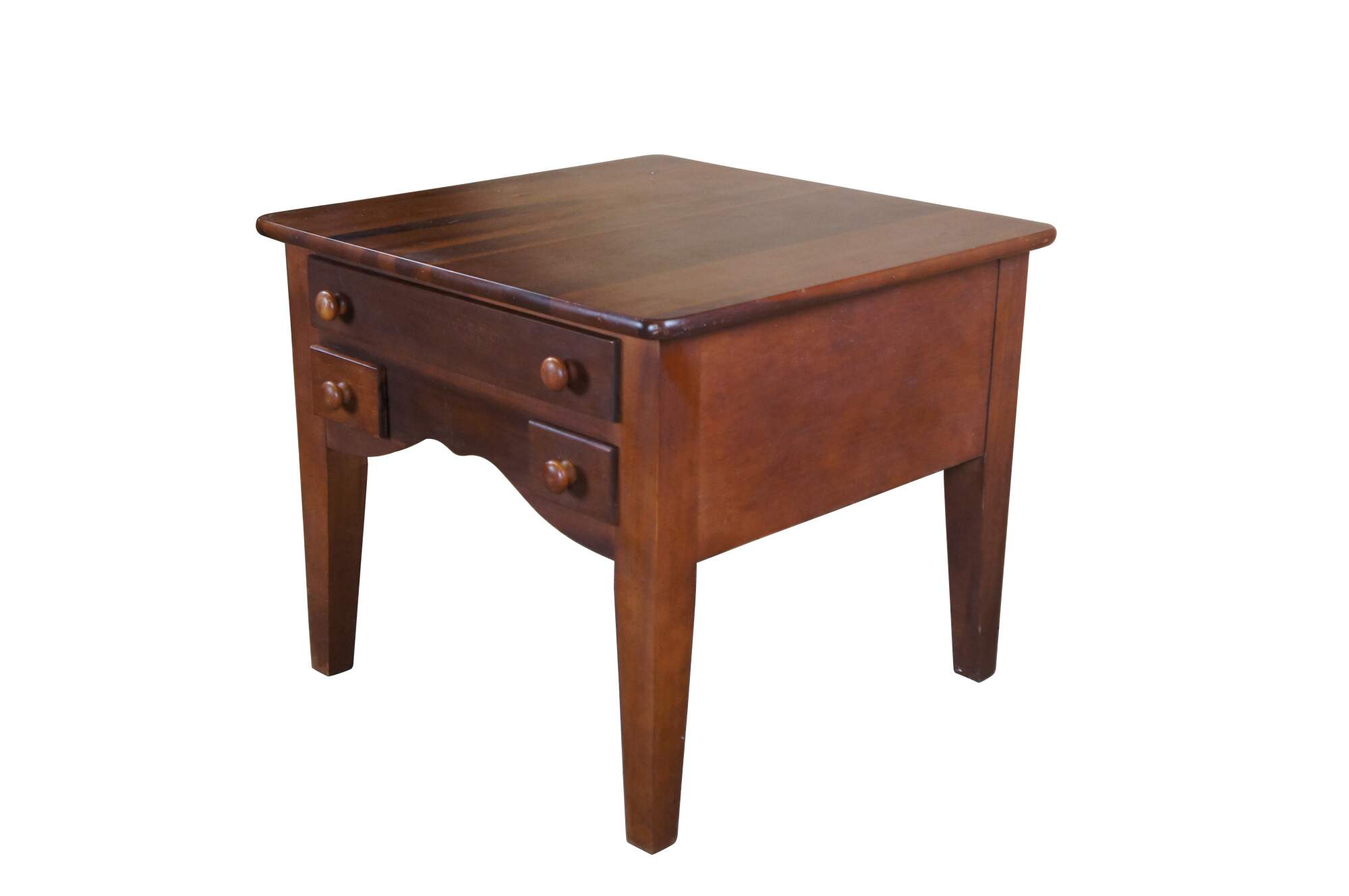 Vintage American Country Farmhouse Cherry Finished Bedside End Table. Features a rectangular frame with a large upper drawer over two smaller drawers. Lower apron is serpentine between square tapered legs.