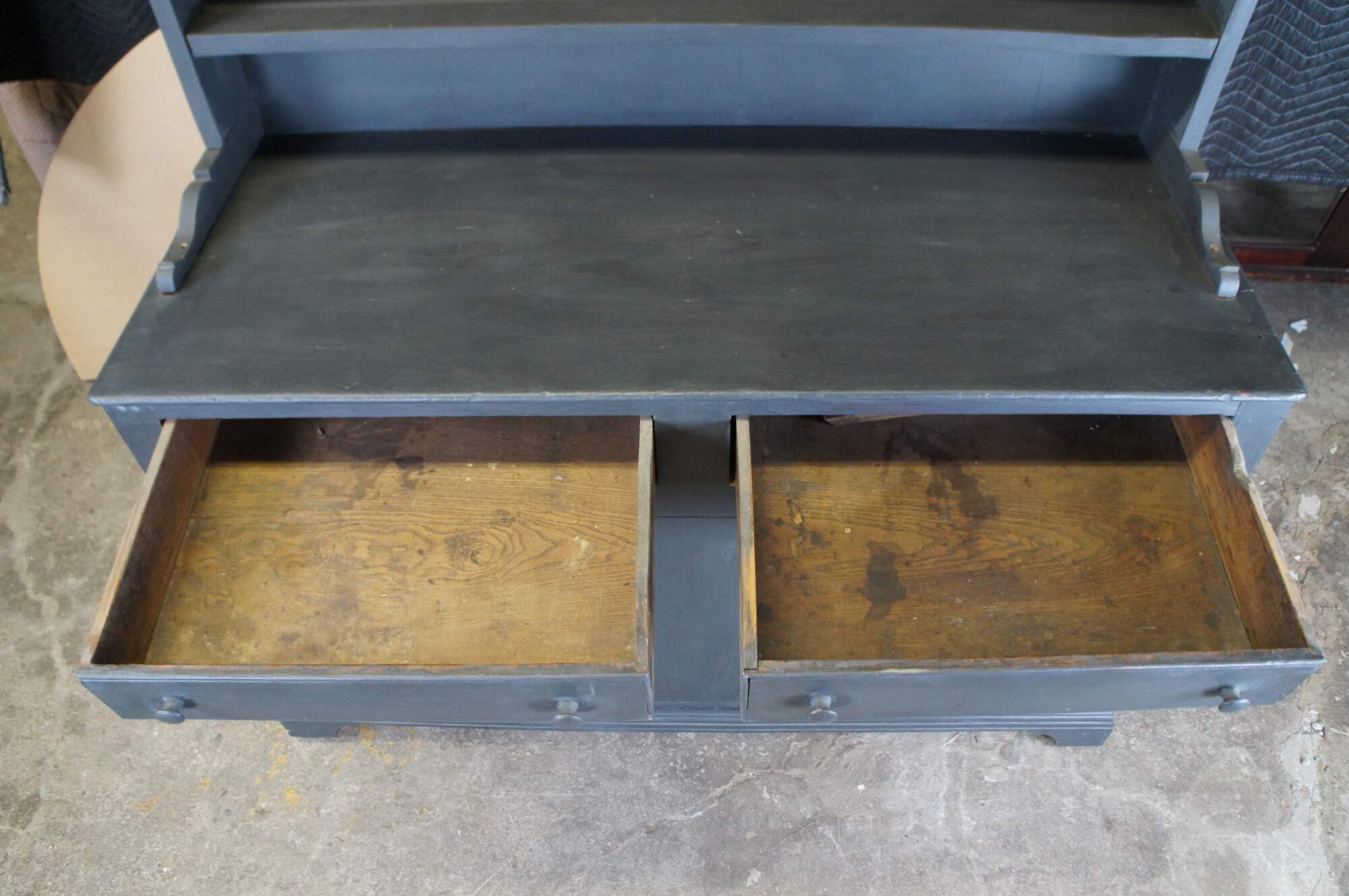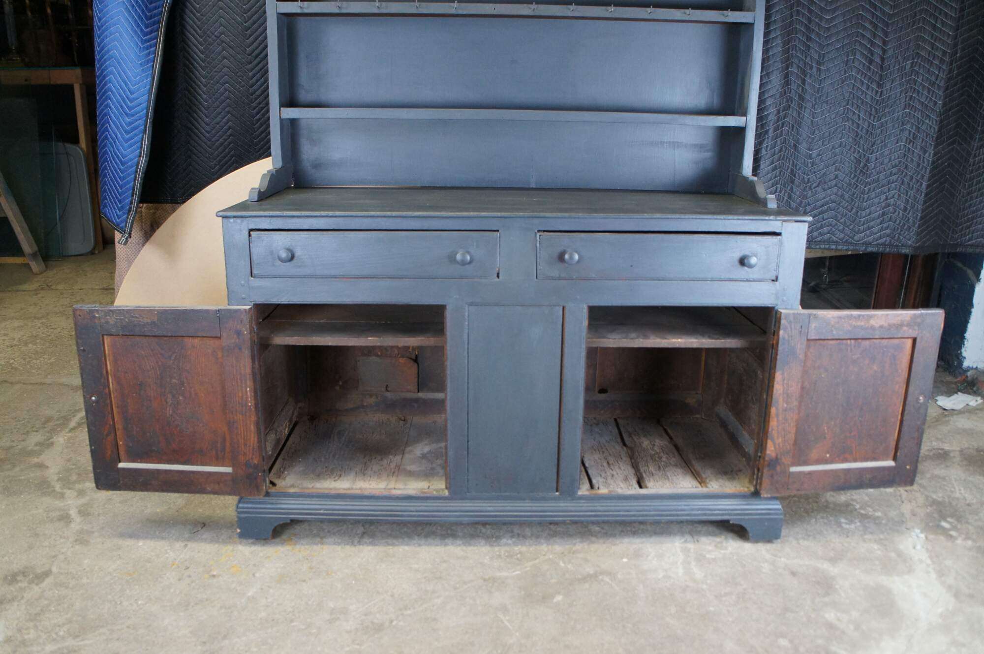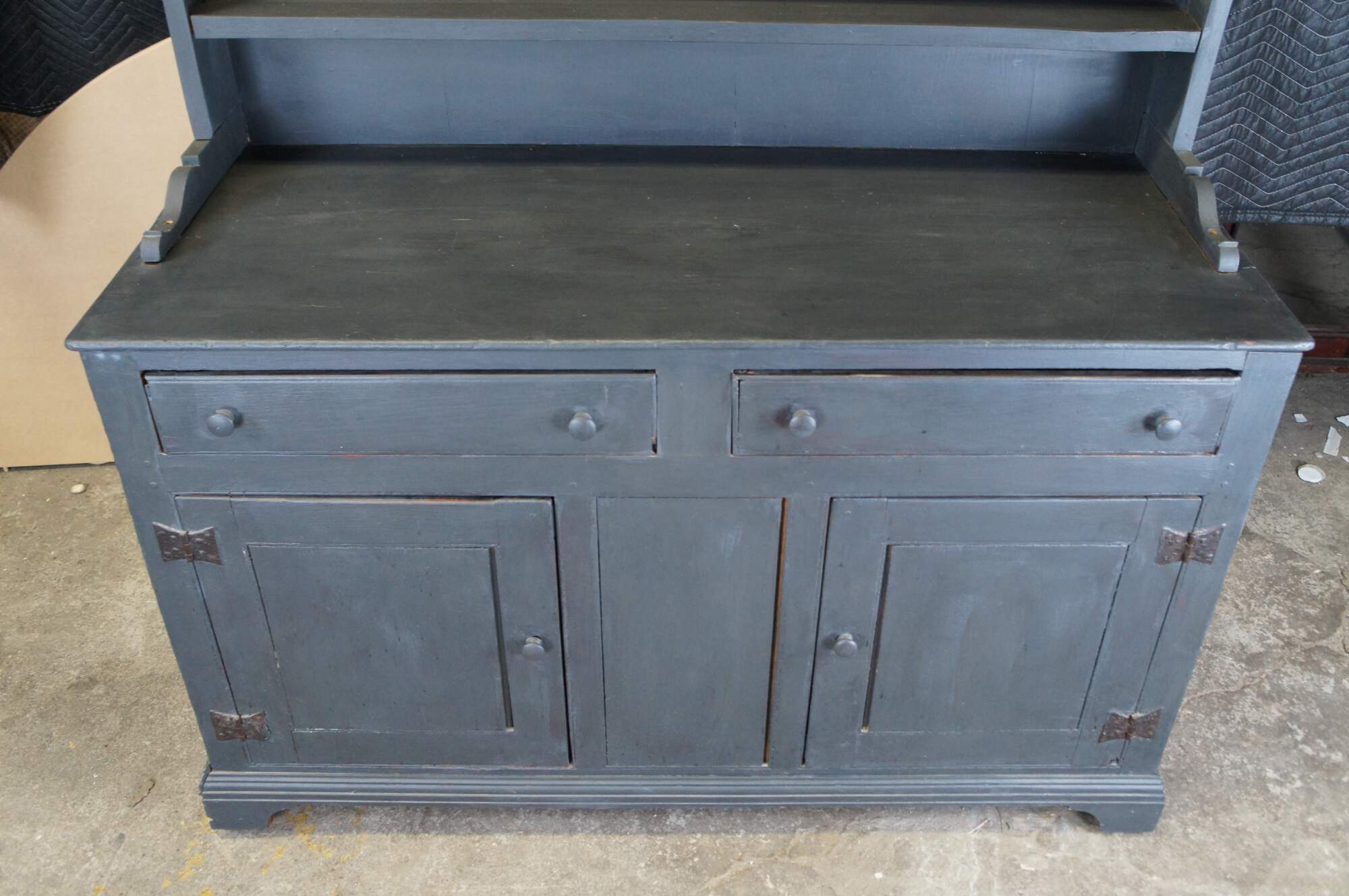 Fair; structurally solid, distressing, and age-related wear. Wormholes, marks, past repairs, and scuffs. One hook missing on the hutch.
