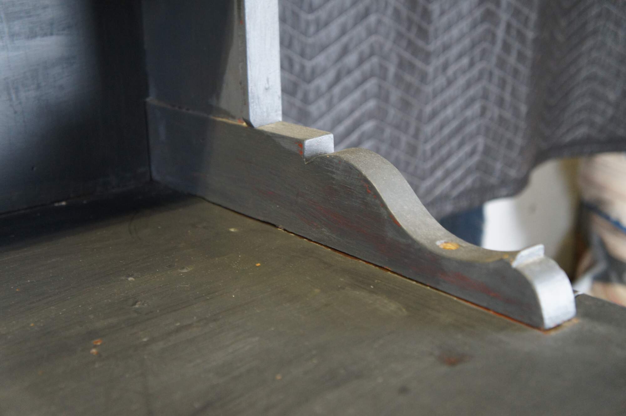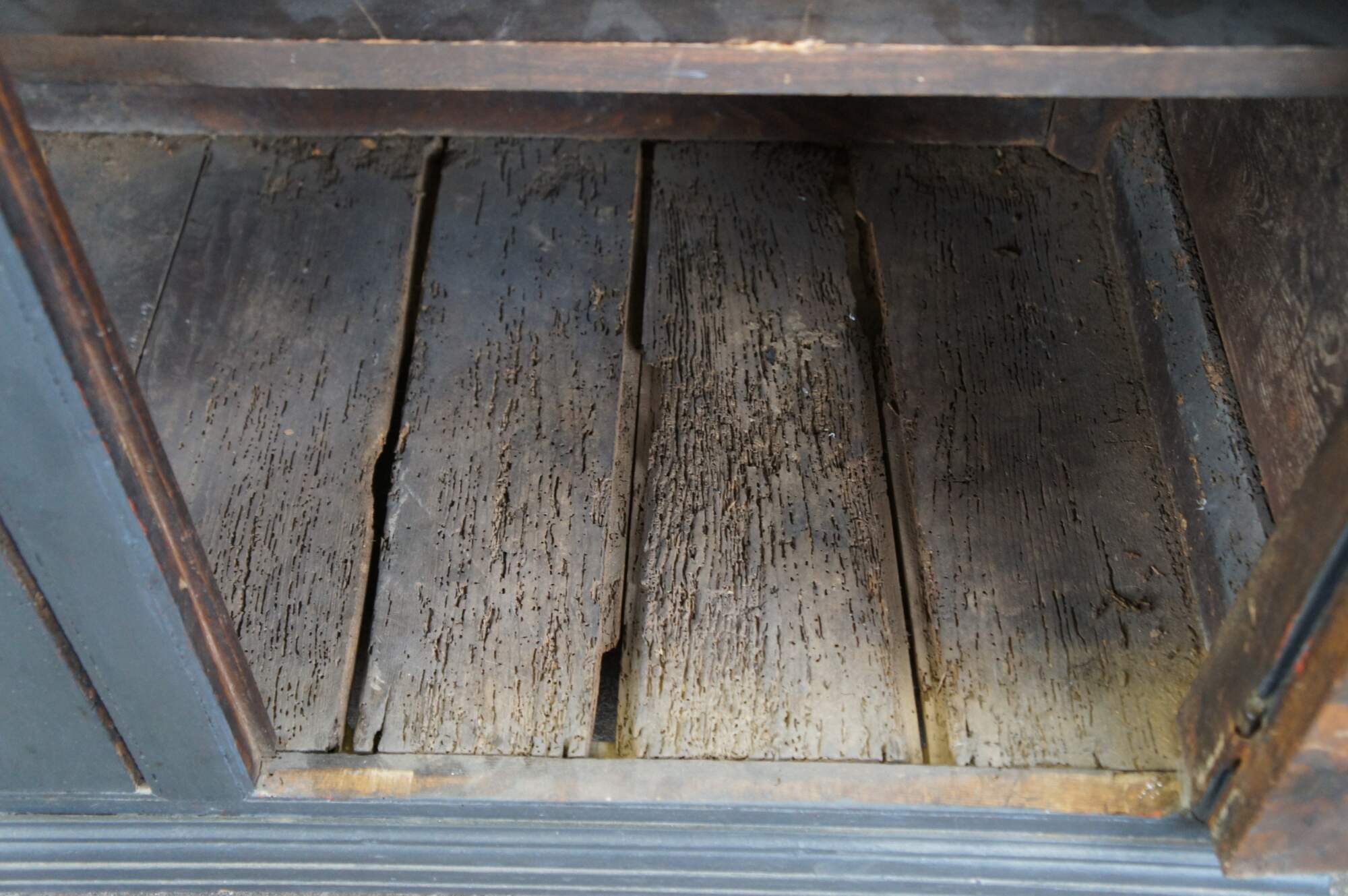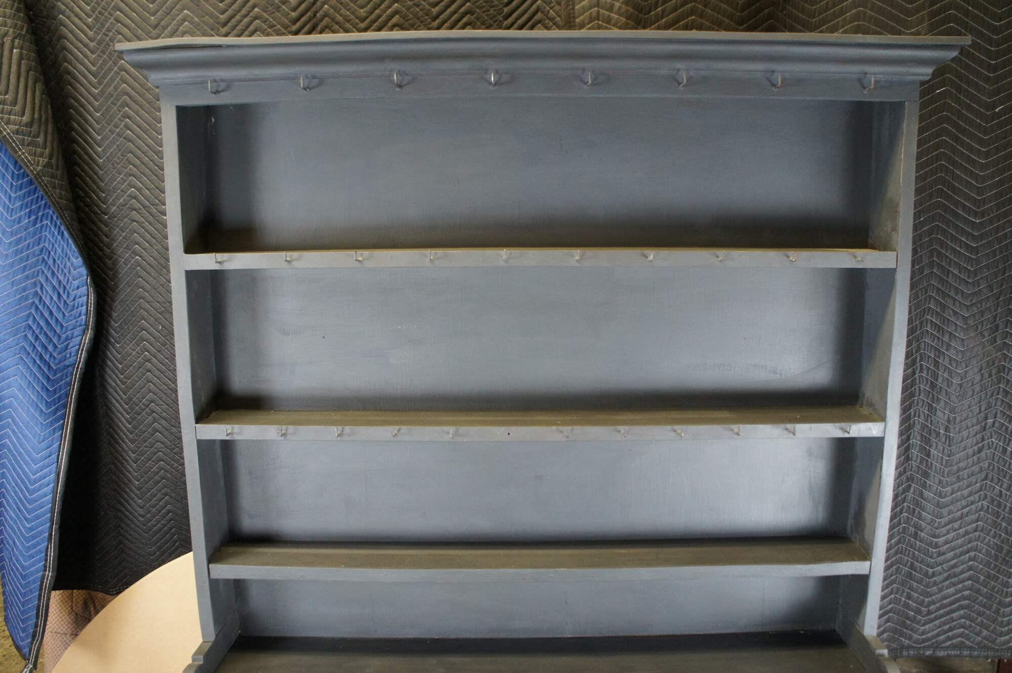 Fair; structurally solid, distressing, and age-related wear. Wormholes, marks, past repairs, and scuffs. One hook missing on the hutch.