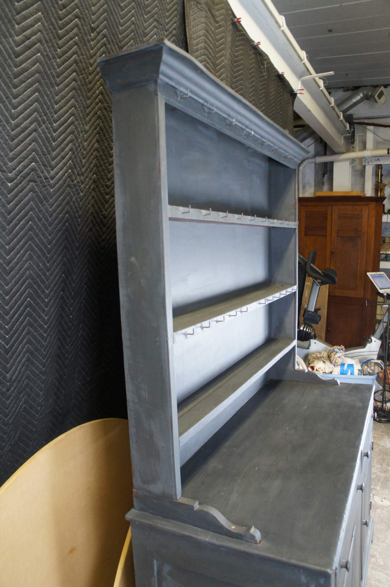 Late 18th century to early 19th century Welsh Dresser or pewter cupboard. Made from oak with a gray painted finish. Features an upper hutch or rack with three shelves and metal hooks for pans and utensils over a paneled base with two drawers and a lower cabinet with a shelf. The cabinet is supported by bracket feet. The hutch portion is a later 20th century addition to the piece. The base has an incredible patina and character. Mortise and tenon construction. Look at the interior of the lower cabinet to see the centuries-old boards along the bottom.