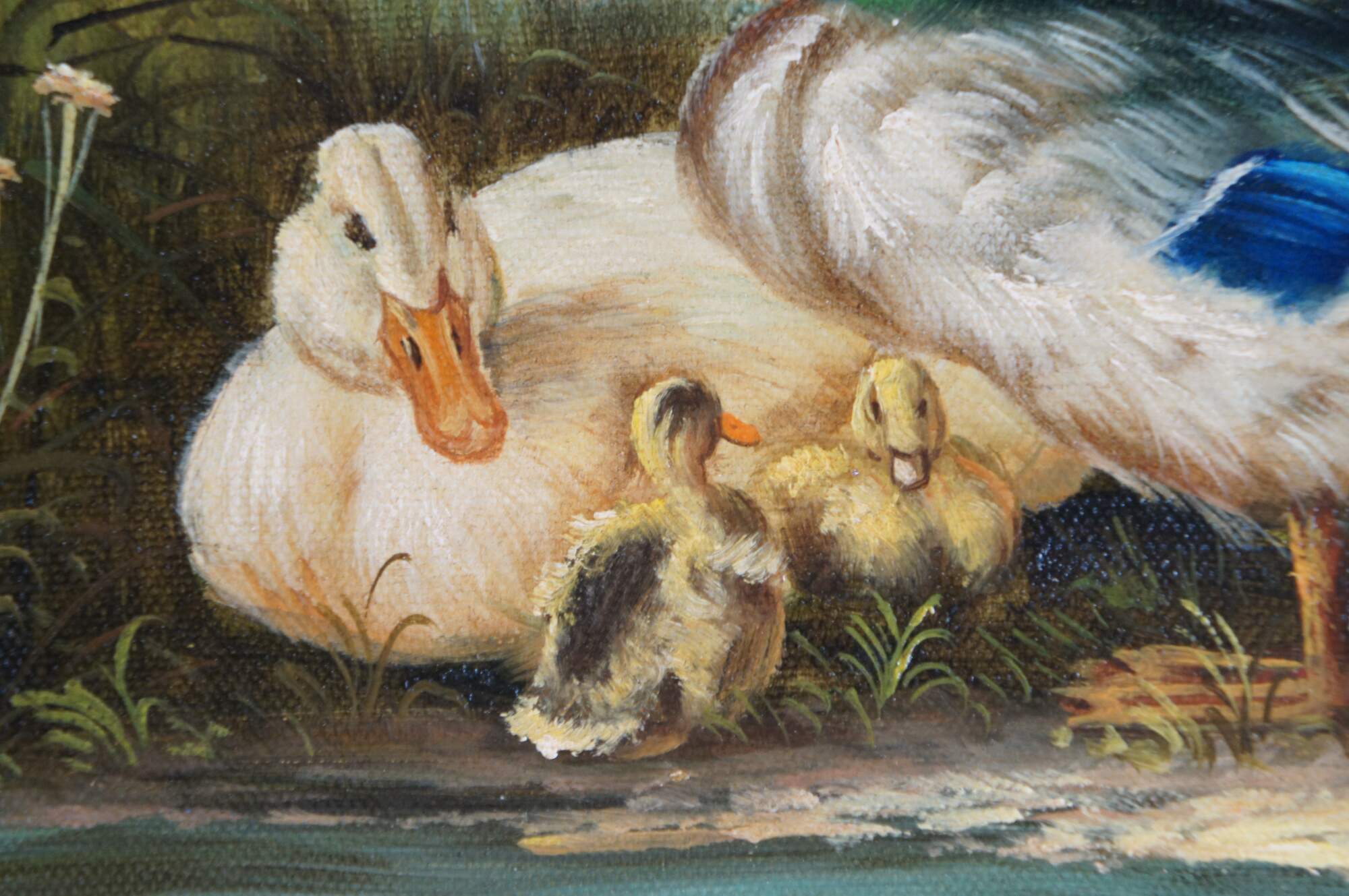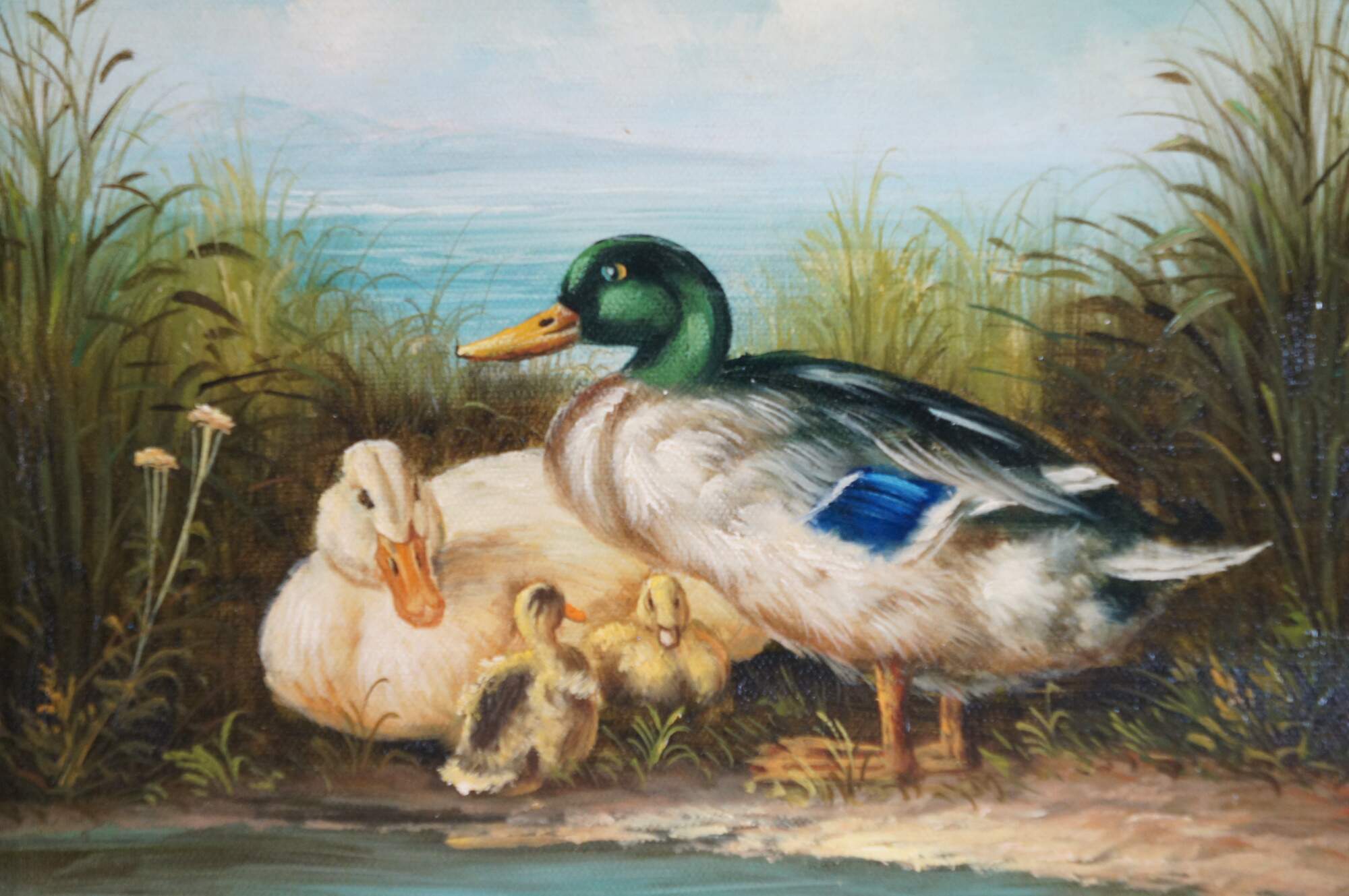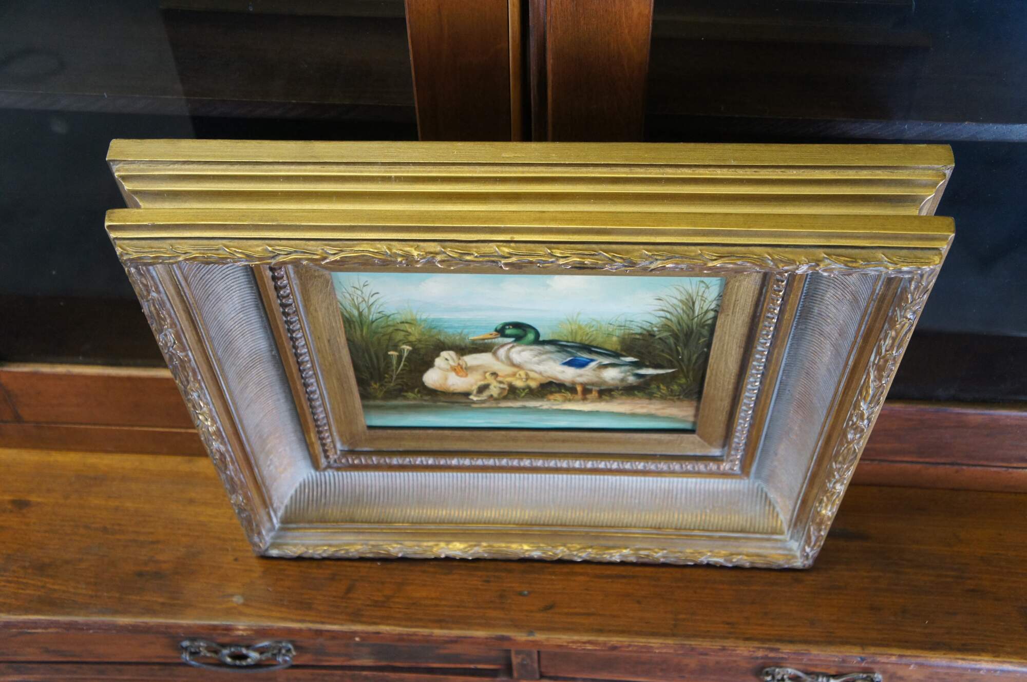 A charming oil painting depicting a tranquil pond scene featuring ducks and ducklings, reminiscent of classic farmhouse art. The painting, likely from the last quarter of the 20th century, captures a serene moment by the water with lush greenery in the background. Signed by the artist, this oil painting is on canvas and is beautifully framed in an ornate wooden frame with a gold finish and decorative leaf border. A perfect addition to rustic or country-style décor.