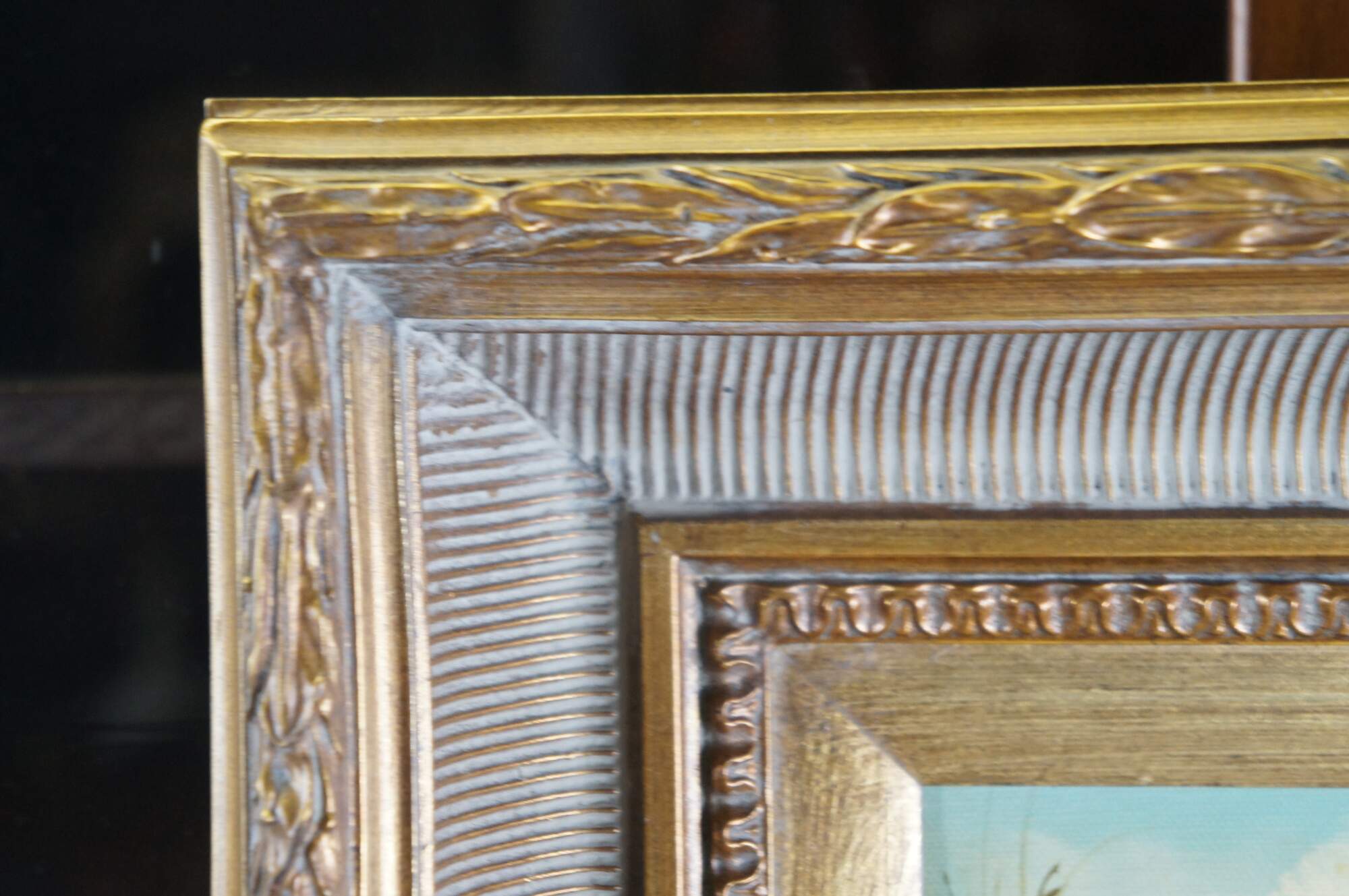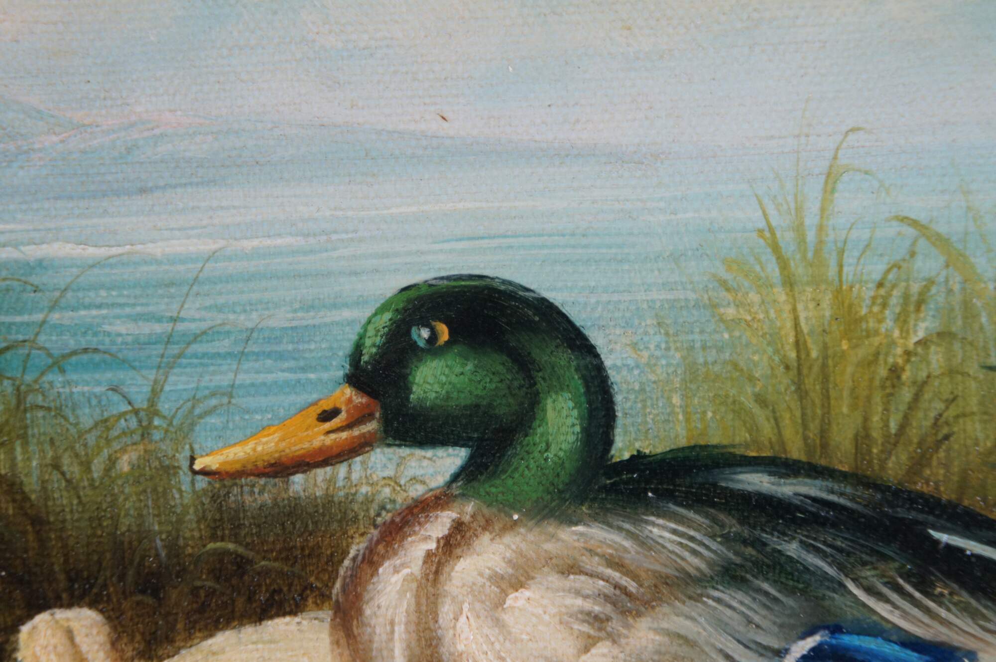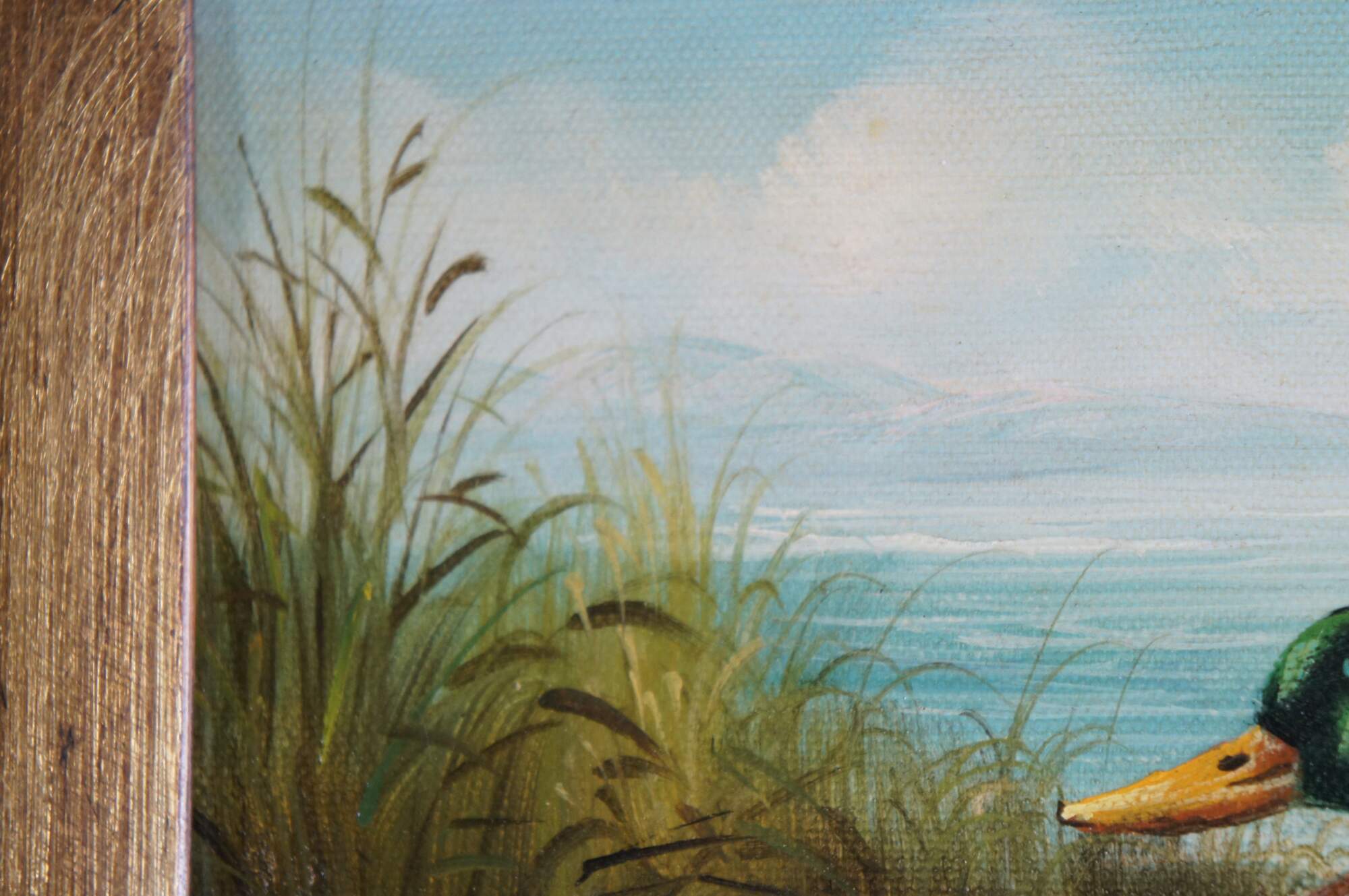 A charming oil painting depicting a tranquil pond scene featuring ducks and ducklings, reminiscent of classic farmhouse art. The painting, likely from the last quarter of the 20th century, captures a serene moment by the water with lush greenery in the background. Signed by the artist, this oil painting is on canvas and is beautifully framed in an ornate wooden frame with a gold finish and decorative leaf border. A perfect addition to rustic or country-style décor.