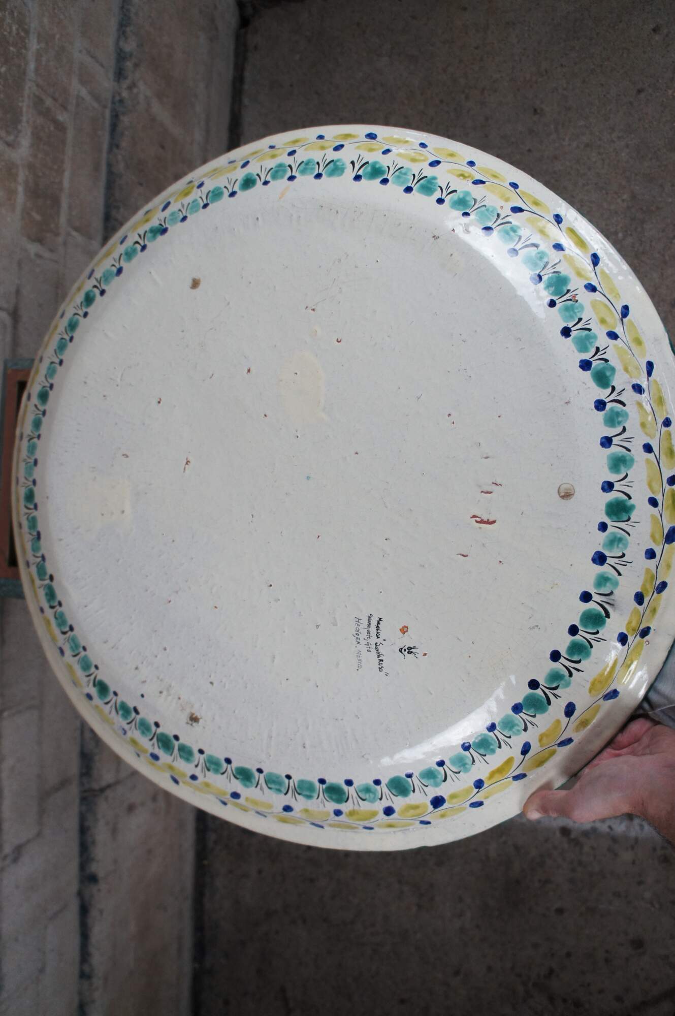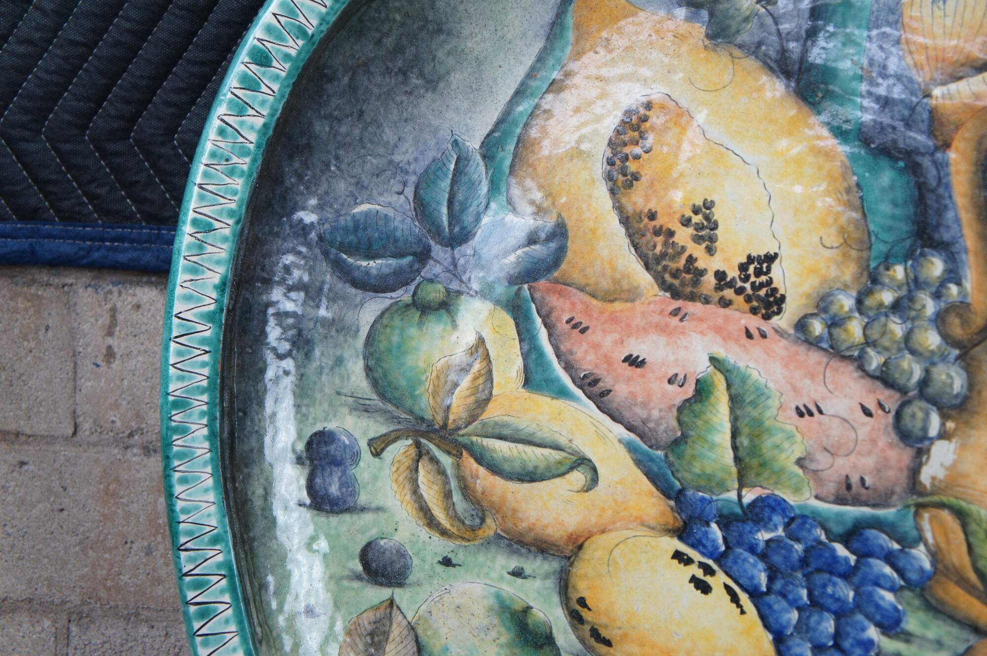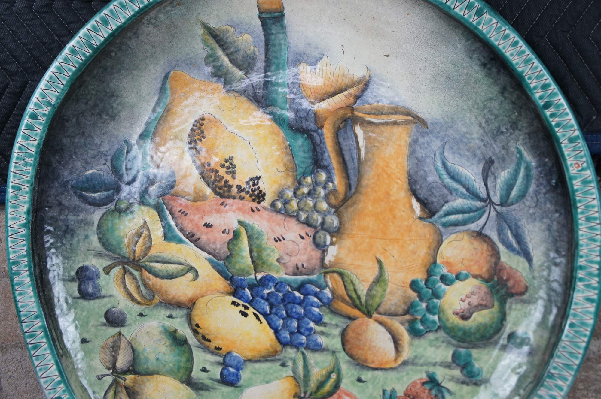 A very large and impressive 20th-century Mayolica Santa Rosa charger plate / platter / wall plaque featuring a design of a fruit - grapes, pears, apples, oranges, pomegranates, watermelon, peaches, cantaloupe, and vessels / pitcher and bottle. Made in Guanajuato City, Mexico.