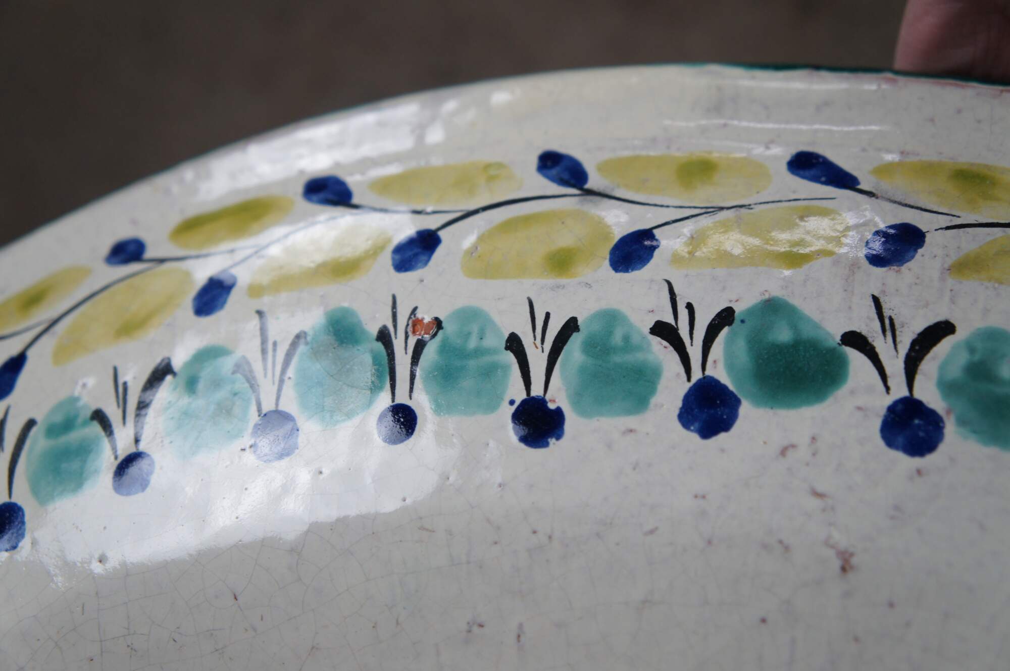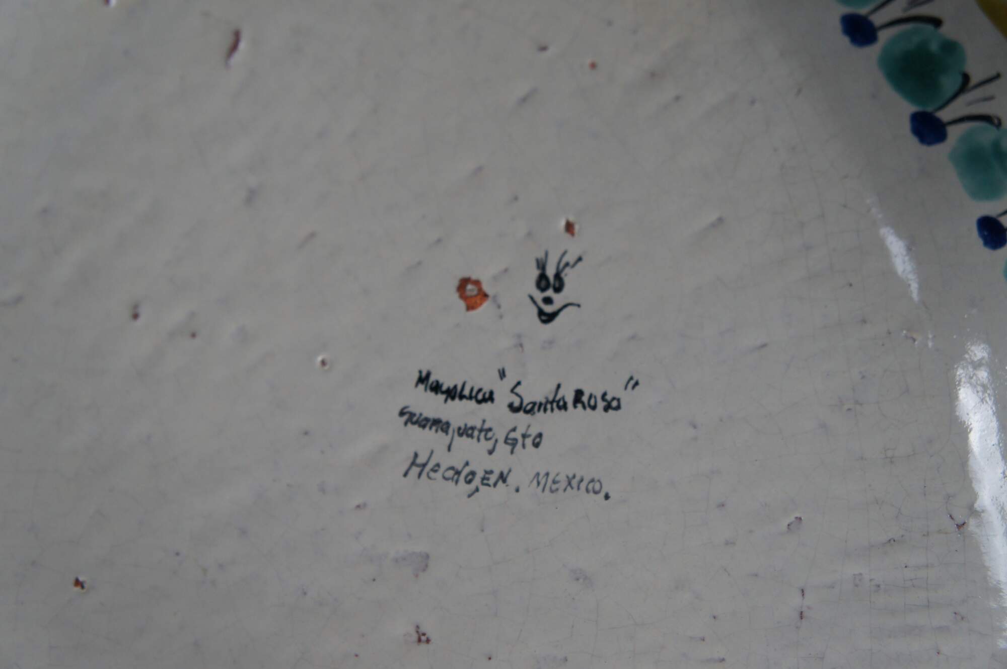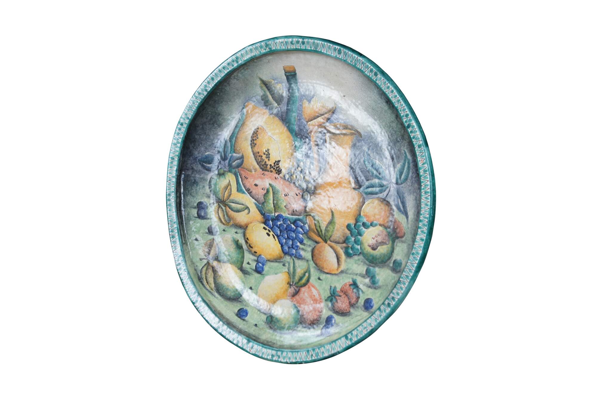 A very large and impressive 20th-century Mayolica Santa Rosa charger plate / platter / wall plaque featuring a design of a fruit - grapes, pears, apples, oranges, pomegranates, watermelon, peaches, cantaloupe, and vessels / pitcher and bottle. Made in Guanajuato City, Mexico.