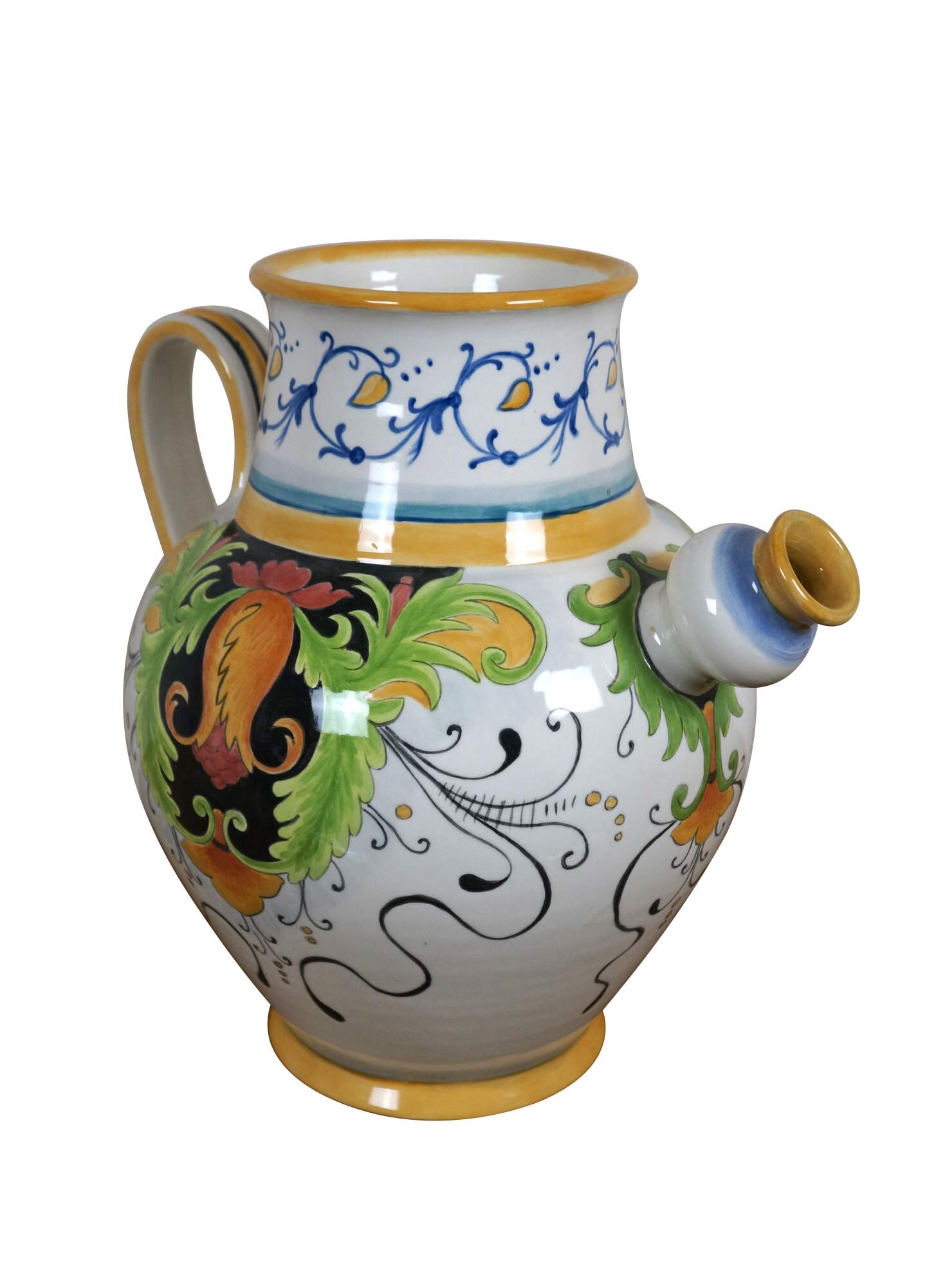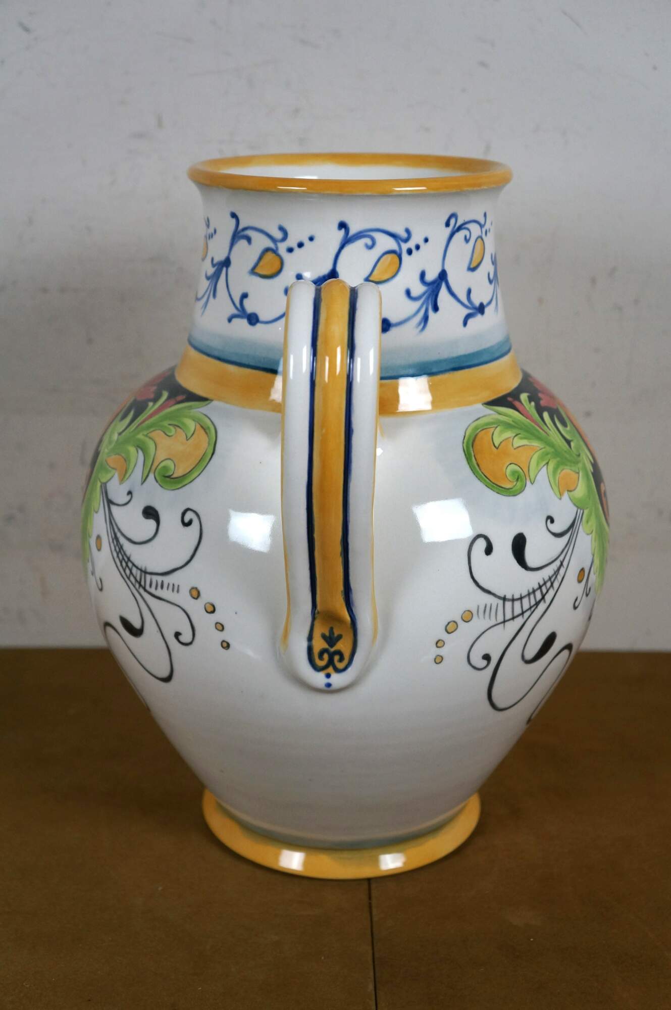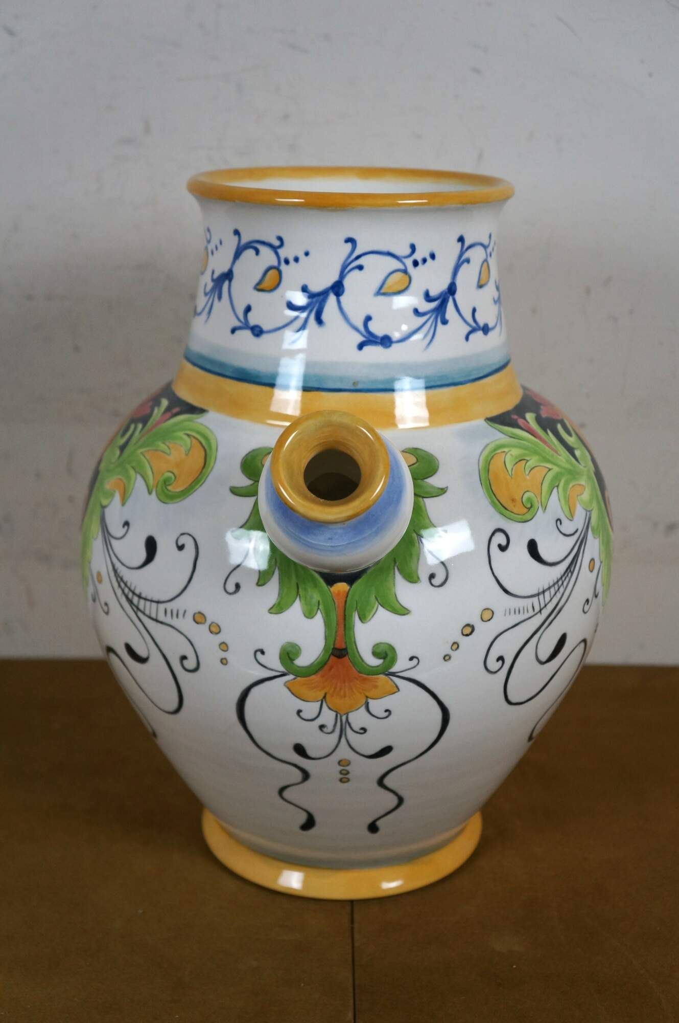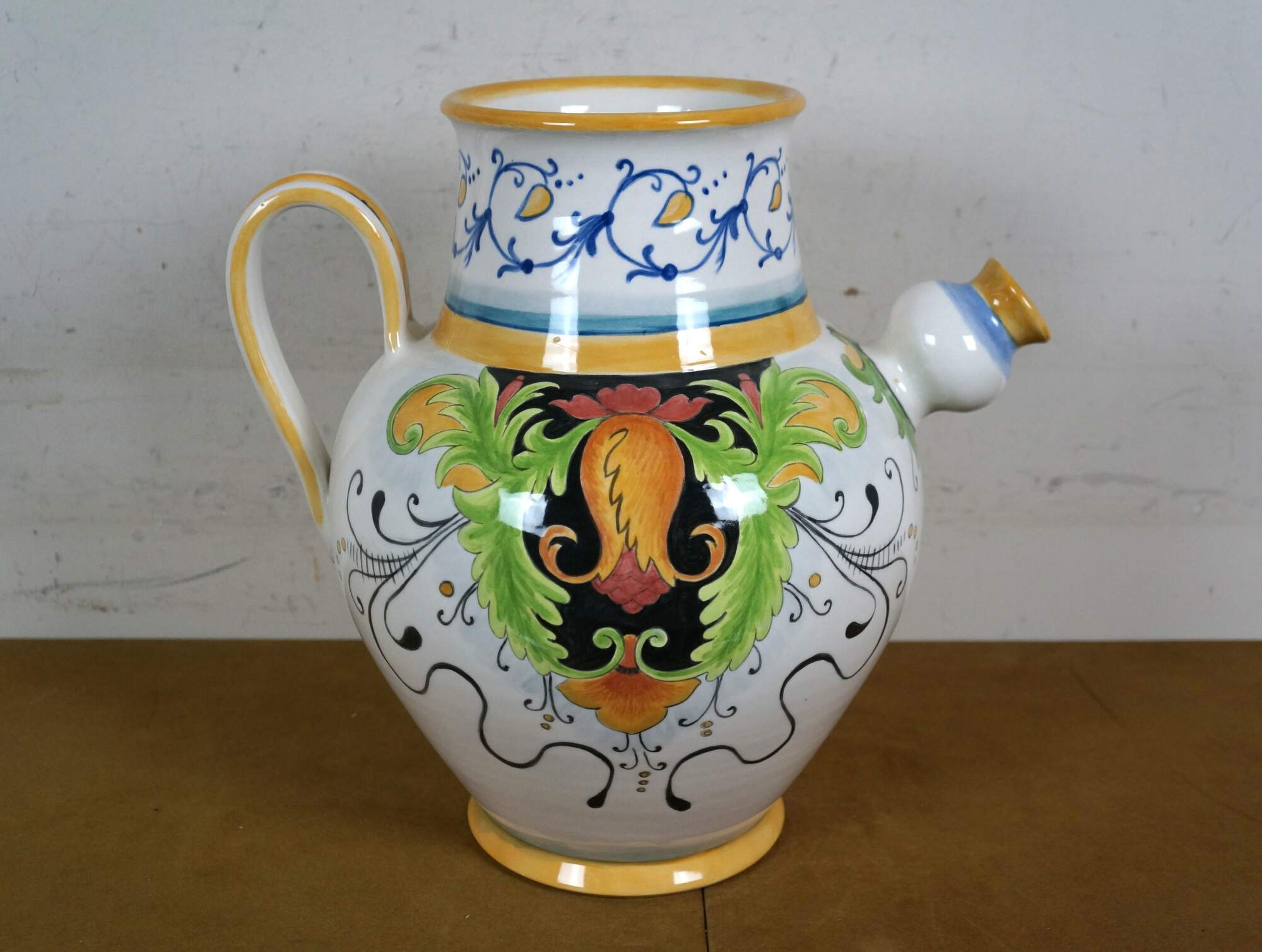 Italian Tuscan / Deruta / majolica style art pottery porcelain wine jug / urn, decorated with a green, yellow, and red tuscan foliate / blossom motif, trimmed with blue and yellow foliate designs. Signed Gatoukhova N 2012.