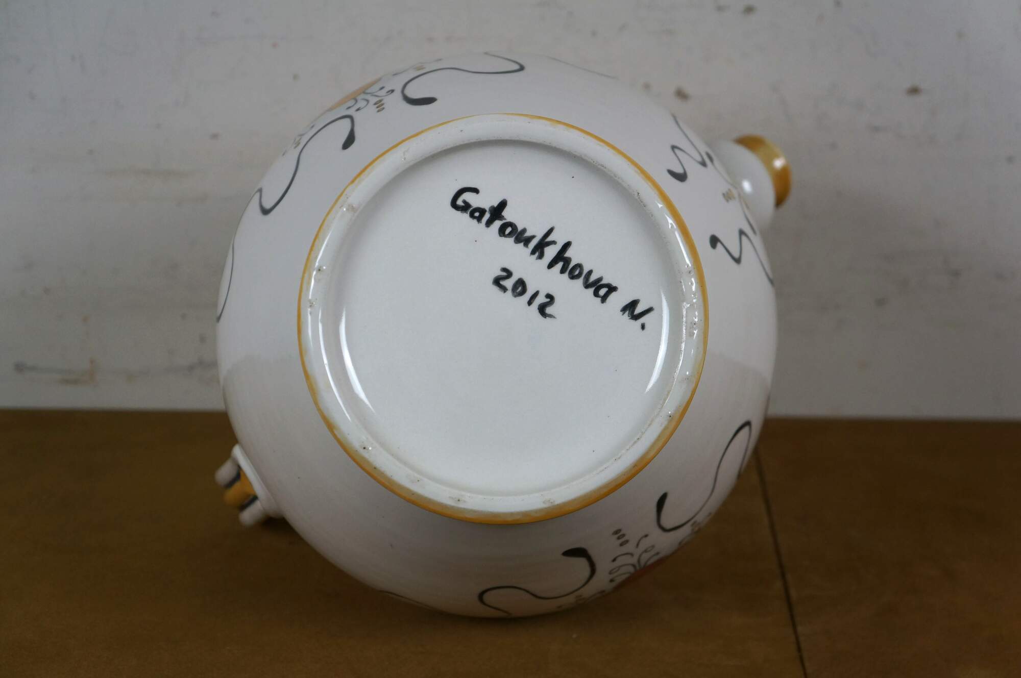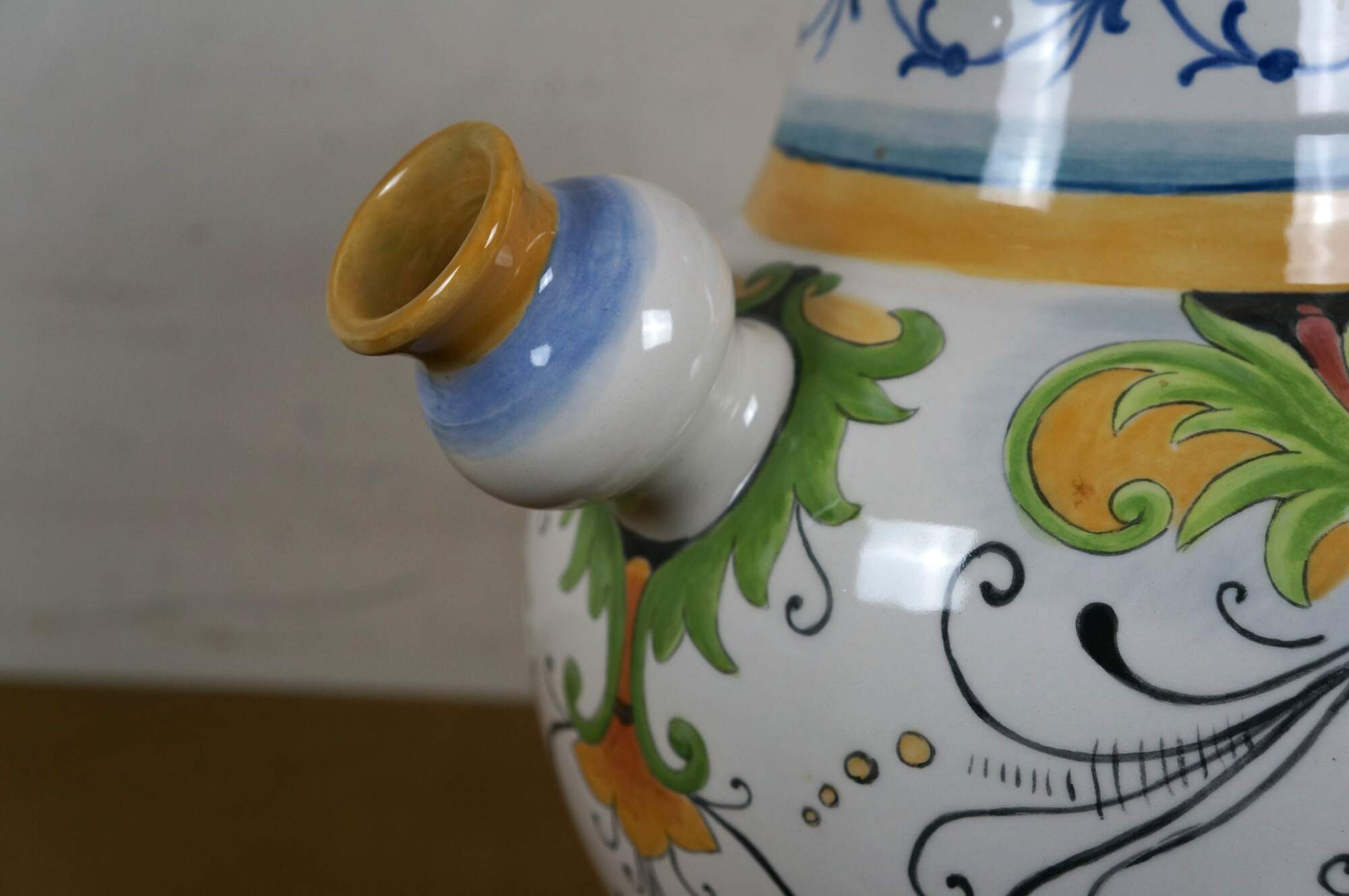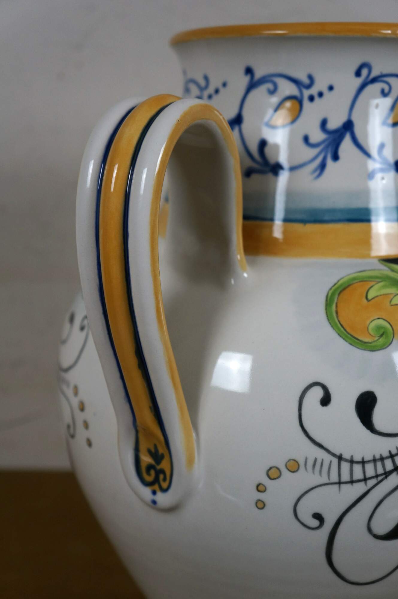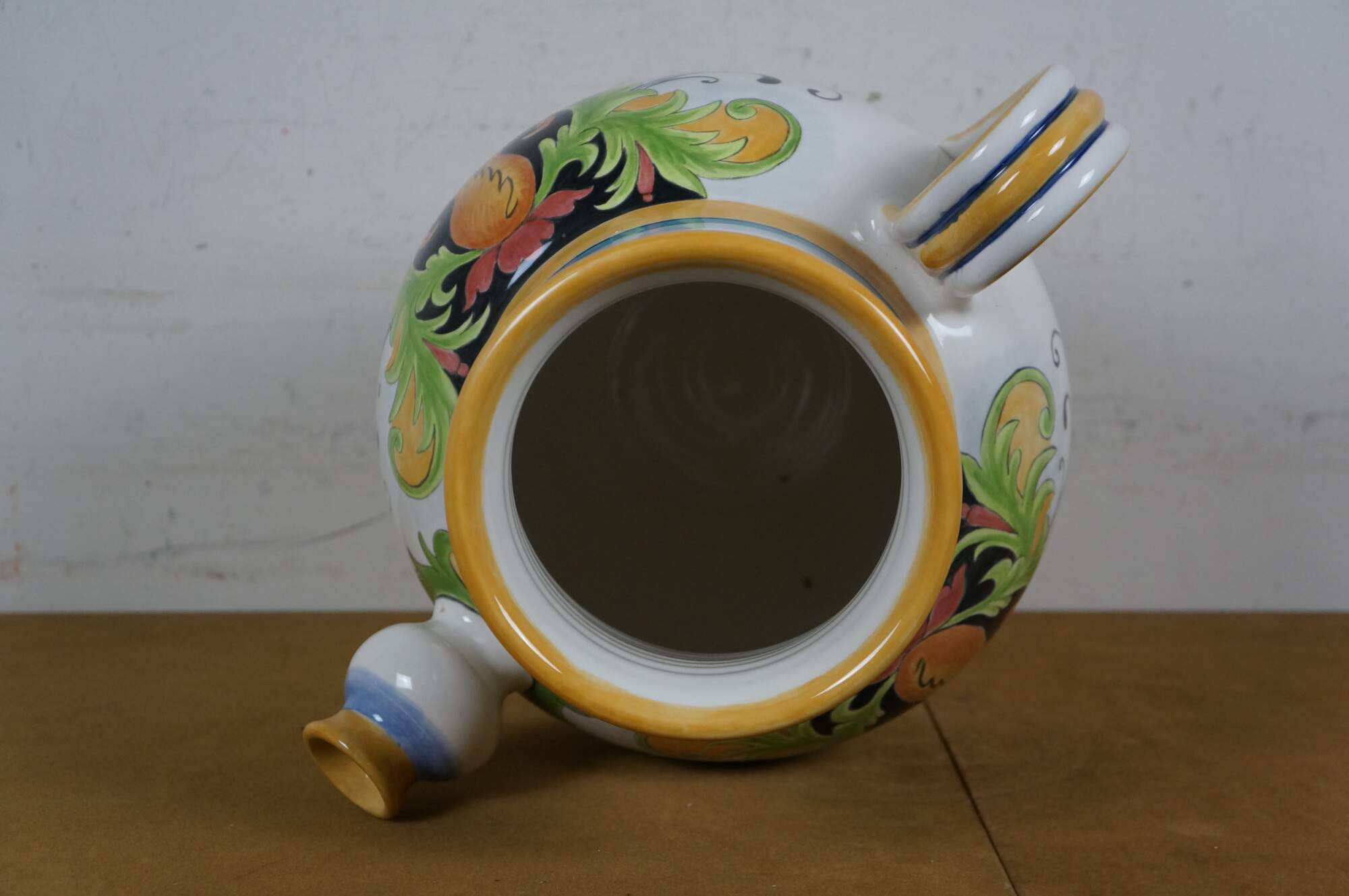 Italian Tuscan / Deruta / majolica style art pottery porcelain wine jug / urn, decorated with a green, yellow, and red tuscan foliate / blossom motif, trimmed with blue and yellow foliate designs. Signed Gatoukhova N 2012.