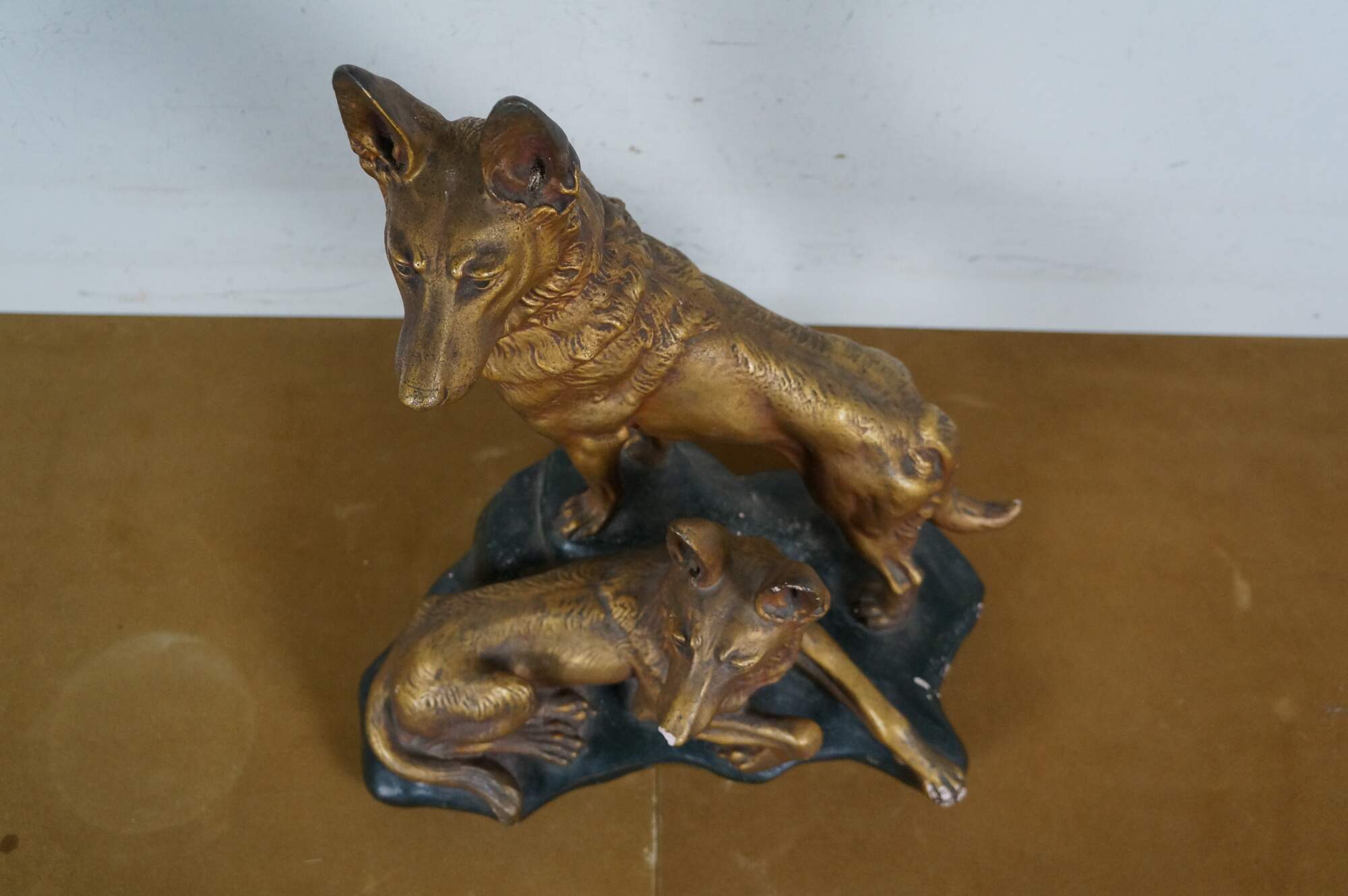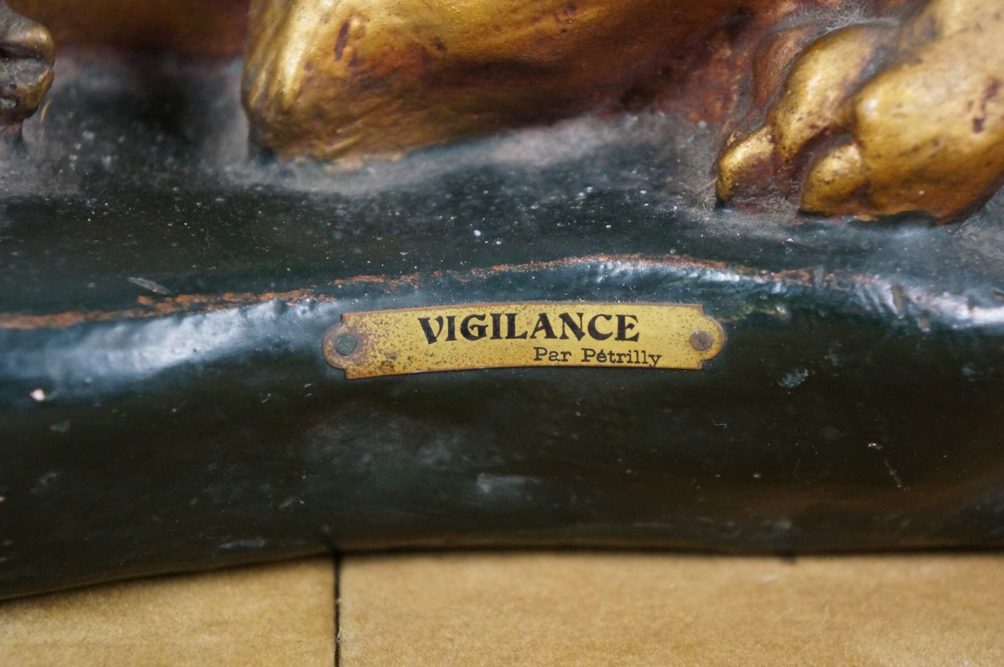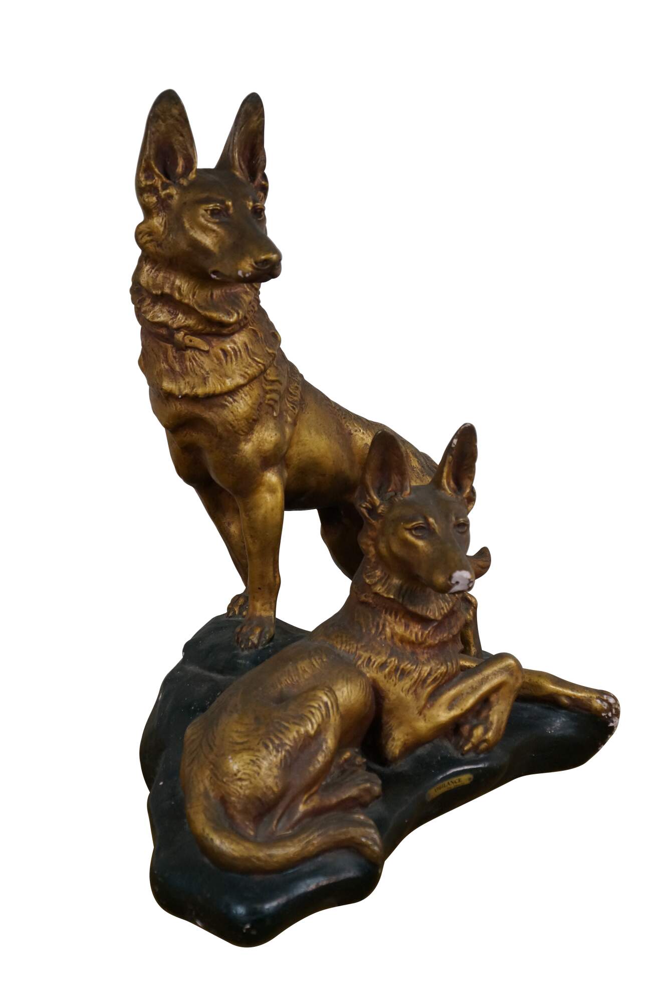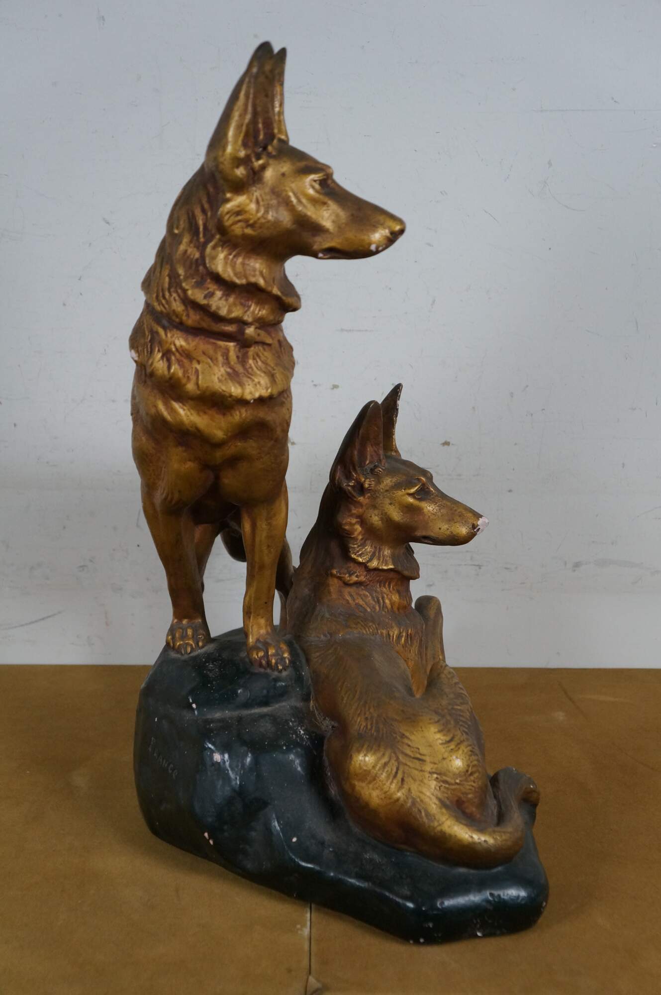 Vintage painted chalkware sculpture / statue depicting a pair of golden German Shepherds on a black stone shaped base, attributed to Aristide Petrilli. Brass plaque on front reads "Vigilance Par Petrilly." Marked "J.B. Depose 195 France" and "H. Petrilly" on side of base.