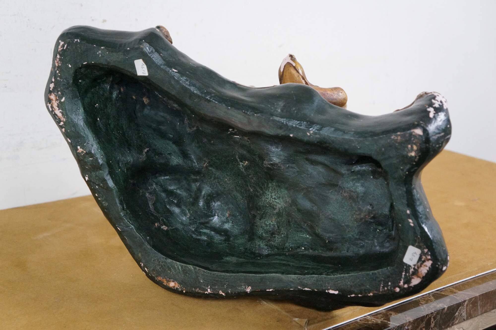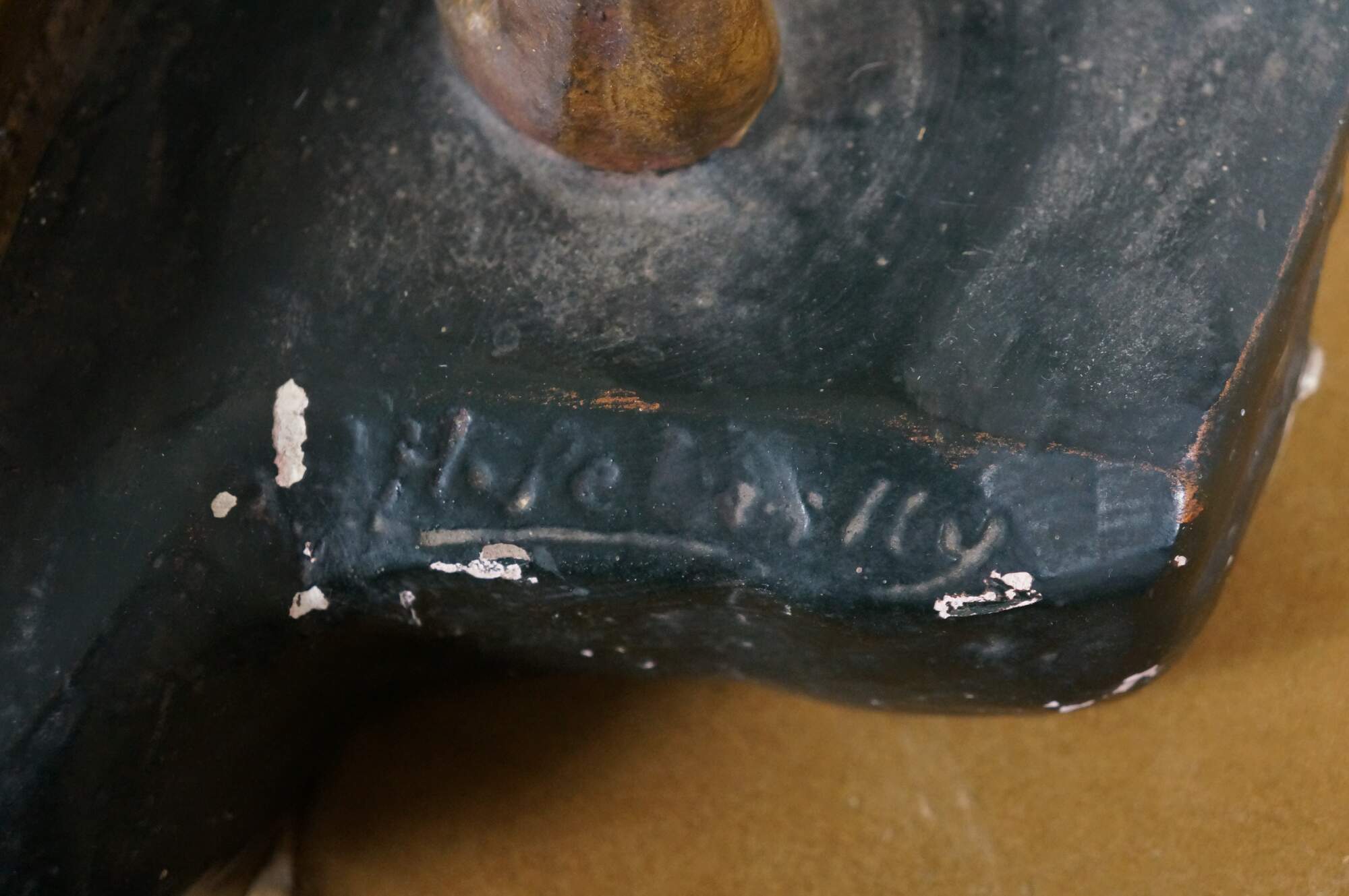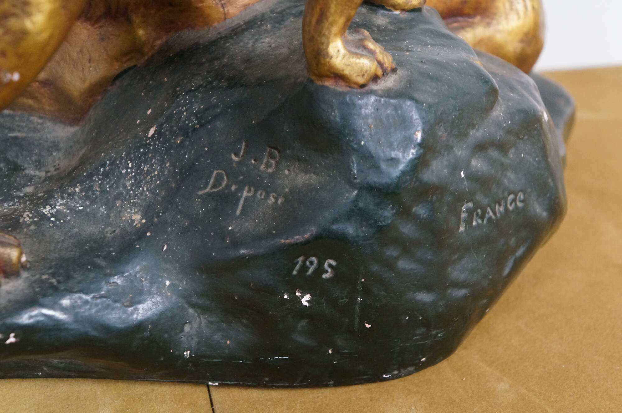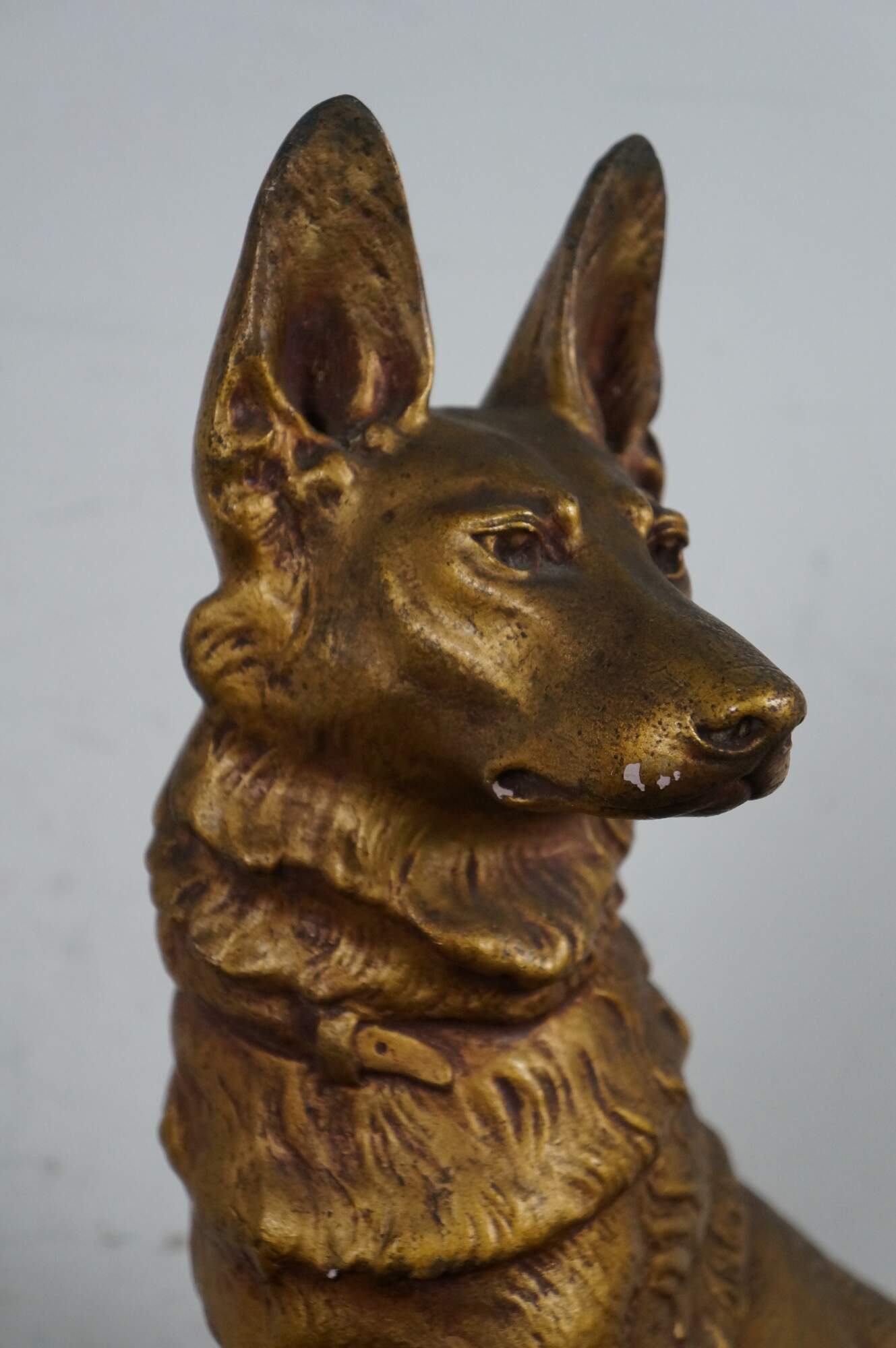 Vintage painted chalkware sculpture / statue depicting a pair of golden German Shepherds on a black stone shaped base, attributed to Aristide Petrilli. Brass plaque on front reads "Vigilance Par Petrilly." Marked "J.B. Depose 195 France" and "H. Petrilly" on side of base.