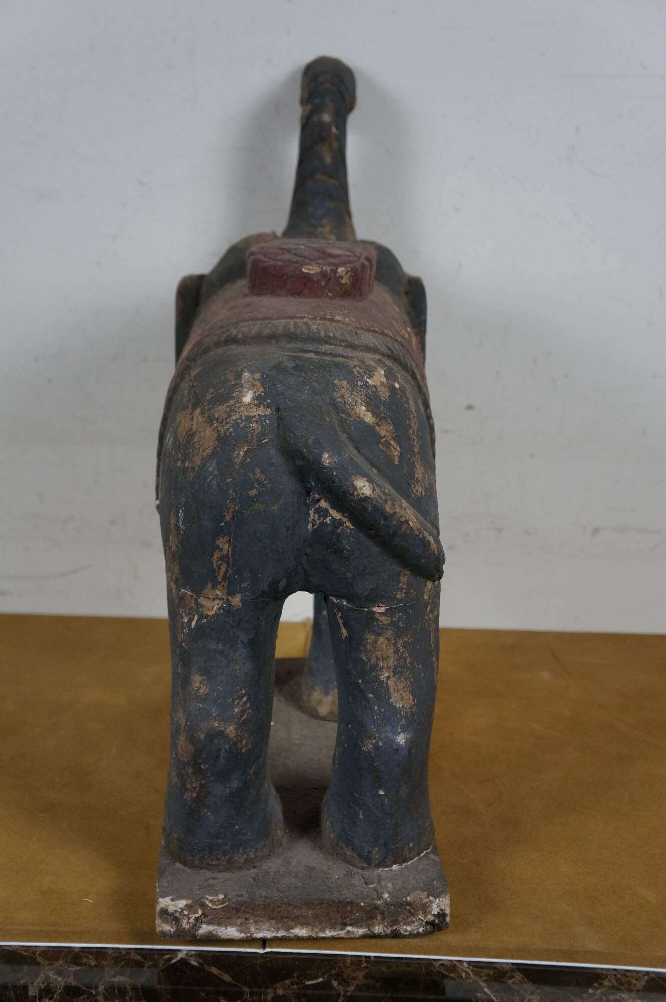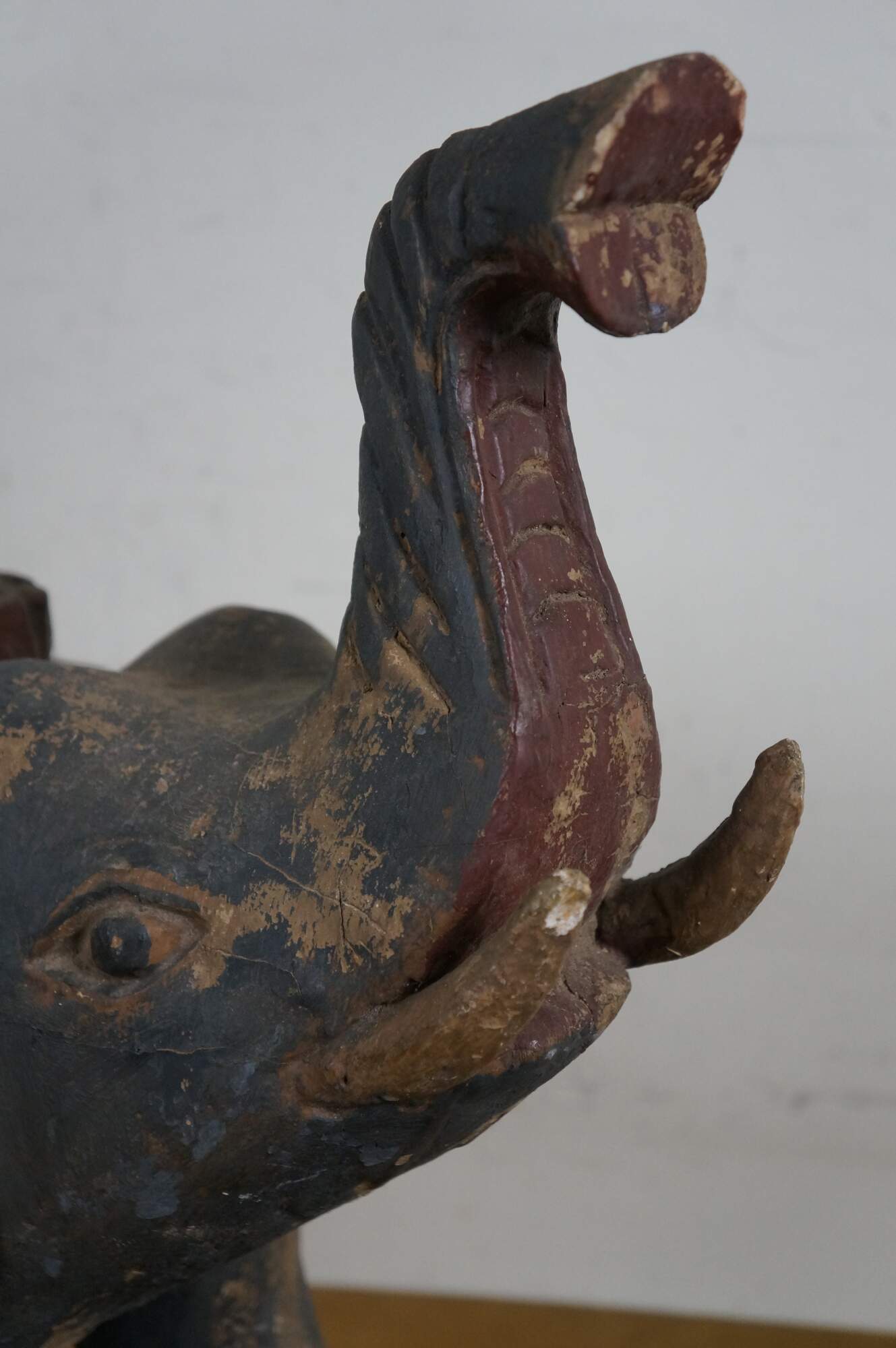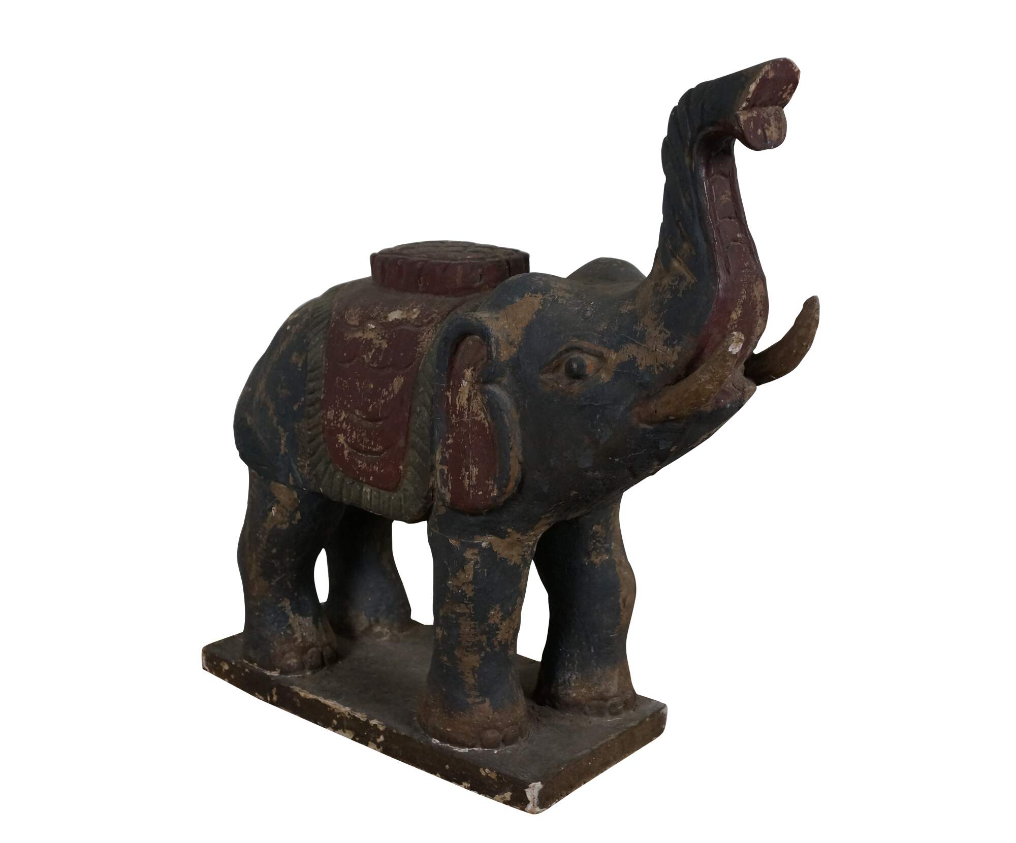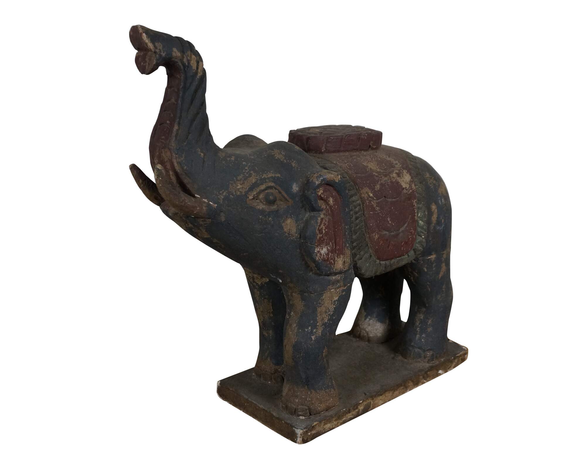 Antique hand carved wooden elephant sculpture / figurine with lucky raised trunk, painted black with a red and green saddle, standing on a rectangular base.