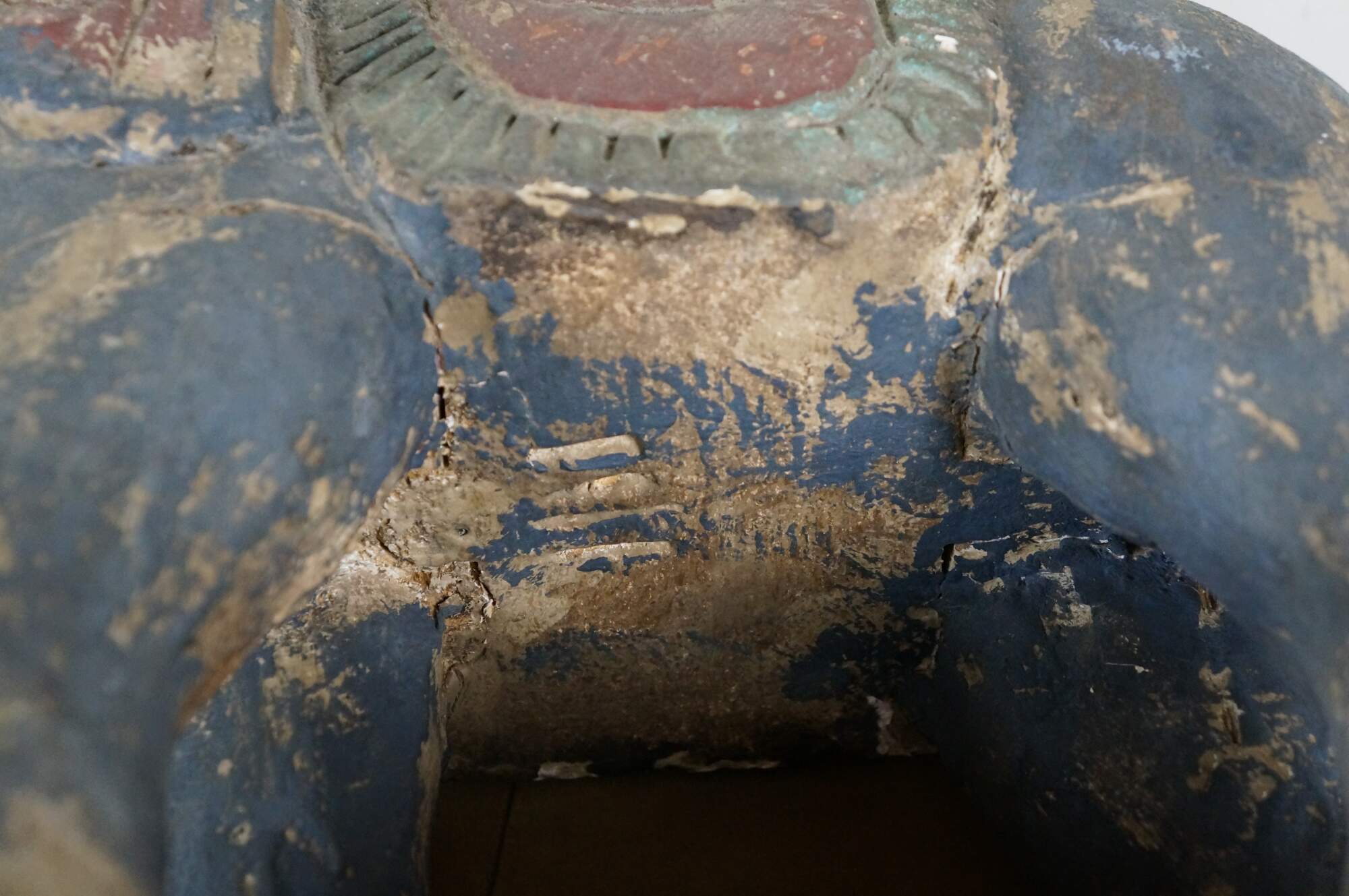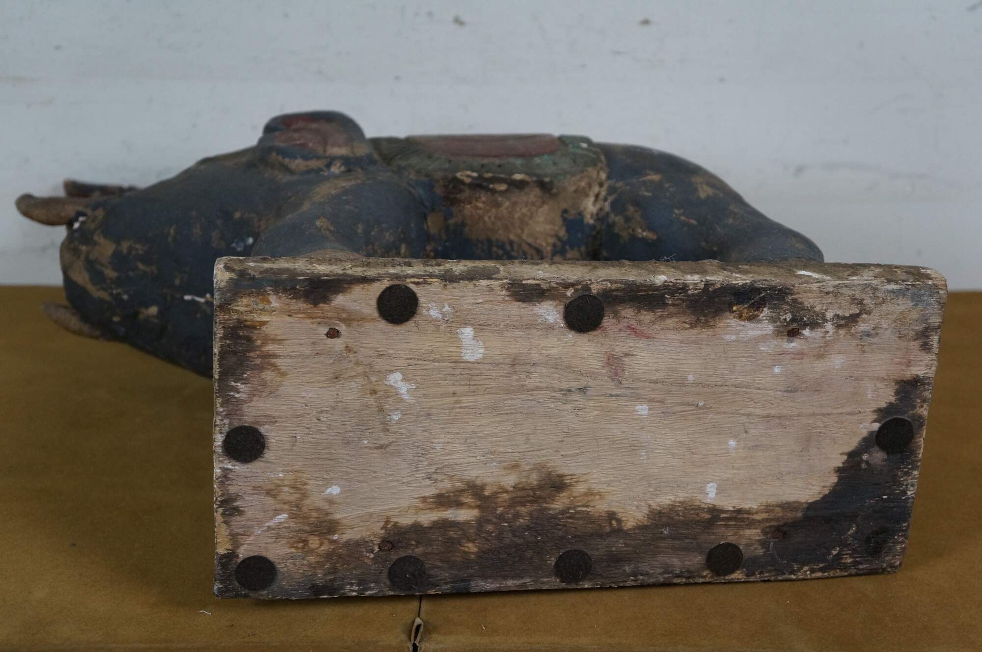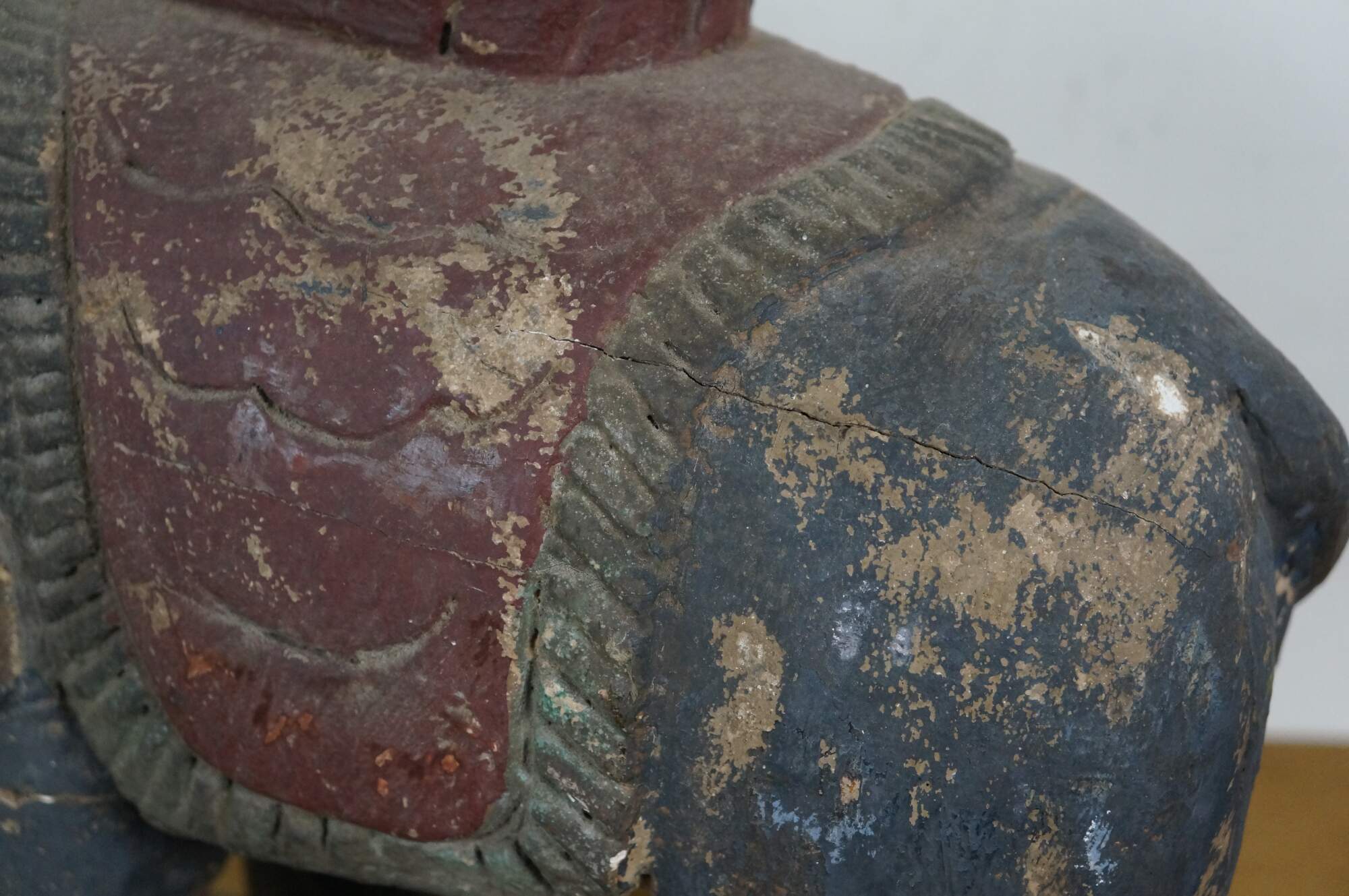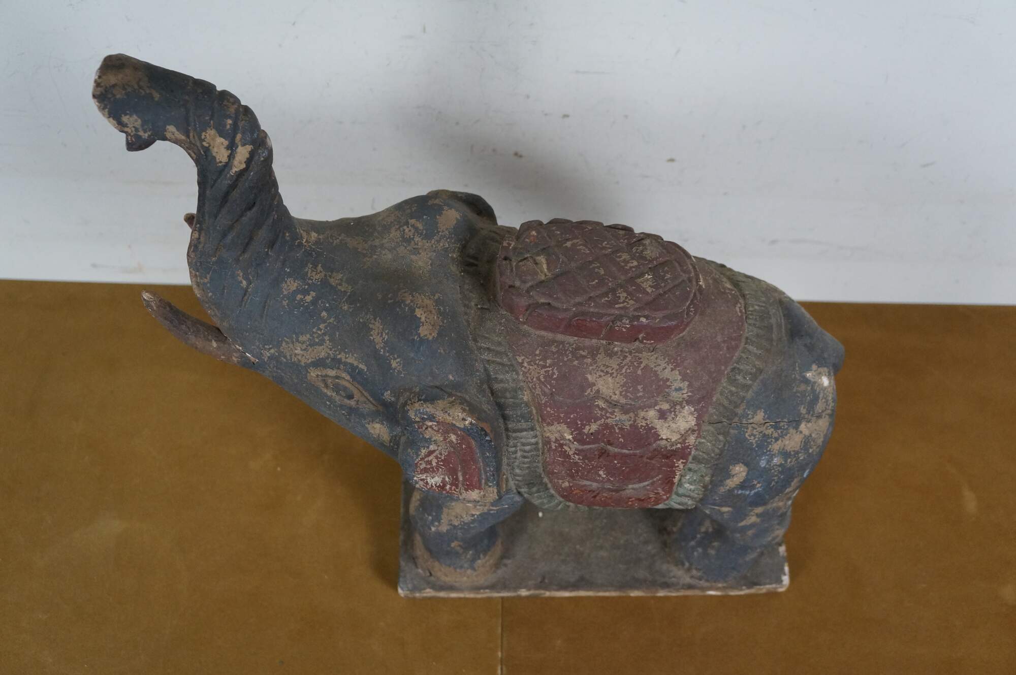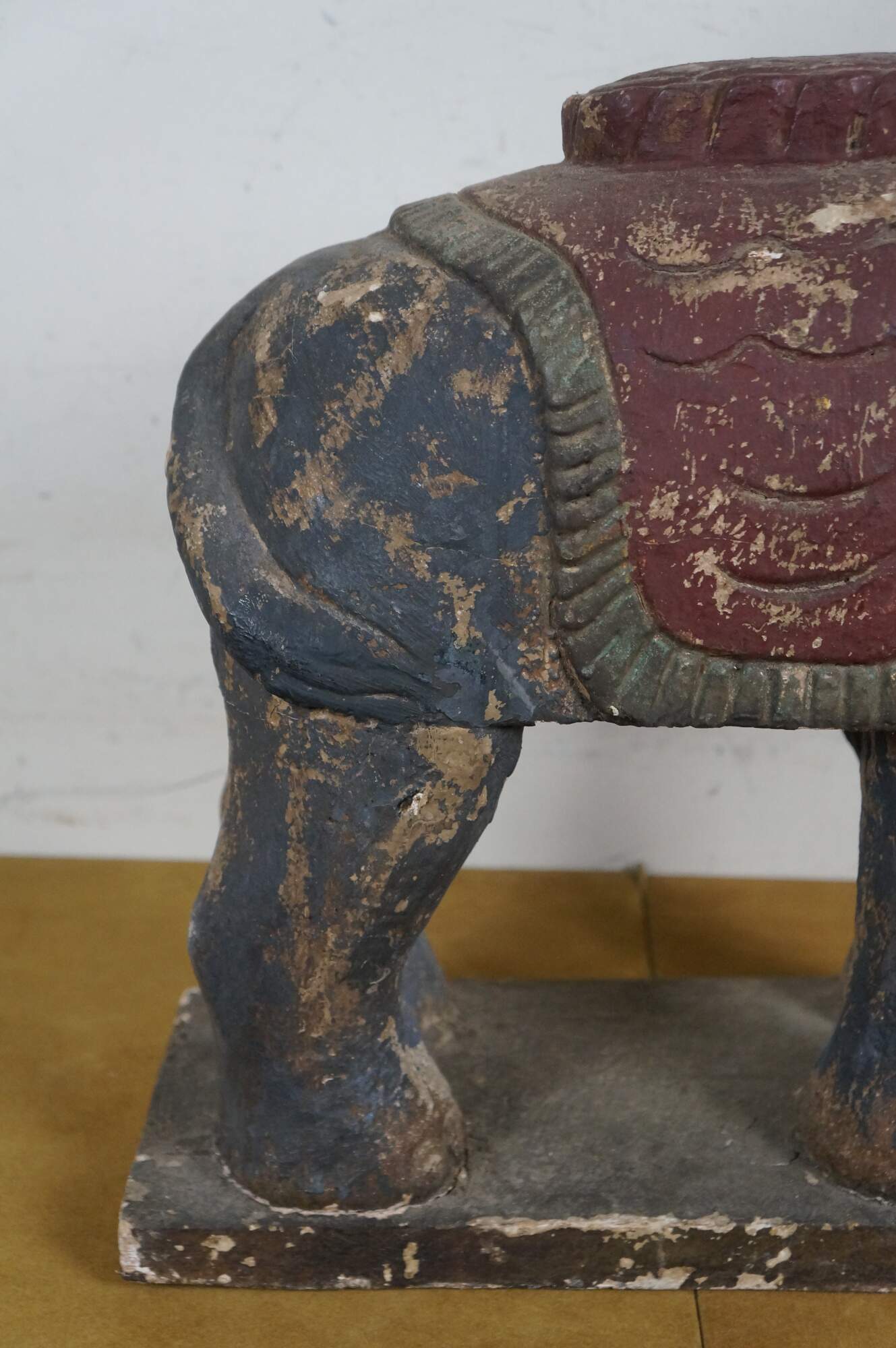Antique hand carved wooden elephant sculpture / figurine with lucky raised trunk, painted black with a red and green saddle, standing on a rectangular base.