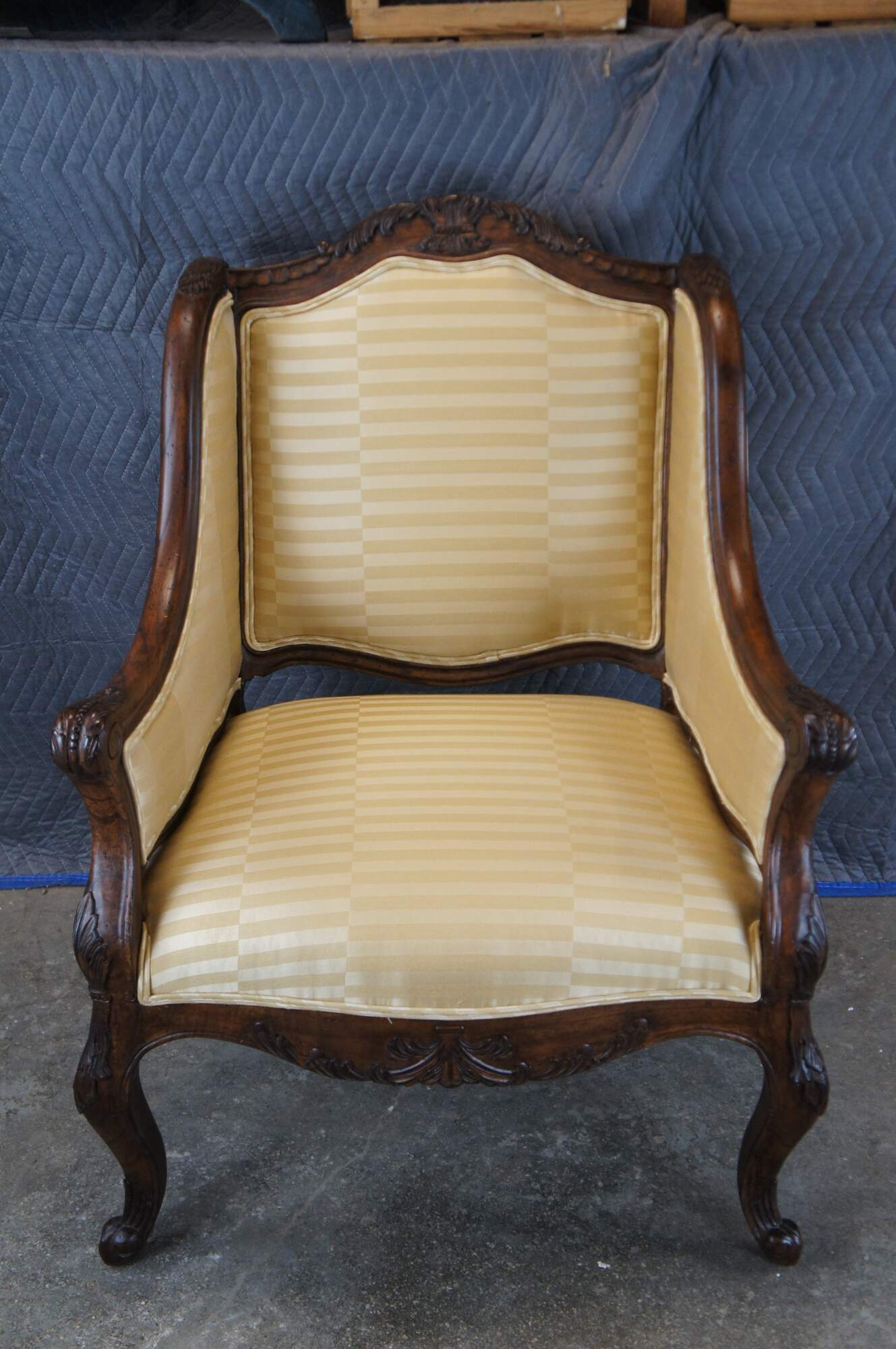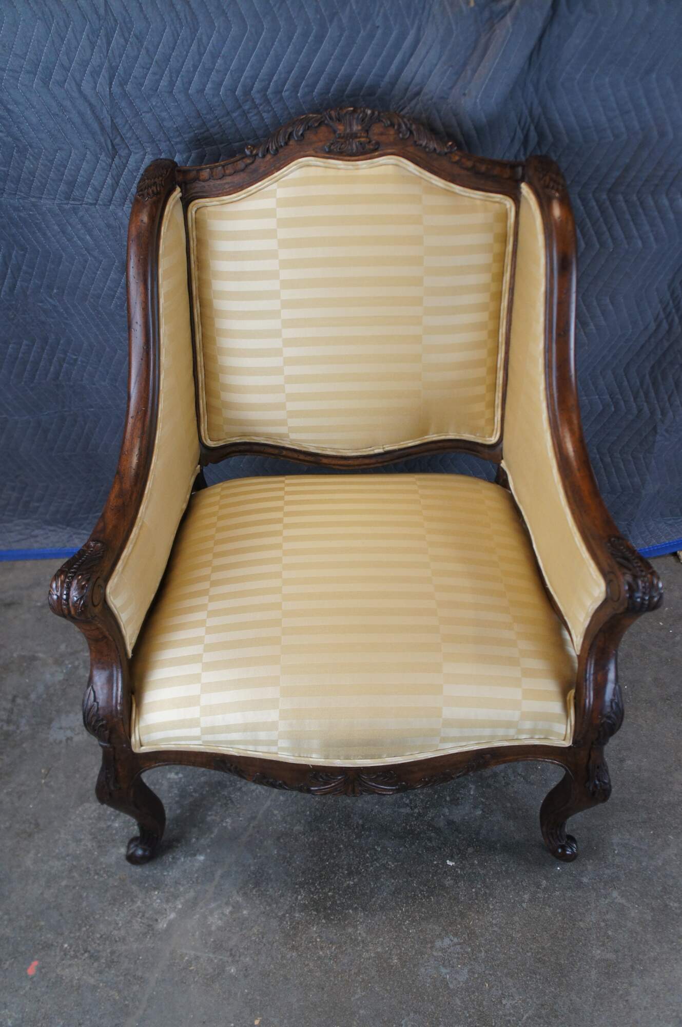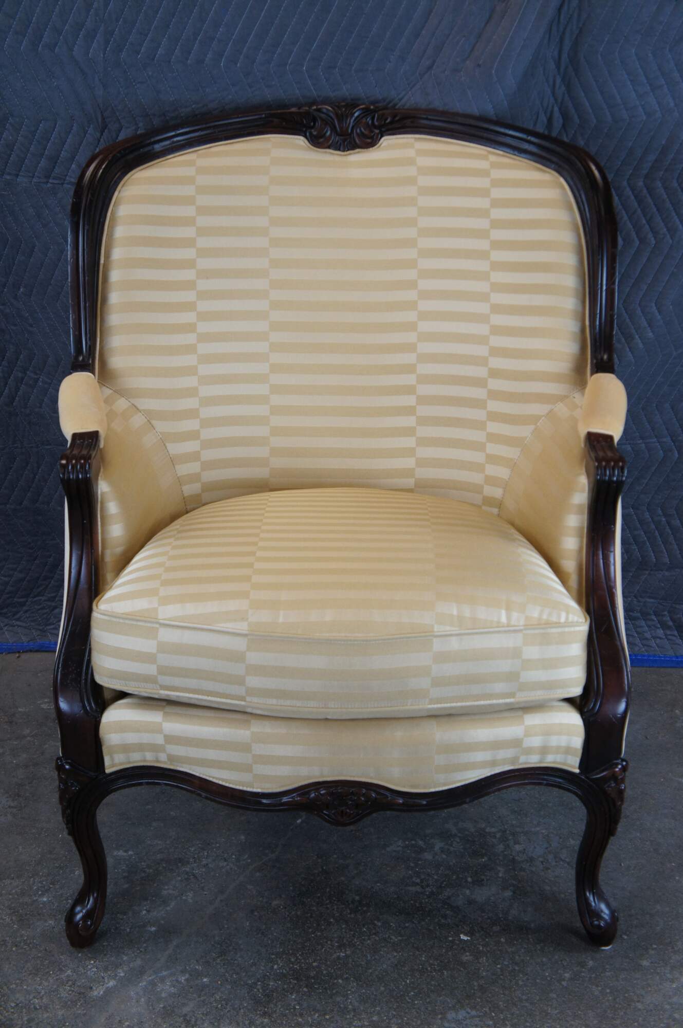 Vintage pair of arm chairs by Hancock & Moore's Balfour collection and John Richardss Alexander and Mary collection. Both chairs feature French Louis XVI styling and gold geometric stripe fabric. The Balfour club / lounge / library chair features a Bergere and fauteuil design with carved floral details. The Alexander and Mary armchair features carved acanthus accents and cabriole legs.