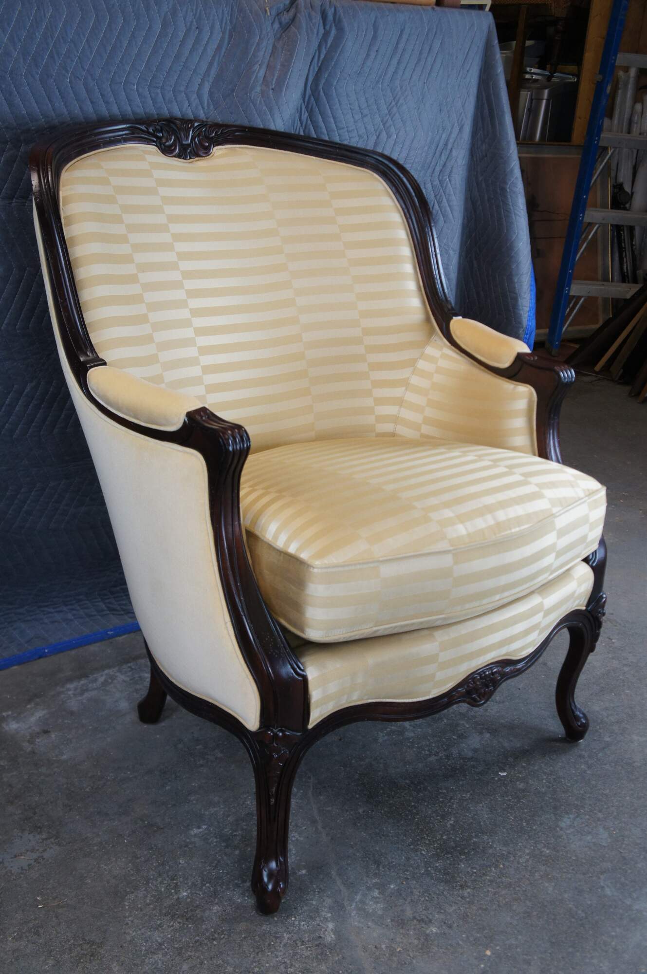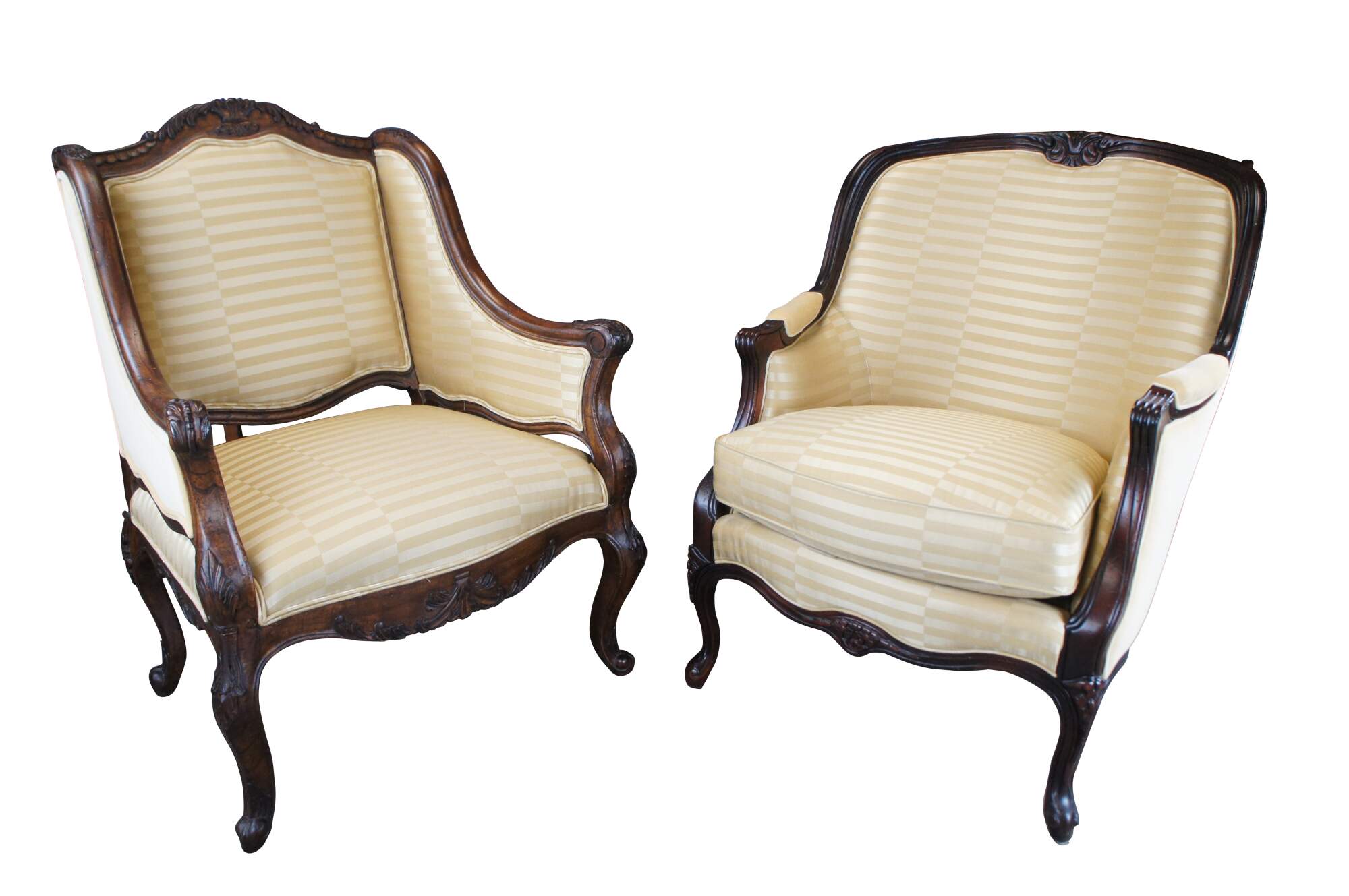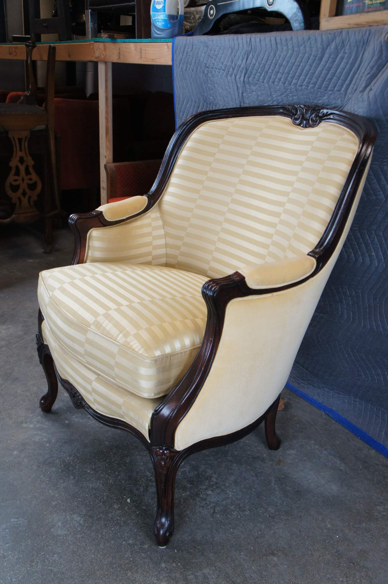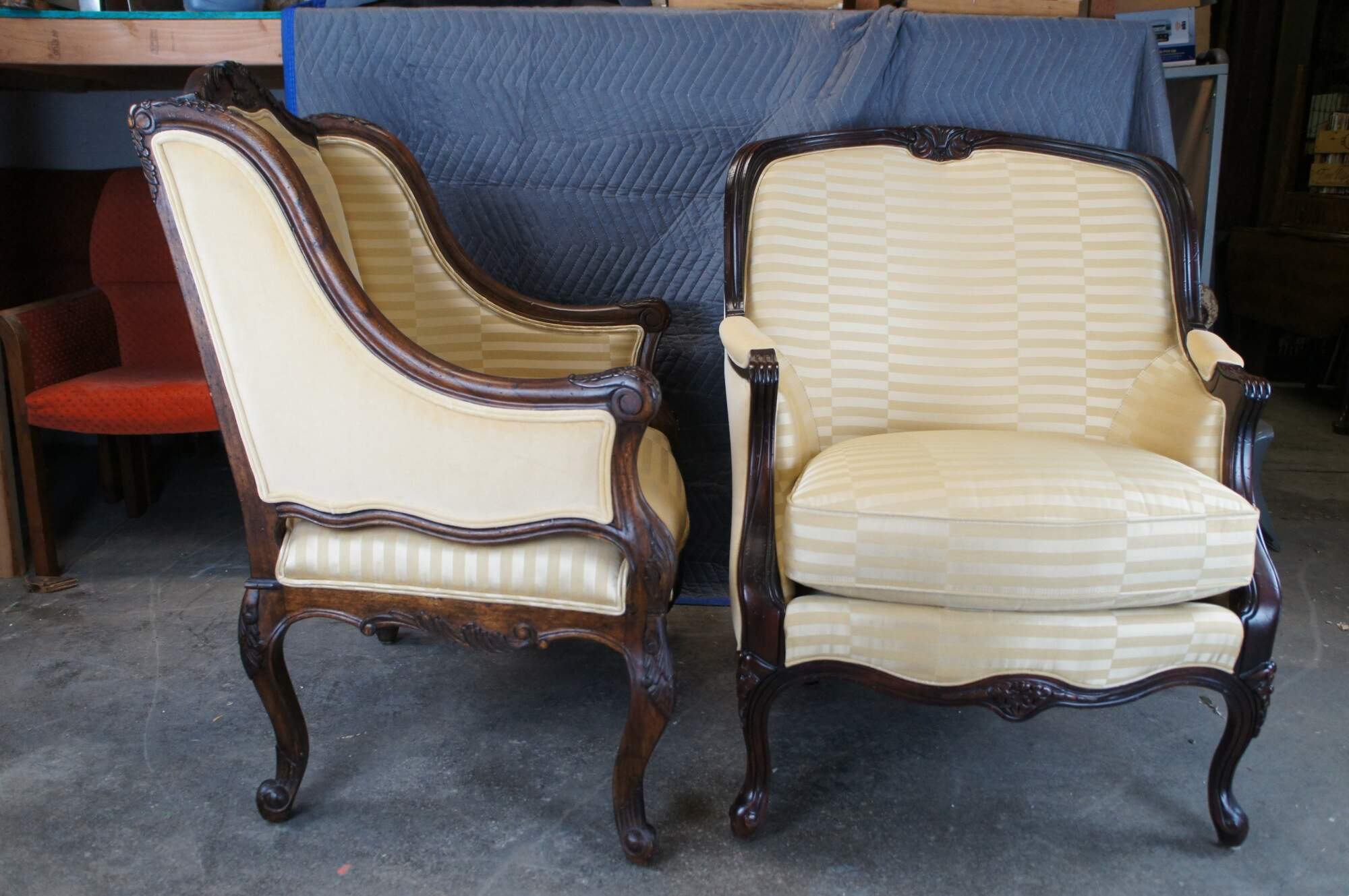 Vintage pair of arm chairs by Hancock & Moore's Balfour collection and John Richardss Alexander and Mary collection. Both chairs feature French Louis XVI styling and gold geometric stripe fabric. The Balfour club / lounge / library chair features a Bergere and fauteuil design with carved floral details. The Alexander and Mary armchair features carved acanthus accents and cabriole legs.