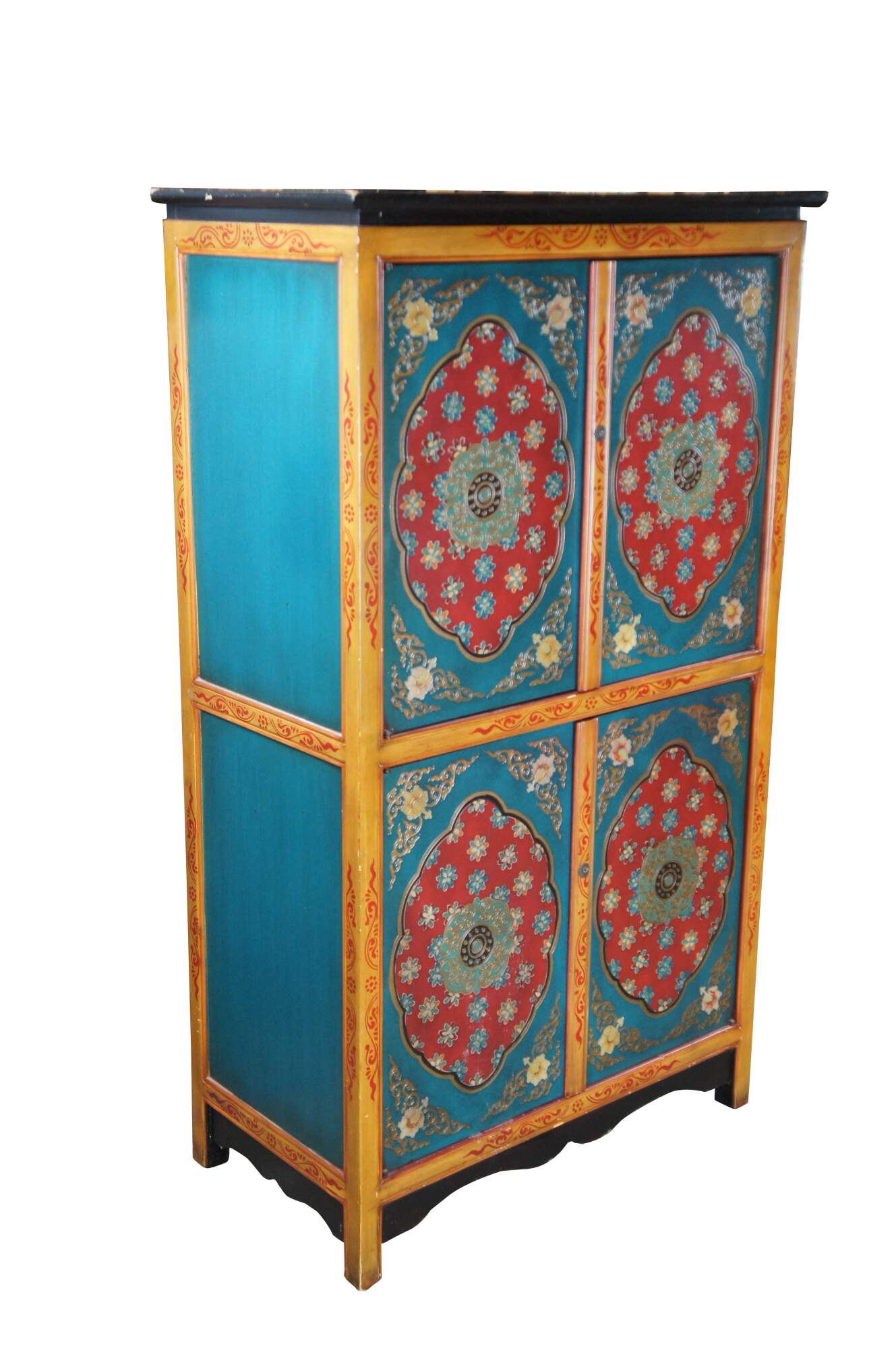 Vintage Moroccan/ Bohemian wine/ liquor/ bar cabinet featuring boho styling with vibrant turquoise, gold, red motif with embossed floral medallions. Cabinet opens to multiple cubbies and drawers with pull-out shelf and lower storage for up to 32 bottles. Could also be used as a linen press/ storage wardrobe.