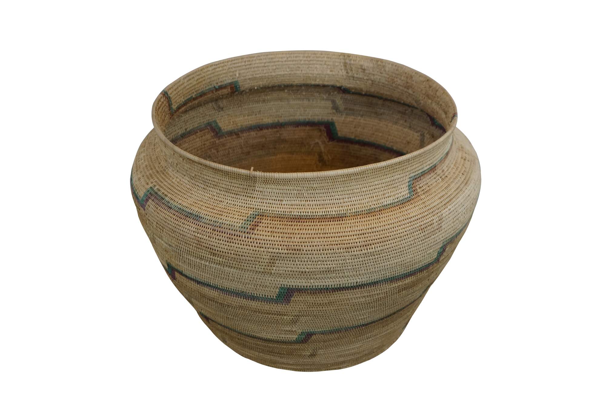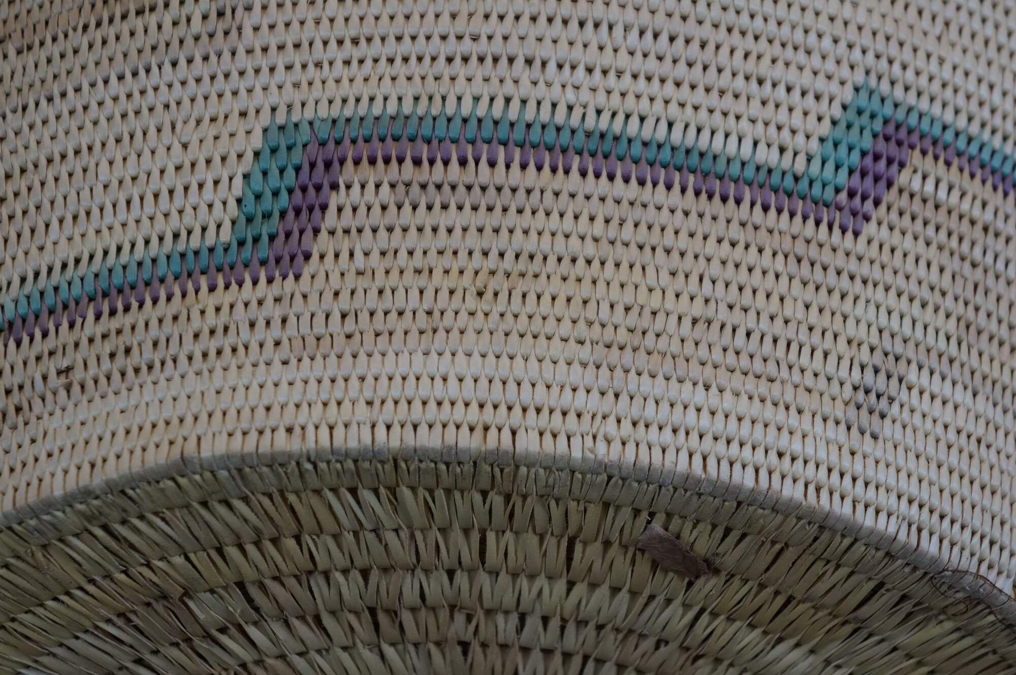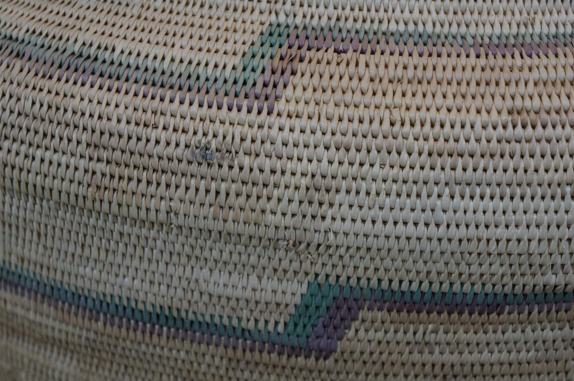 Late 20th century palm leaf basket vase / urn, hand woven in natural beige with a meandering stripe of purple and teal green. Attributed to Shalimar Collection.