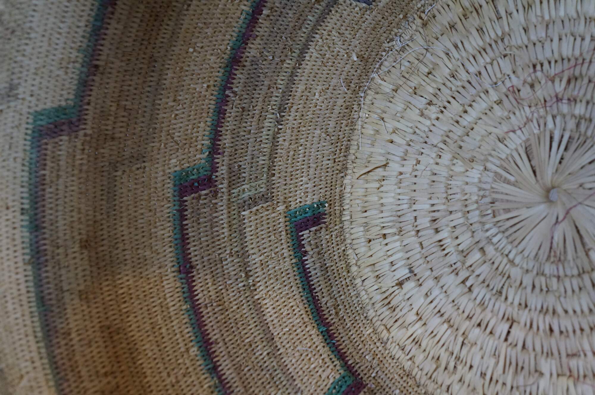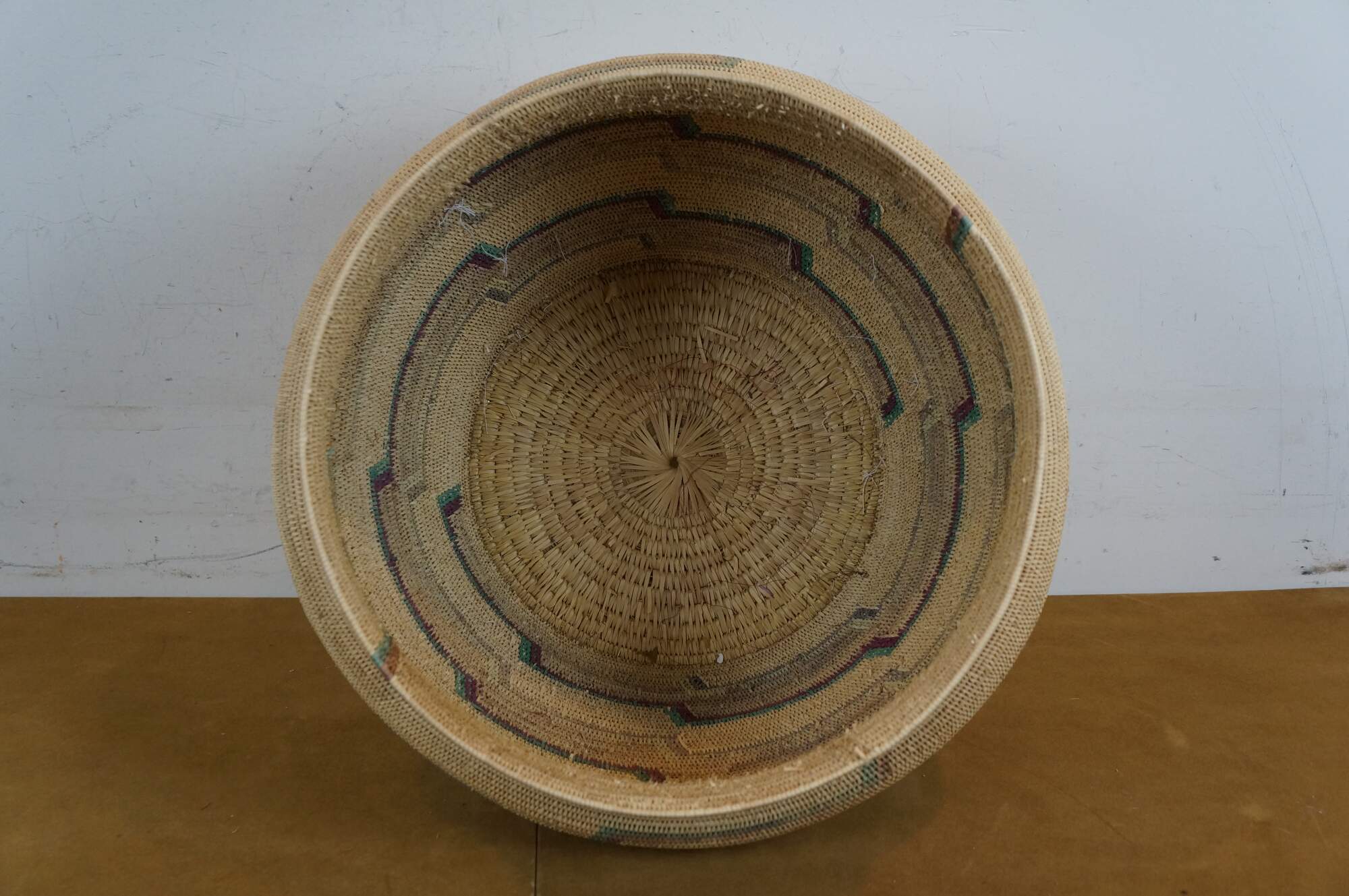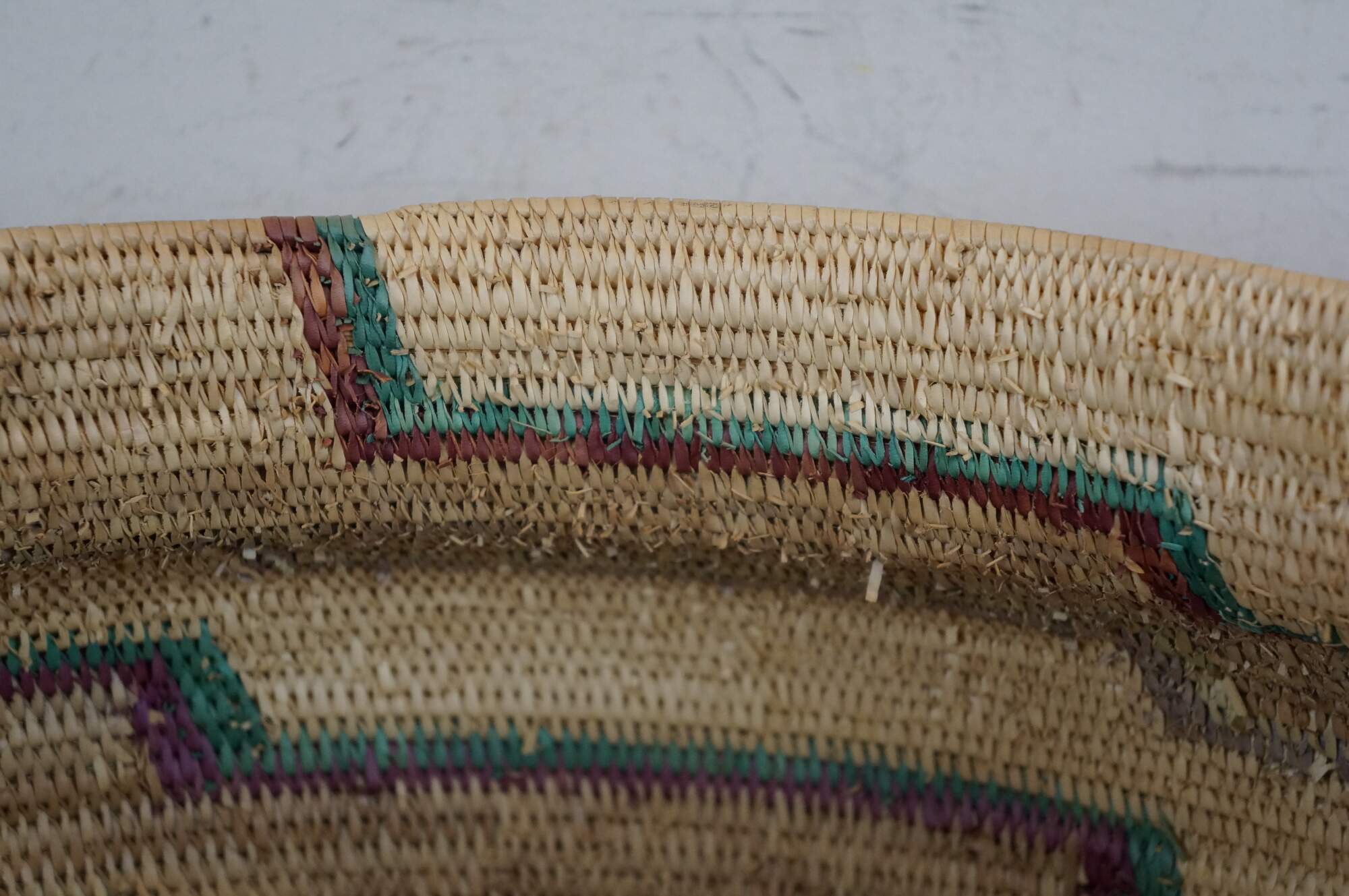 Late 20th century palm leaf basket vase / urn, hand woven in natural beige with a meandering stripe of purple and teal green. Attributed to Shalimar Collection.