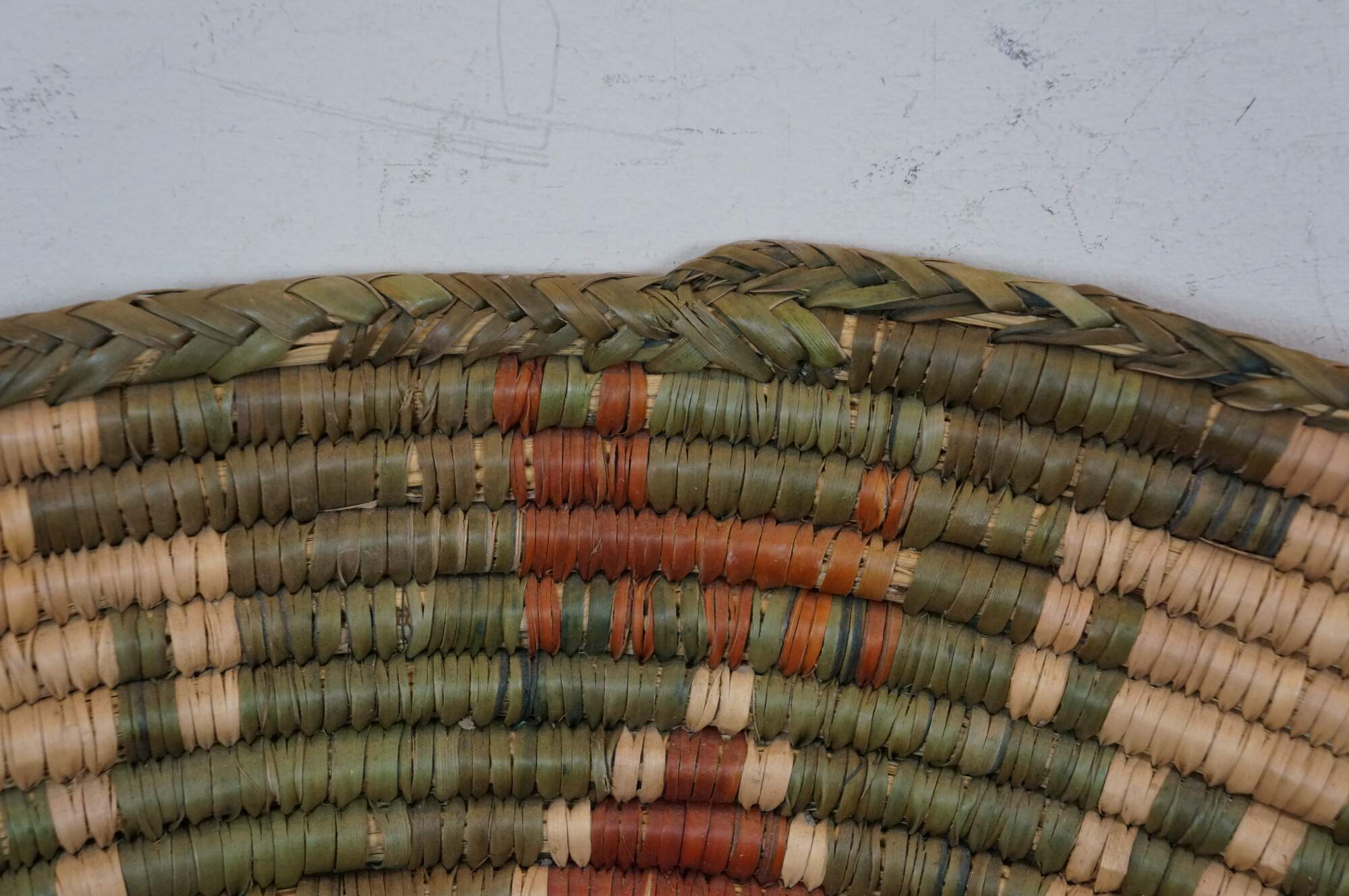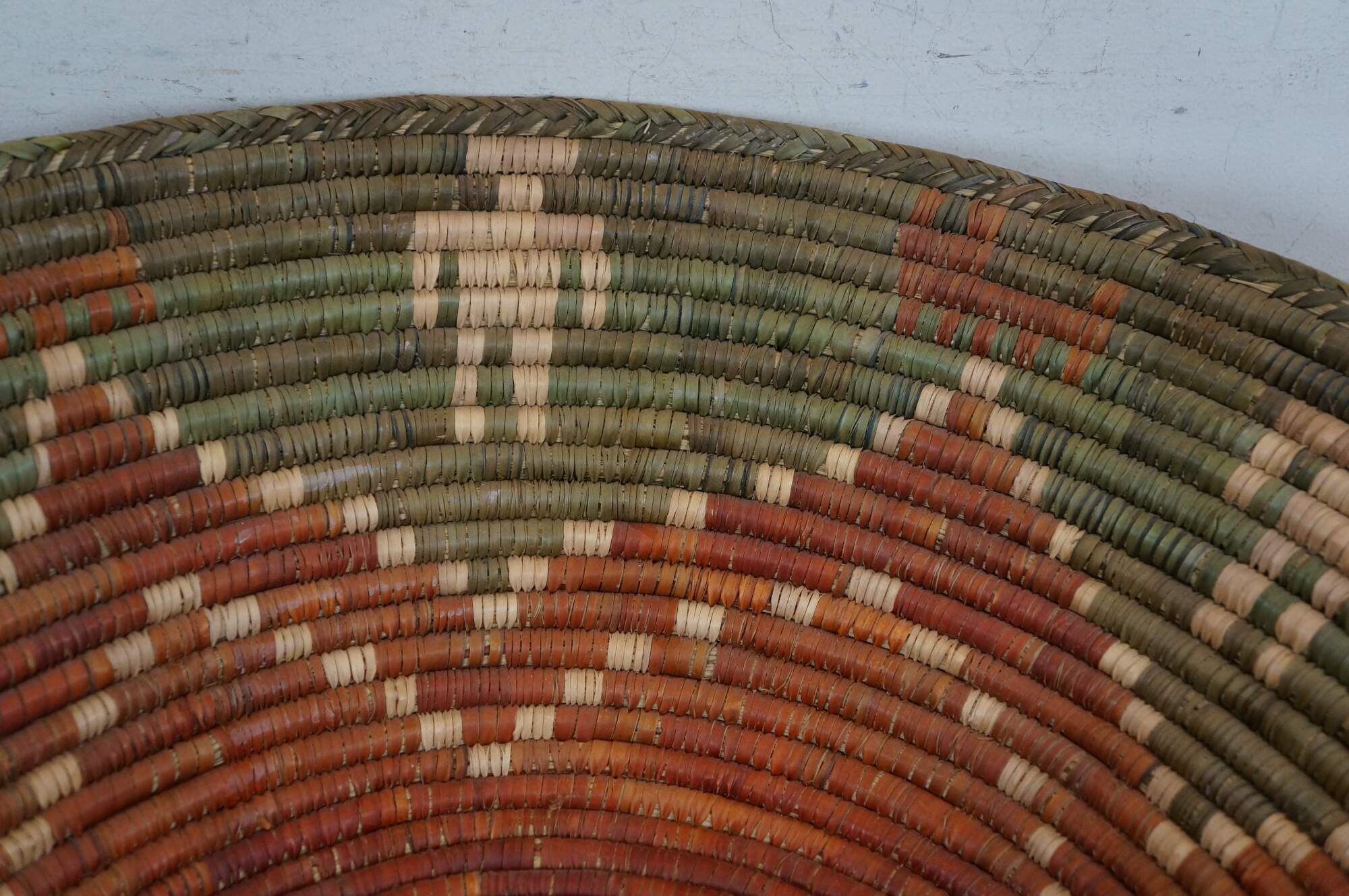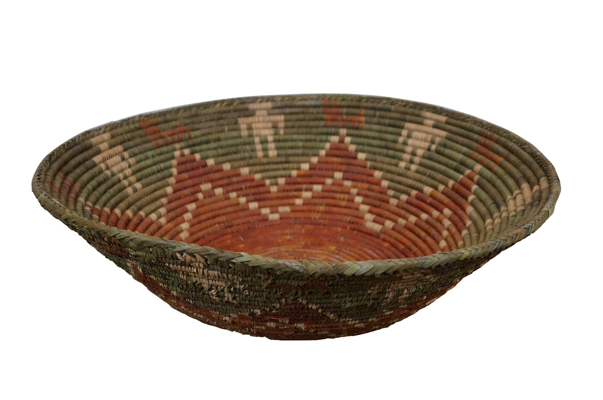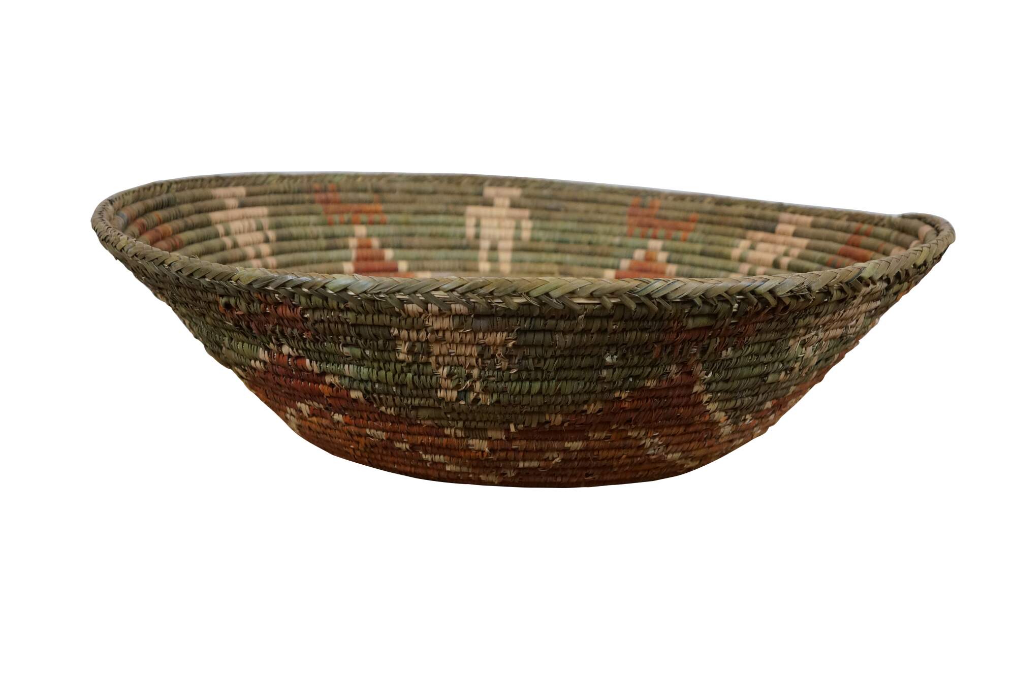 Late 20th century palm leaf coil basket bowl, hand woven in olive green with a rust red seven pinted star / flower, surrounded by red aninmals and beige figures. Attributed to Shalimar Collection.