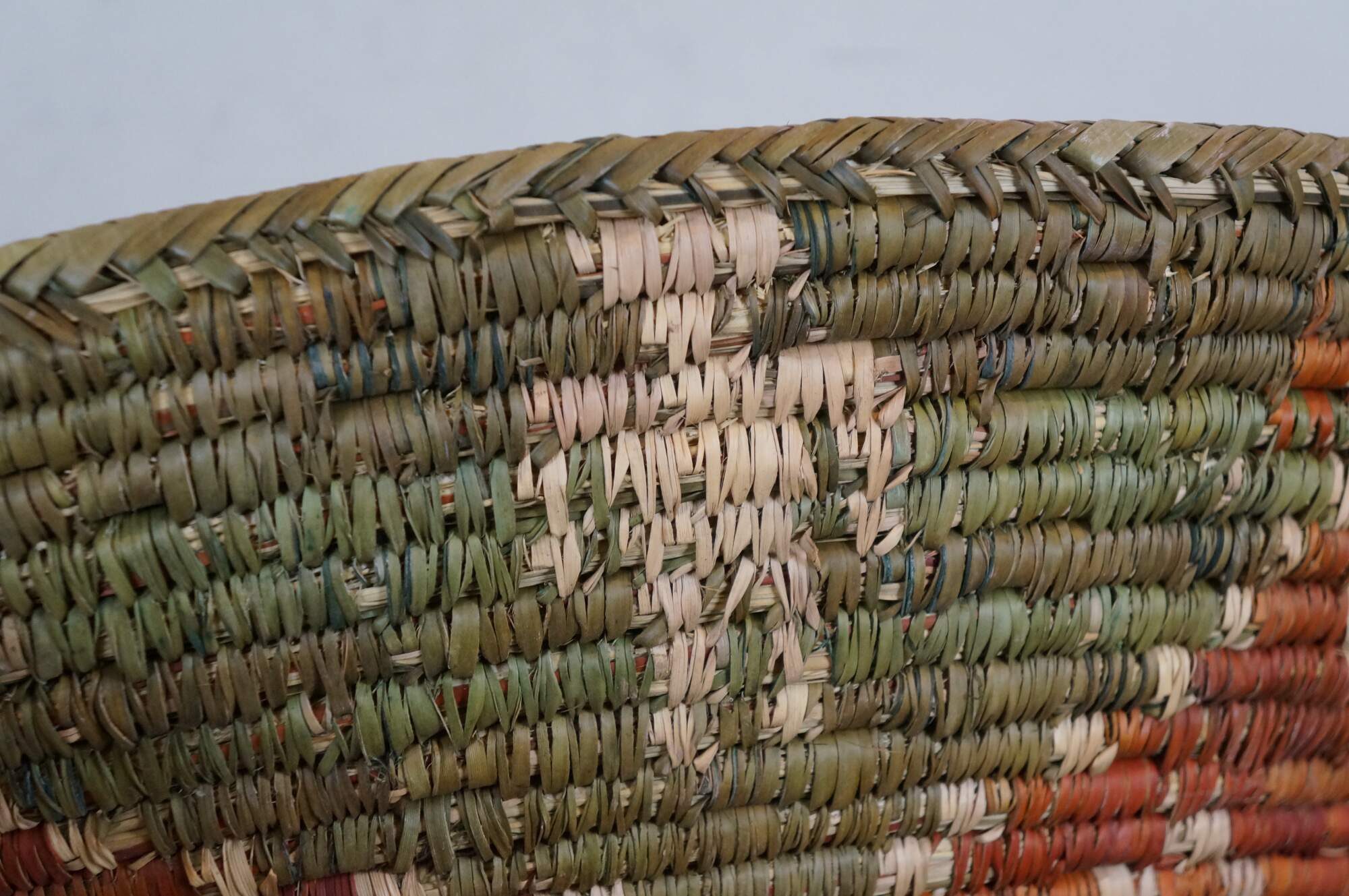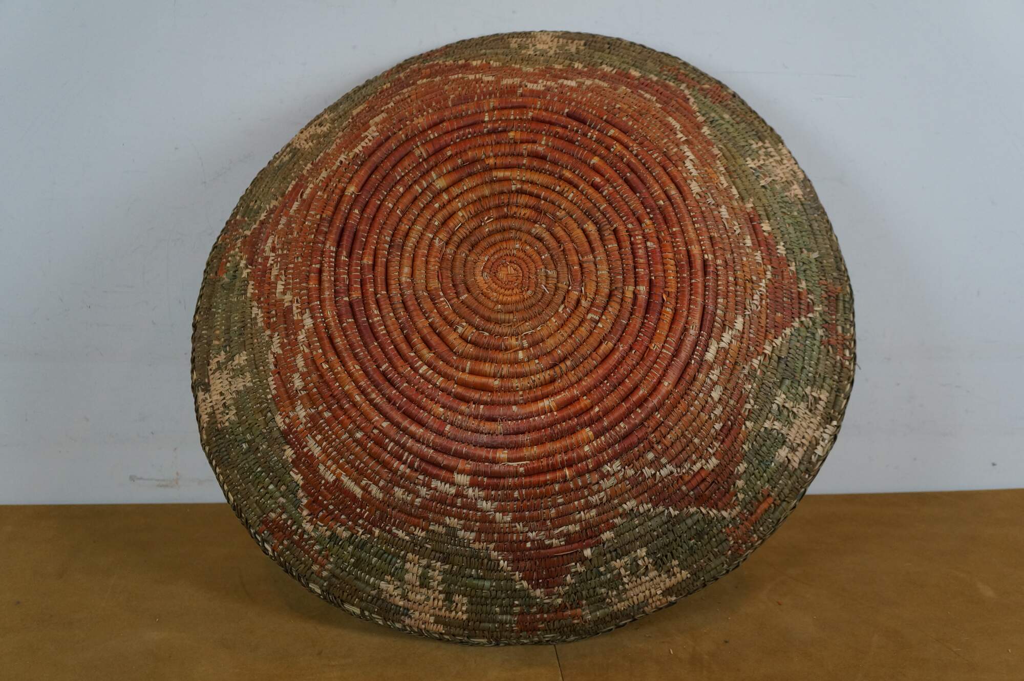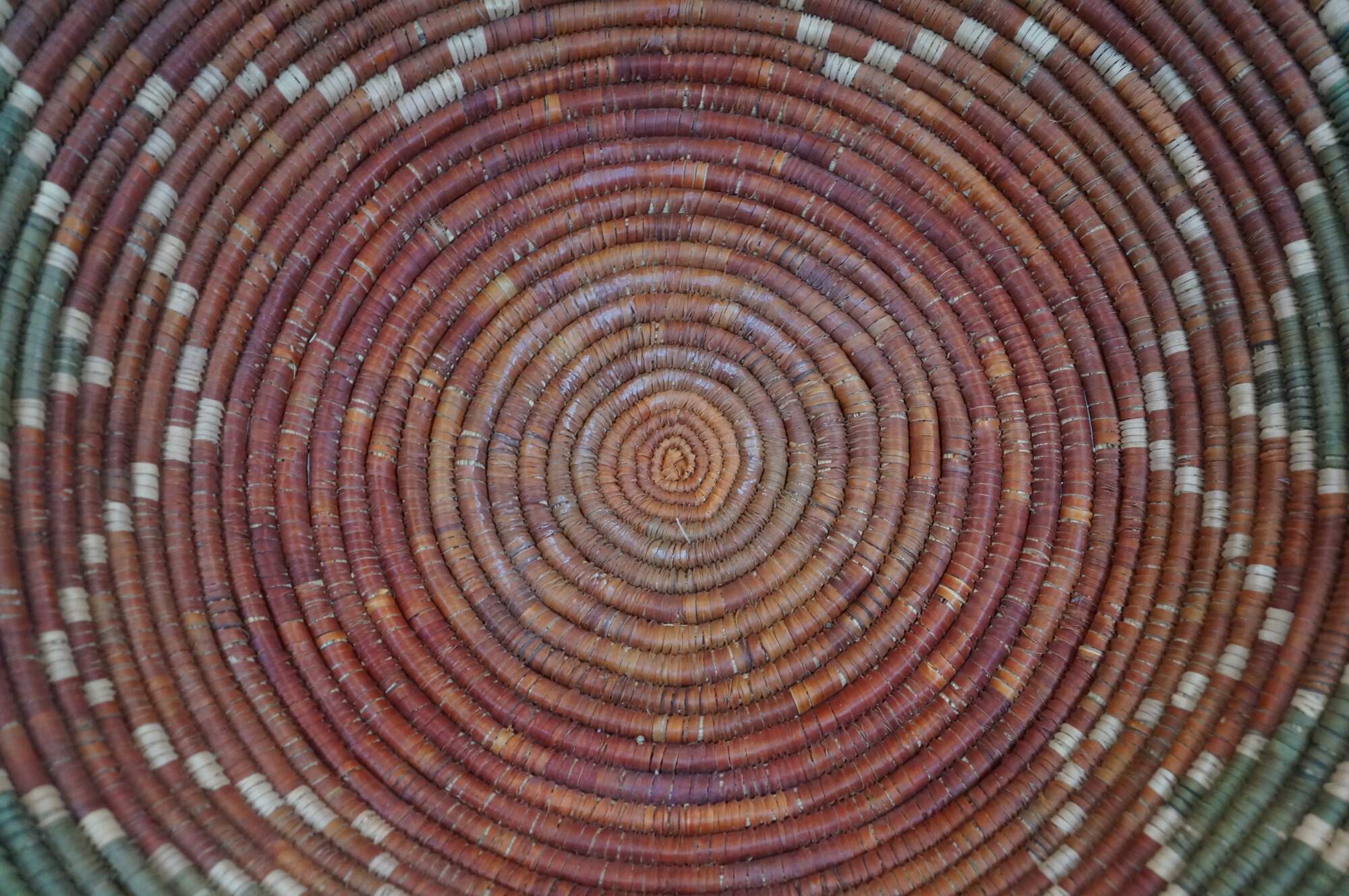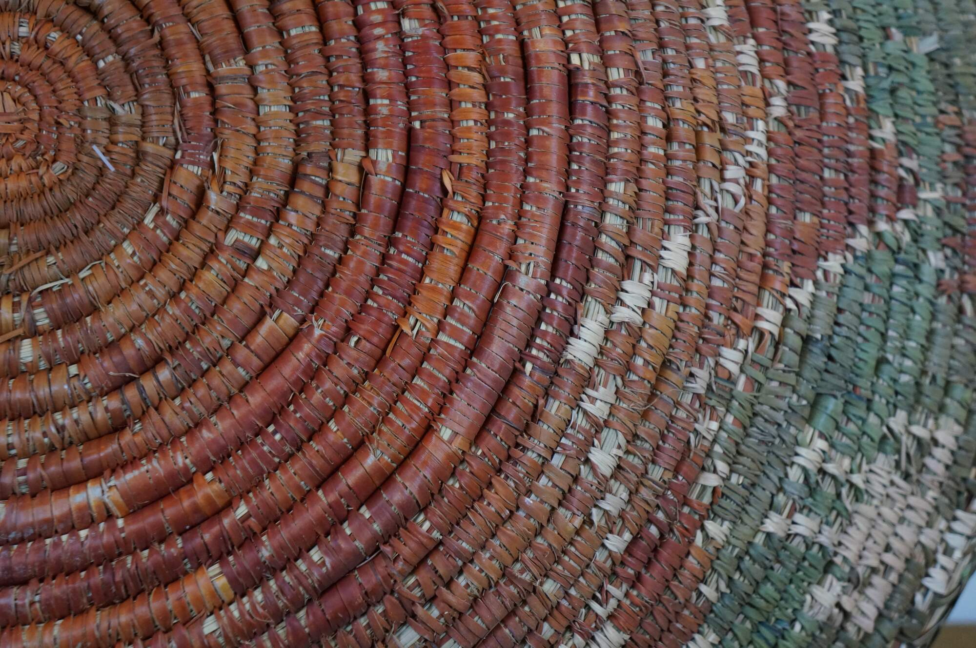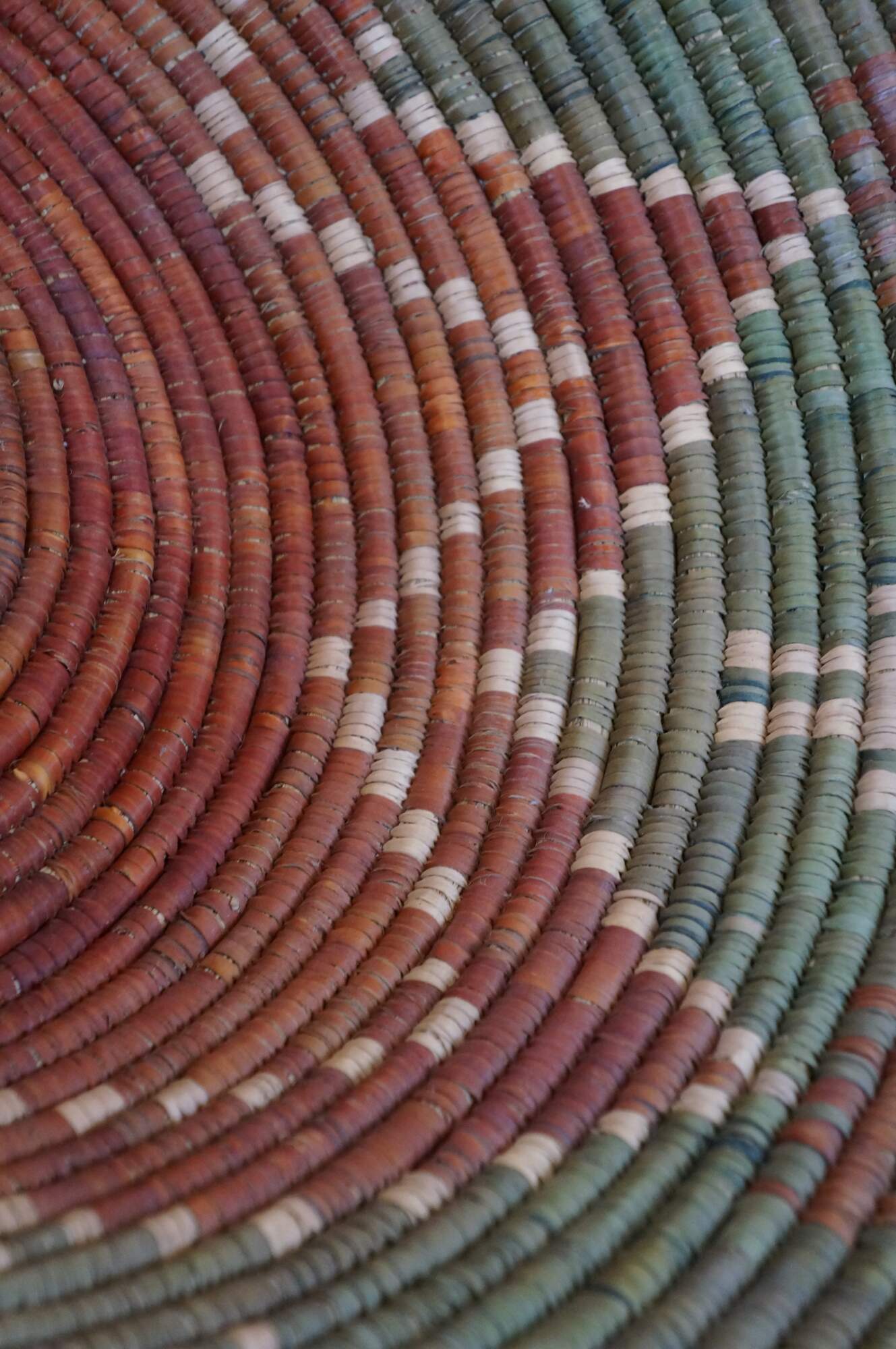Late 20th century palm leaf coil basket bowl, hand woven in olive green with a rust red seven pinted star / flower, surrounded by red aninmals and beige figures. Attributed to Shalimar Collection.