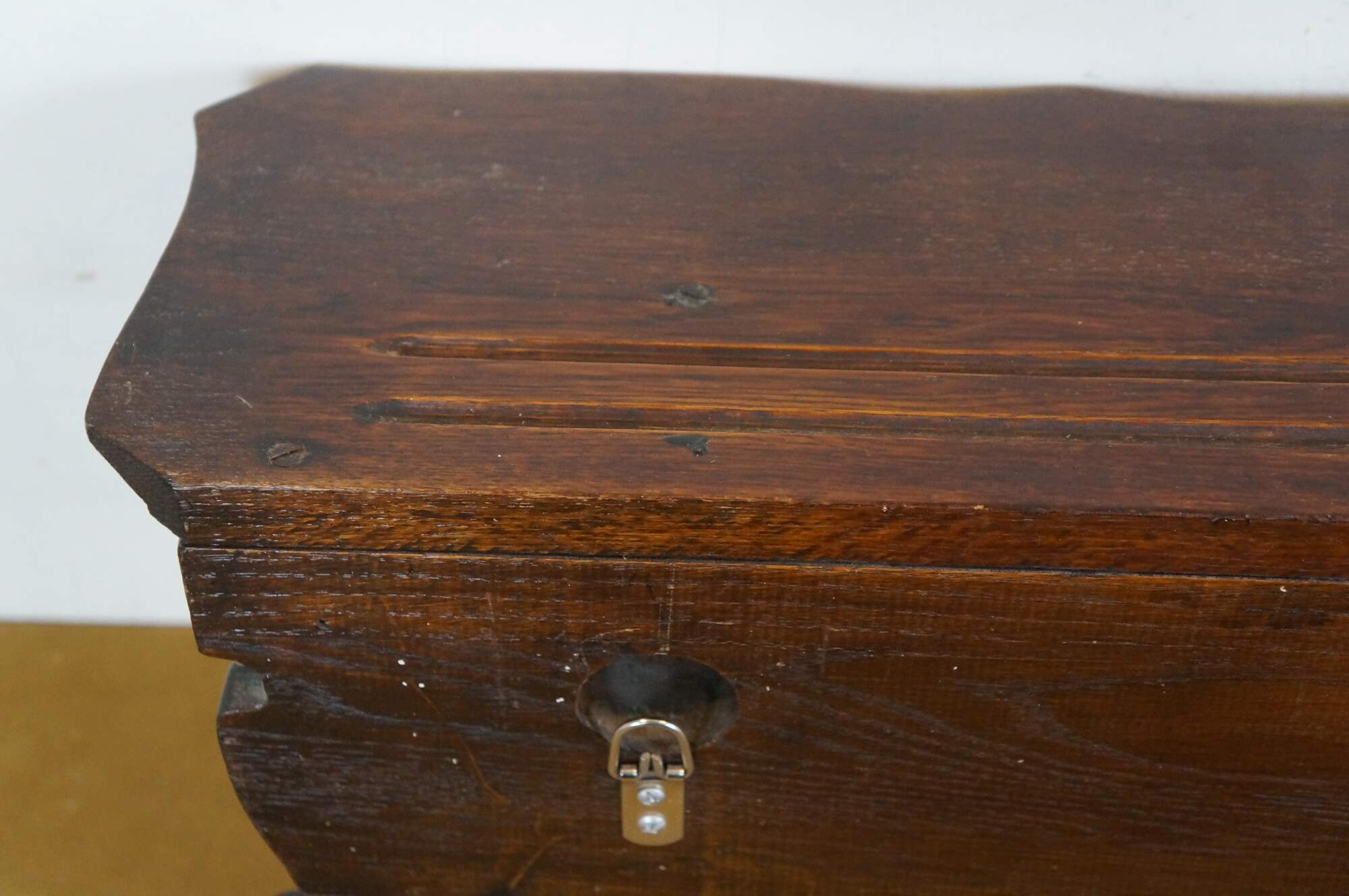 Antique carved wood wall hanging hall tree featuring seven cherub / angel / putti shaped hooks for coats / hats. Carved scene depicts a pair of hunters seated for a rest with a horn and tankard. An upper shelf with groove for displaying plates is supported with a male and female pair of carved busts.