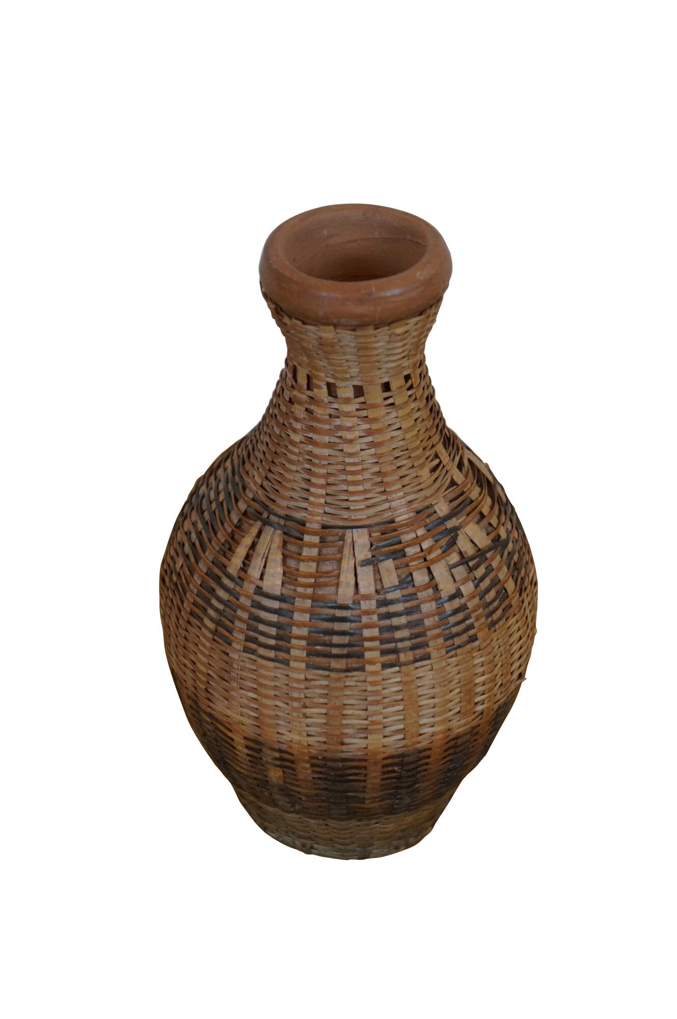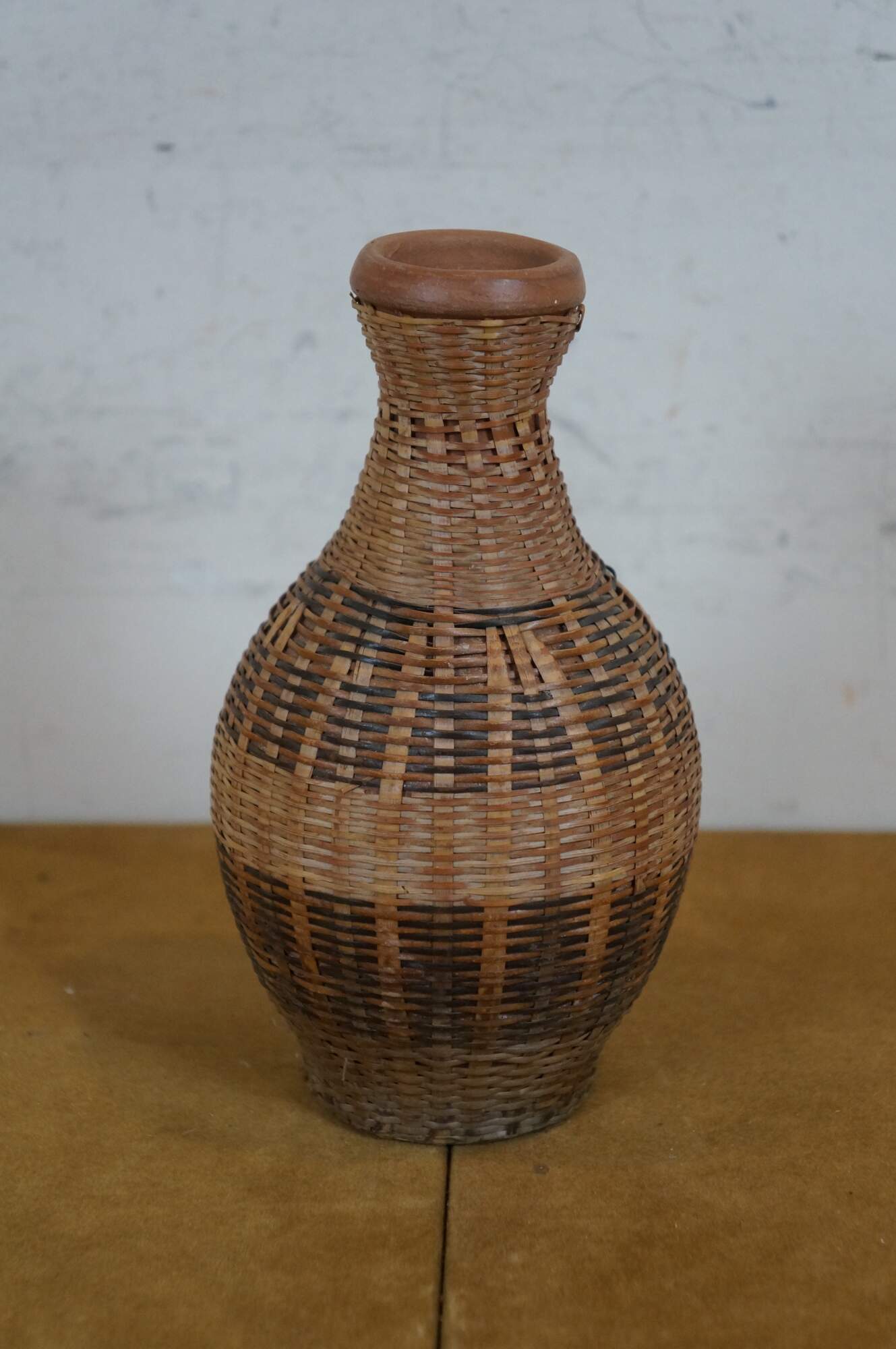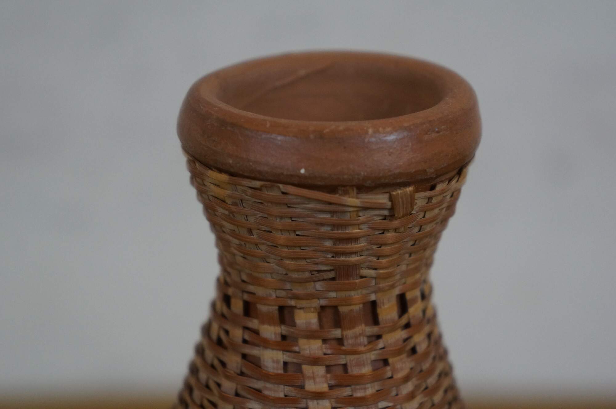 Vintage 20th-century terracotta/earthenware pottery bud vase clad in two-tone woven wicker.