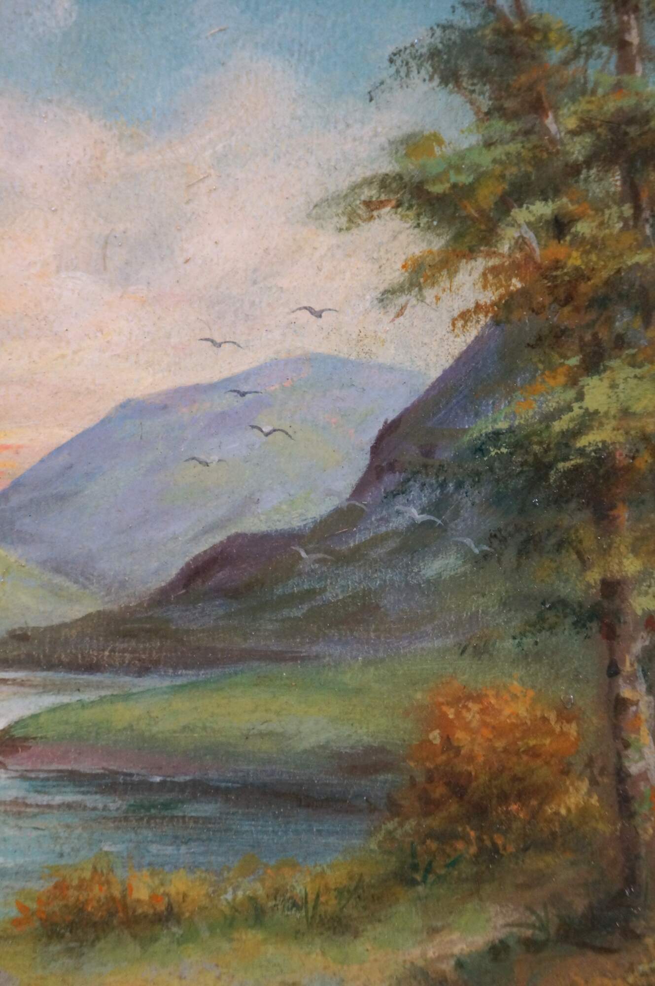 Beautiful antique mid to early 20th century oil painting on board by Gustave Gutgemon, depicting an idyllic landscape featuring a cottage by a lake at the foot of a range of mountains. Signed in lower right. Artists studio label on reverse. Beveled and foliate carved giltwood frame.
