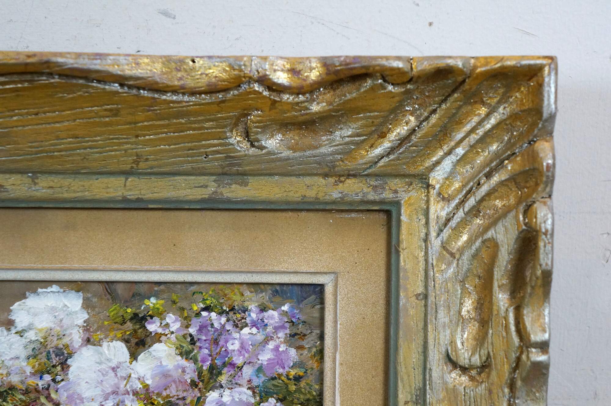 Vintage Lucia Sarto impressionist still life oil painting on canvas depicting a vase of lilacs on a table with pearls, a teacup, blue vase, sheet music and a clarinet. Signed in lower left corner. Carved / beveled champagne giltwood frame.