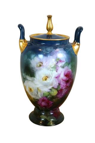 Late 19th to early 20th century Rosenthal porcelain urn. Hand painted with pink and white roses on a blue and green background, features lid with tall finial and two raised handles trimmed with gold. Marked used circa 1891-1906. Painted in Wein Bavaria German.