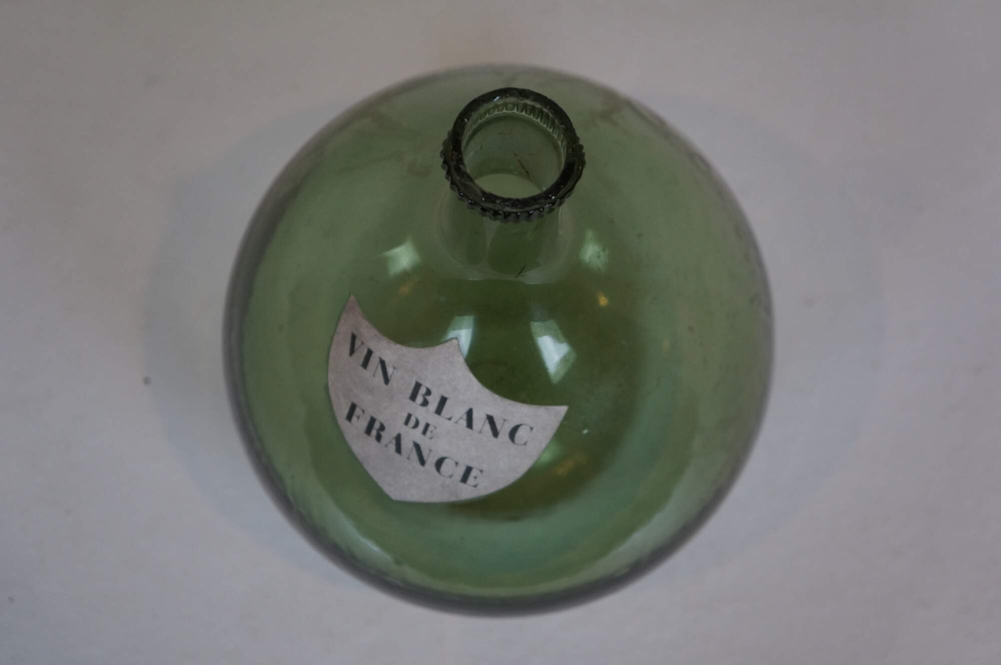 Early 20th century balloon shaped French demijohn / wine bottle / jug. Green glass with shield shaped paper label reading "Vin Blanc de France.